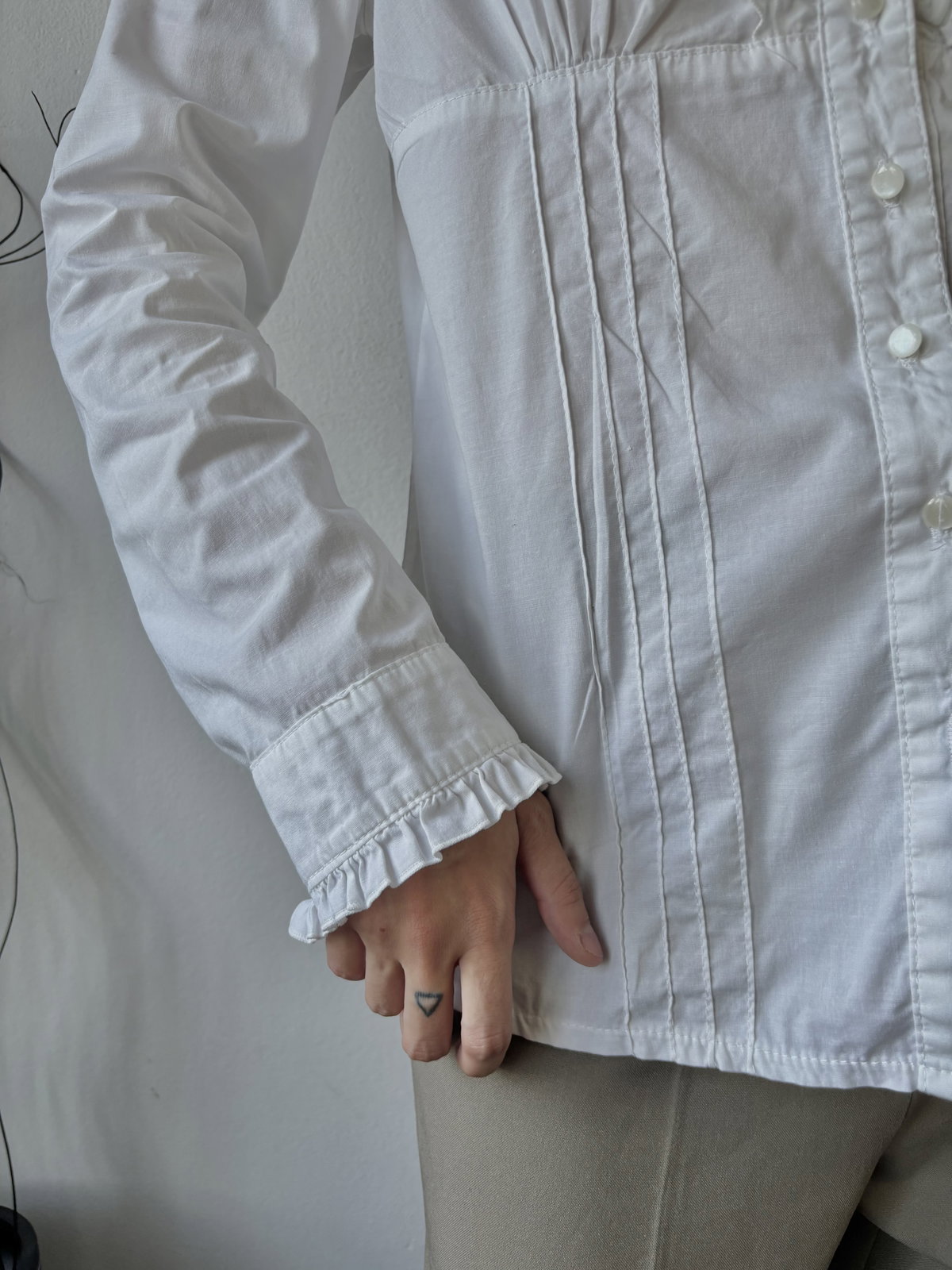 Camisa blanca con volados en la parte delantera y en la terminacion de las mangas, escote en V.