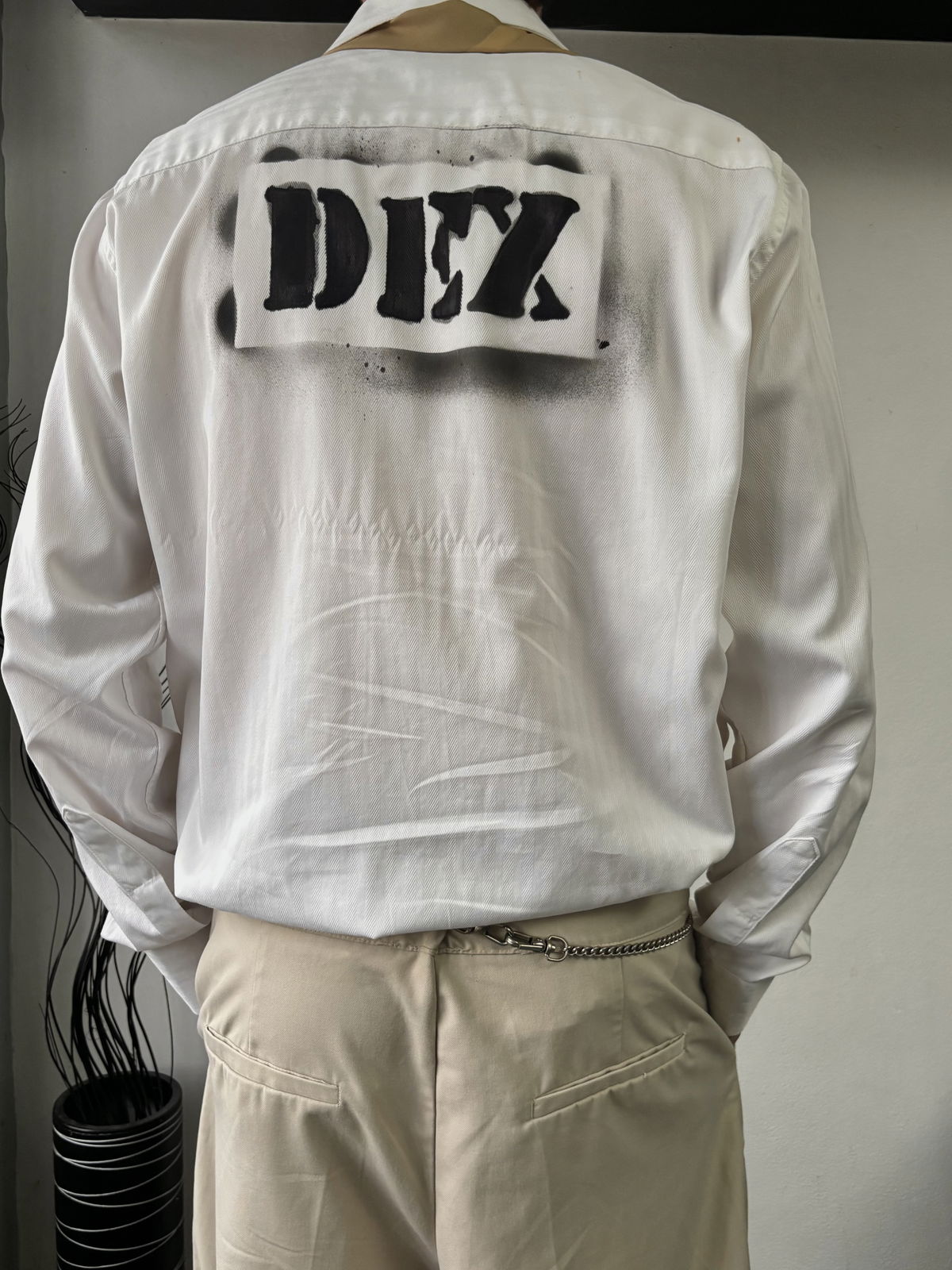 Camisa DEX color blanco, tela tramada y corte clásico, taggeada con aerosol de manera artesanal en la espalda. Talle M/L