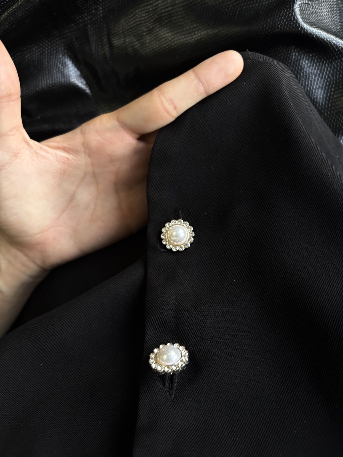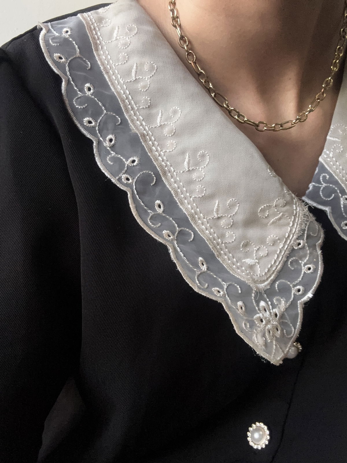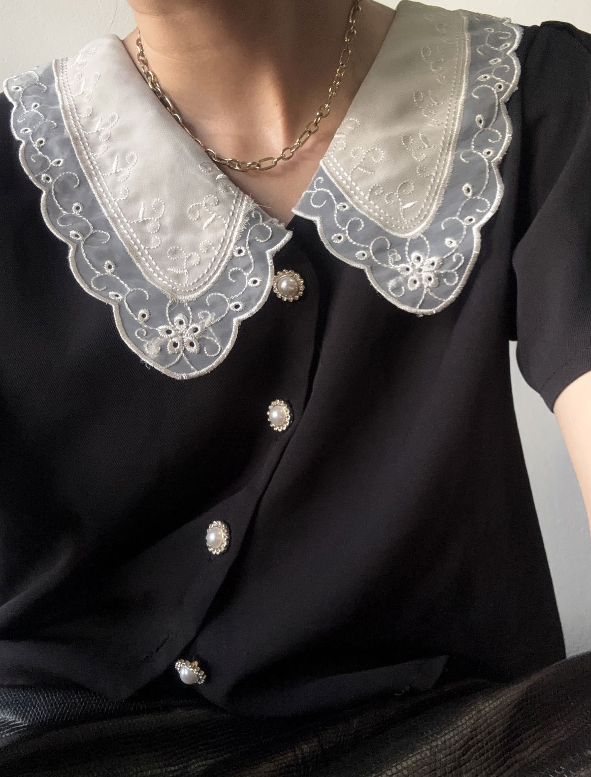 Camisa manga corta a la cintura, con cuello blanco con encaje y botones de flores brillosos y perlados. Súper romántica y liviana, no se transparenta. Talle M
