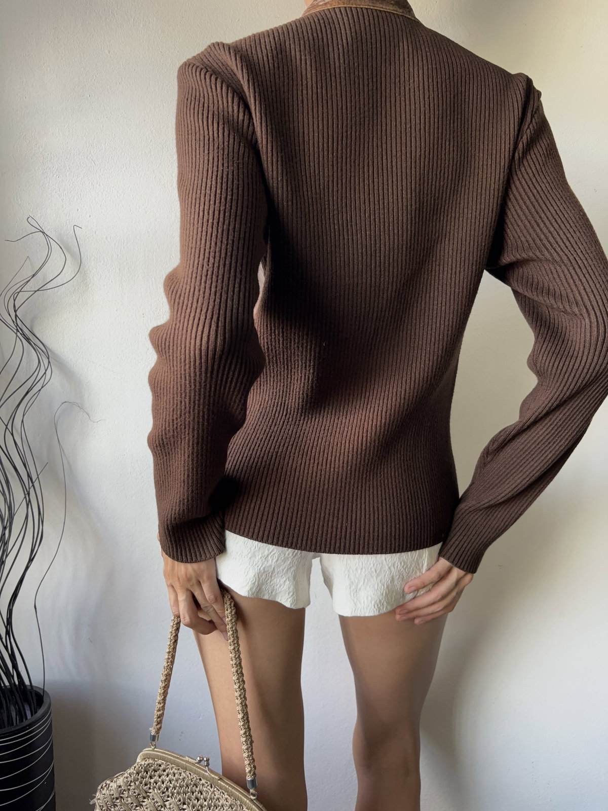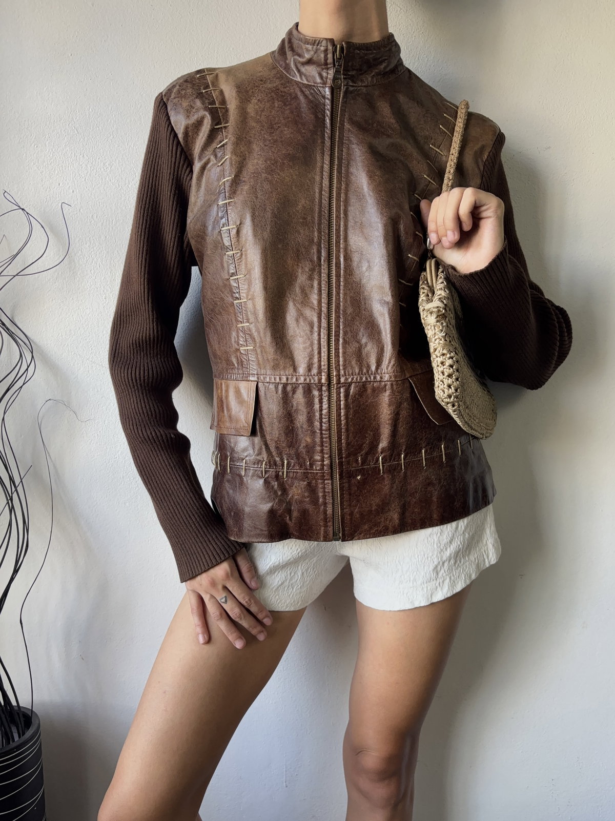 Campera marca Attitude de ecocuero con mangas y espalda tejida estilo suéter (no pica), trenzado en el frente y bolsillos no reales. Talle S/M