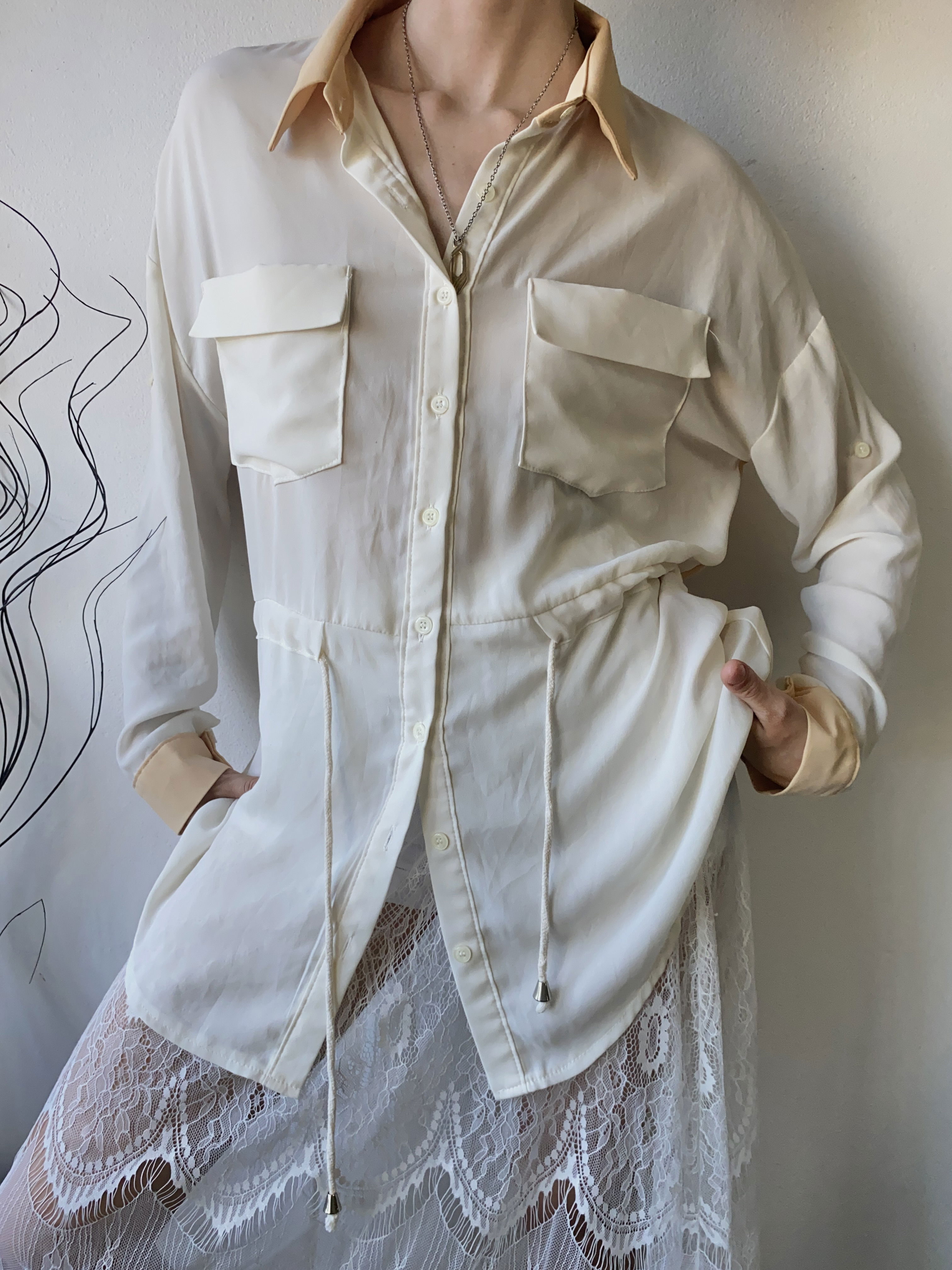 Camisa color crema y anaranjado, bolsillos no reales y cordón para ajustar en la cintura. Súper fresca y liviana
