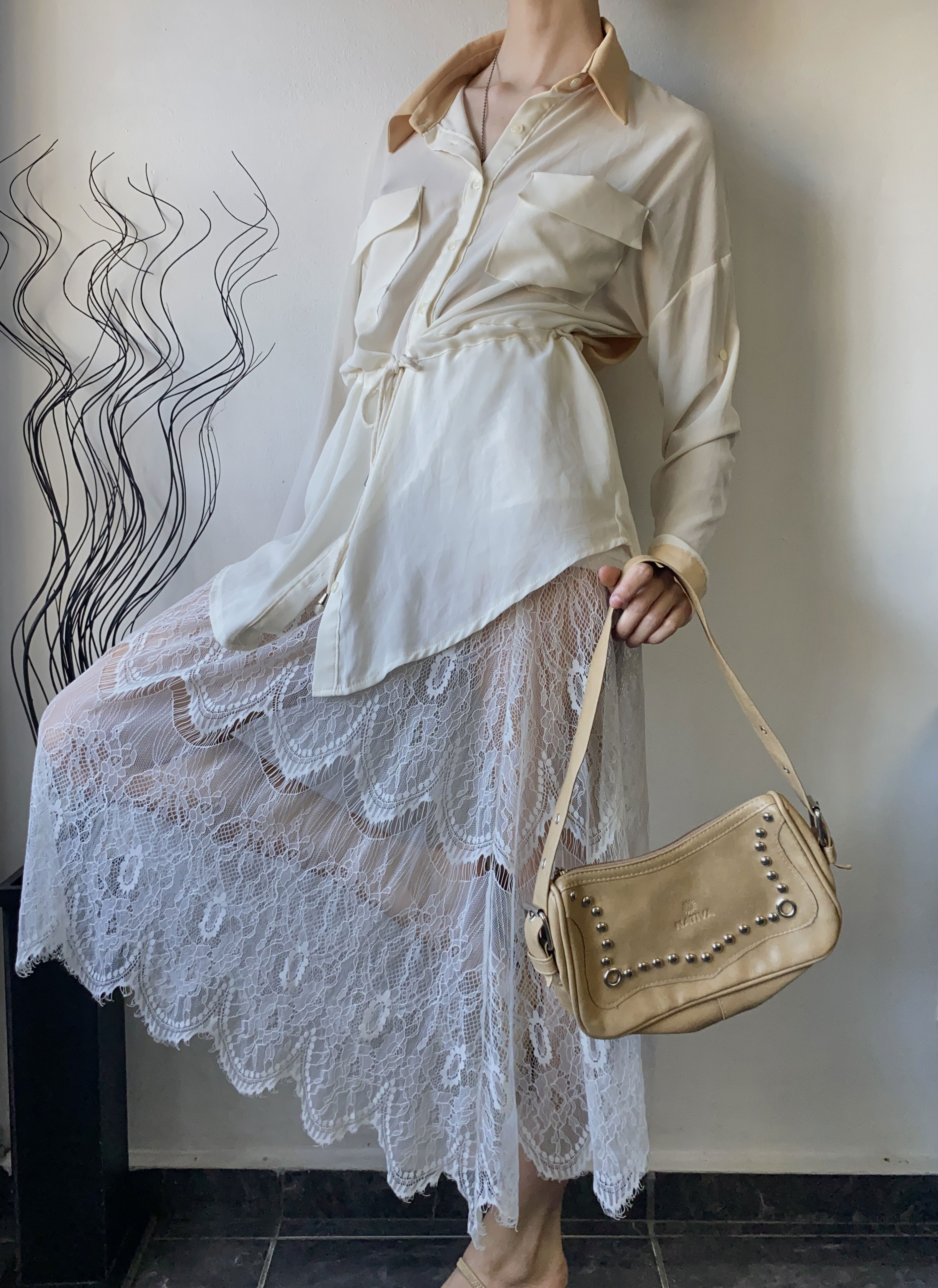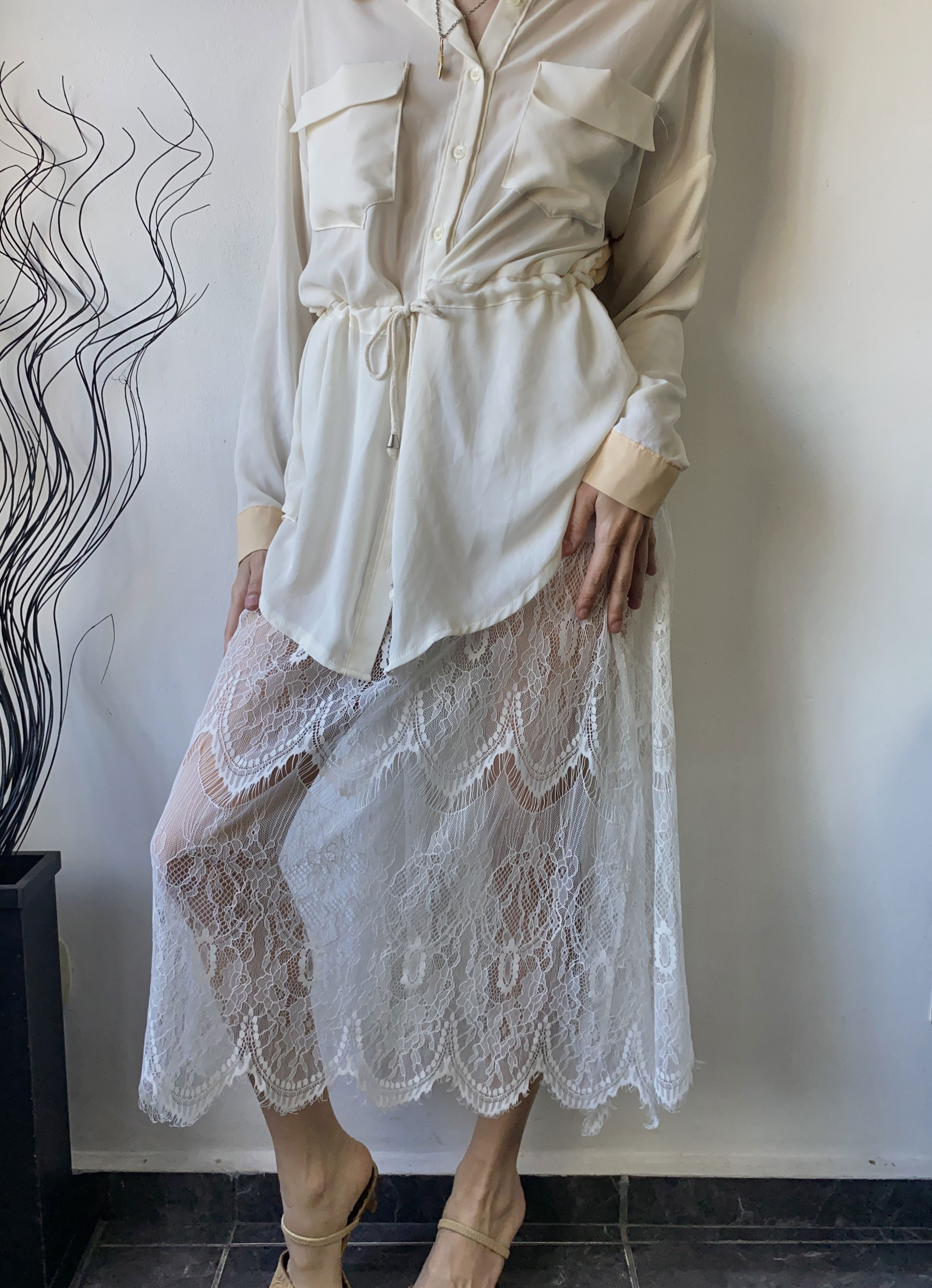 Pollera de encaje color blanco con terminación en picos, con cintura elastizada (cede hasta un talle 3) y sin forro. Impecable, es realmente hermosa.