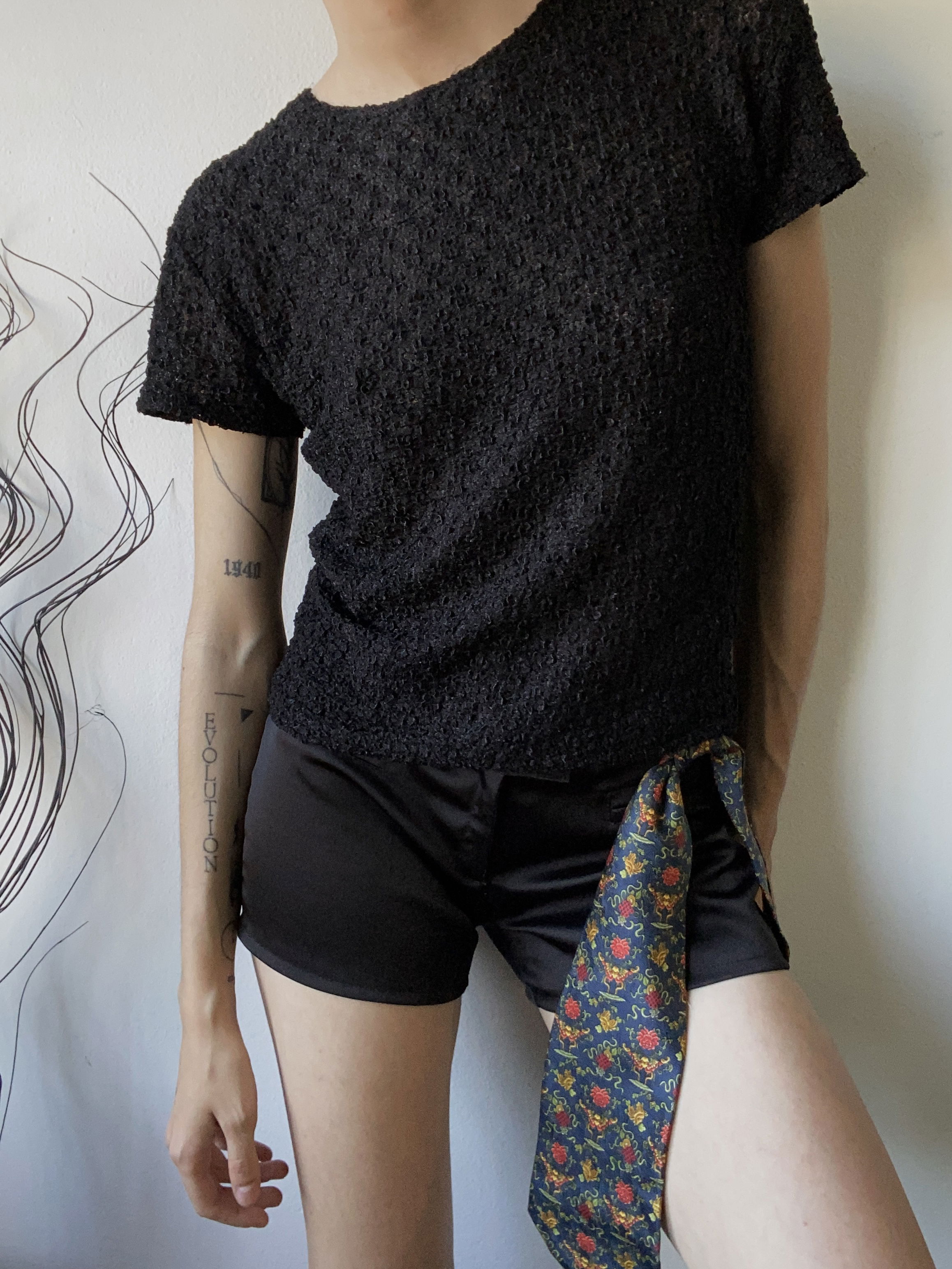 Remera de tela labrada color negro, manga corta al cuerpo, talle S