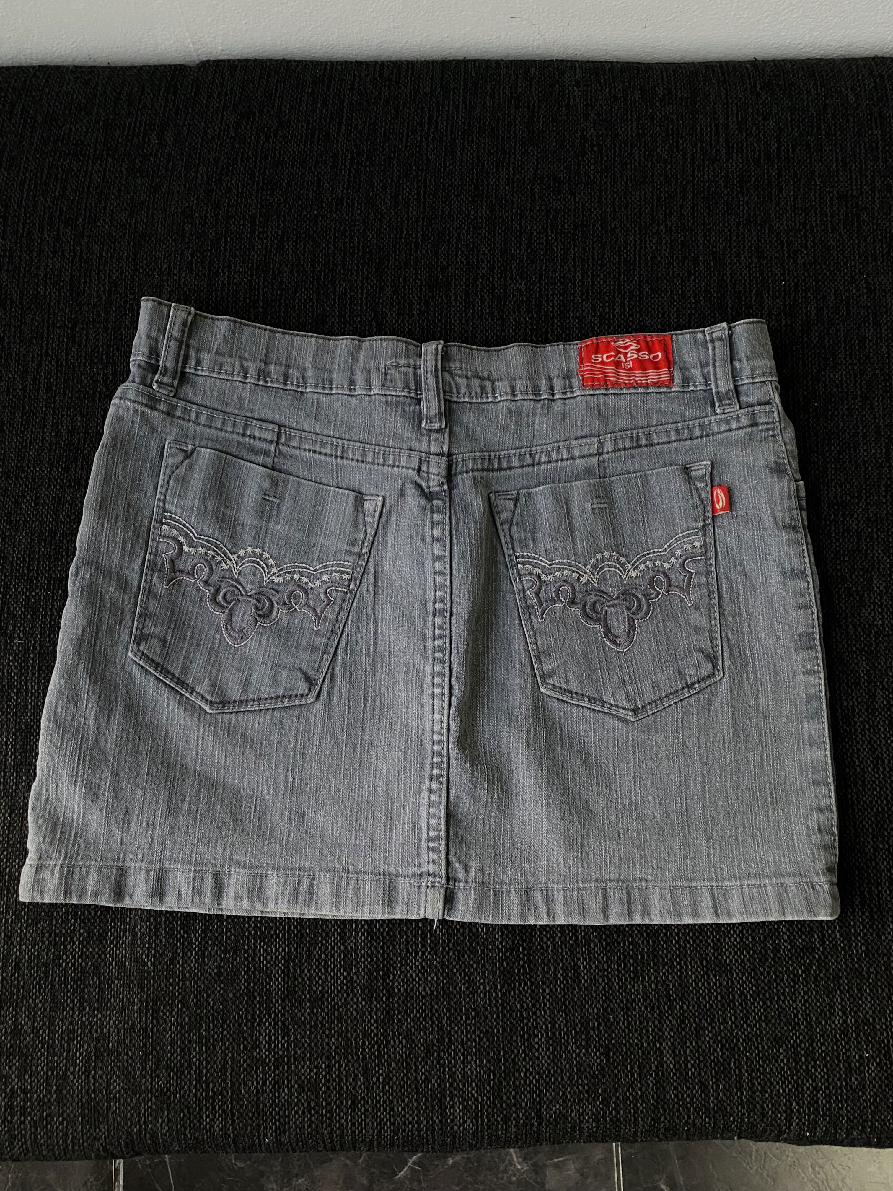 Pollera de jean color gris claro, con doble bolsillo en la parte trasera y bordados. Pasacinto, talle 36 elastizada