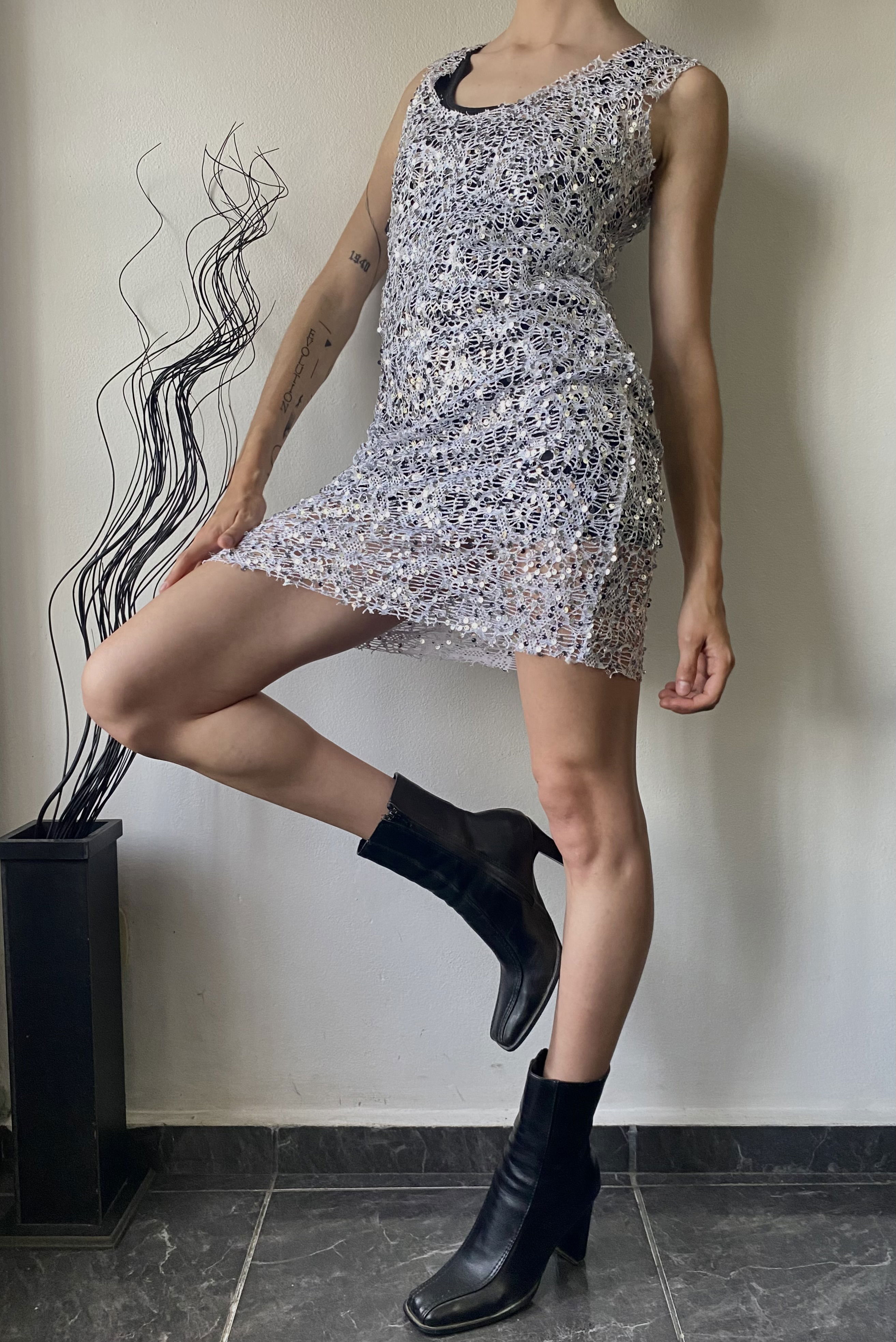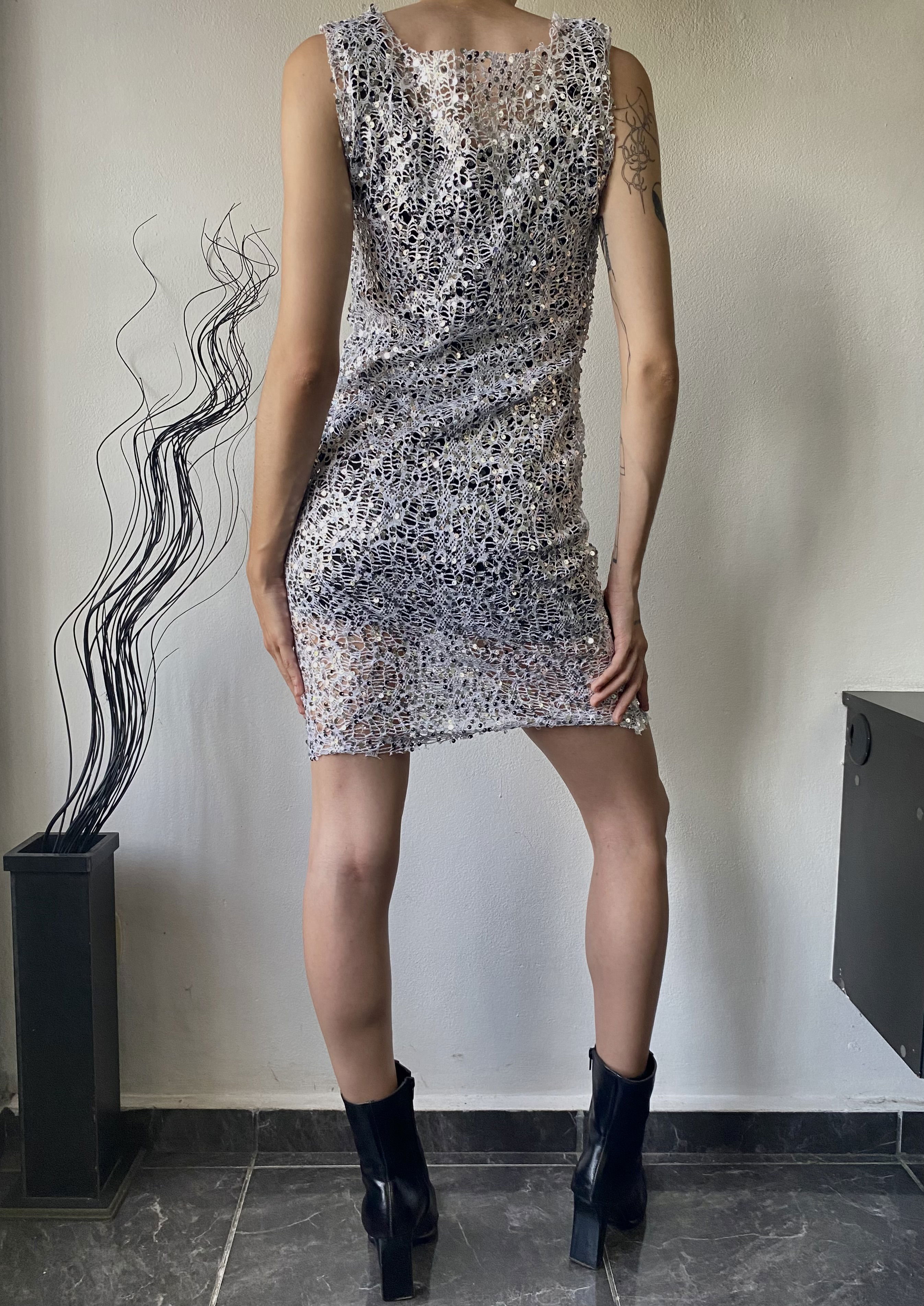 Vesitdo de hilo color blanco con todo lentejuelas en plateado, brilla un montón. Talle M elatizado