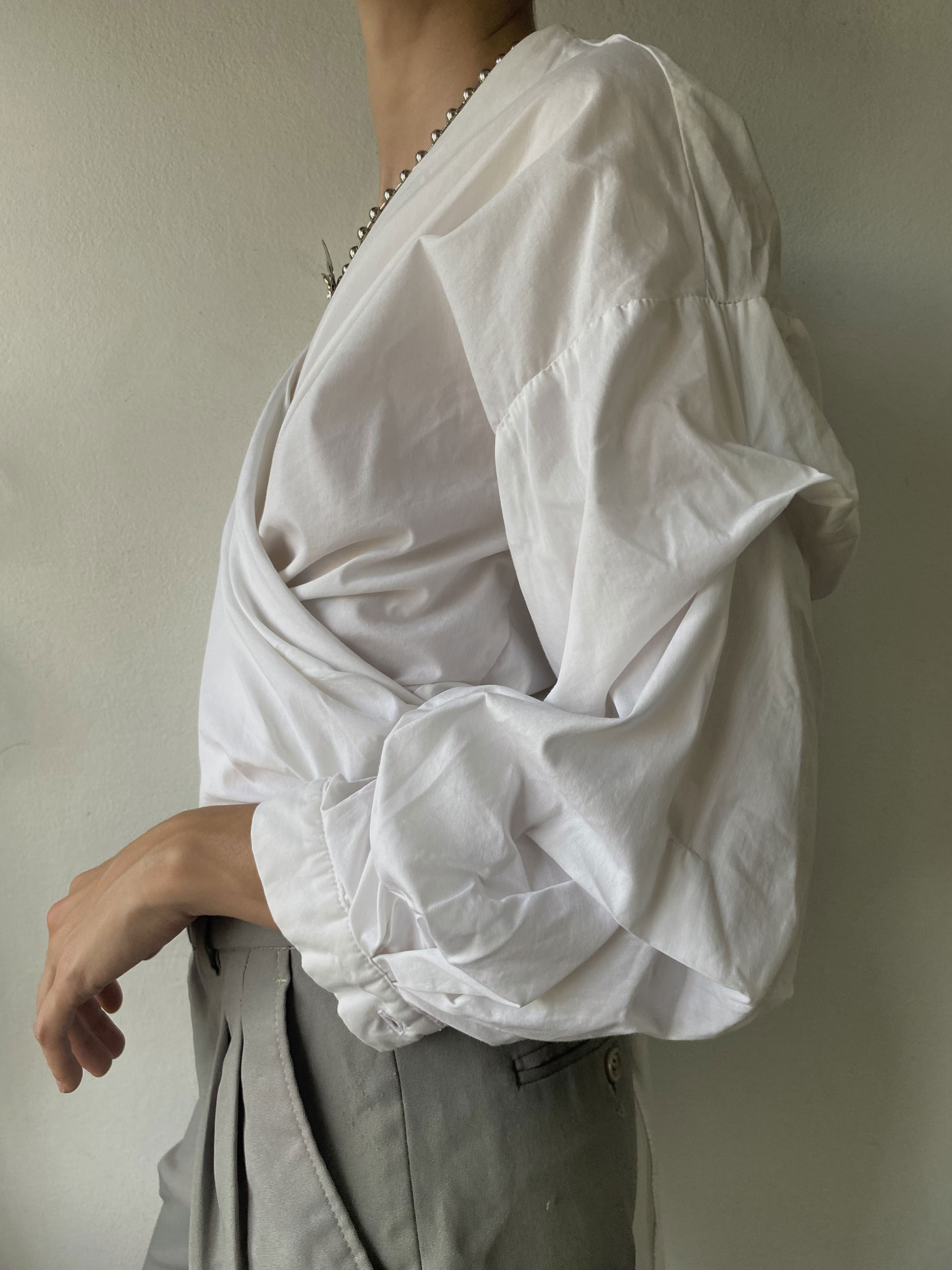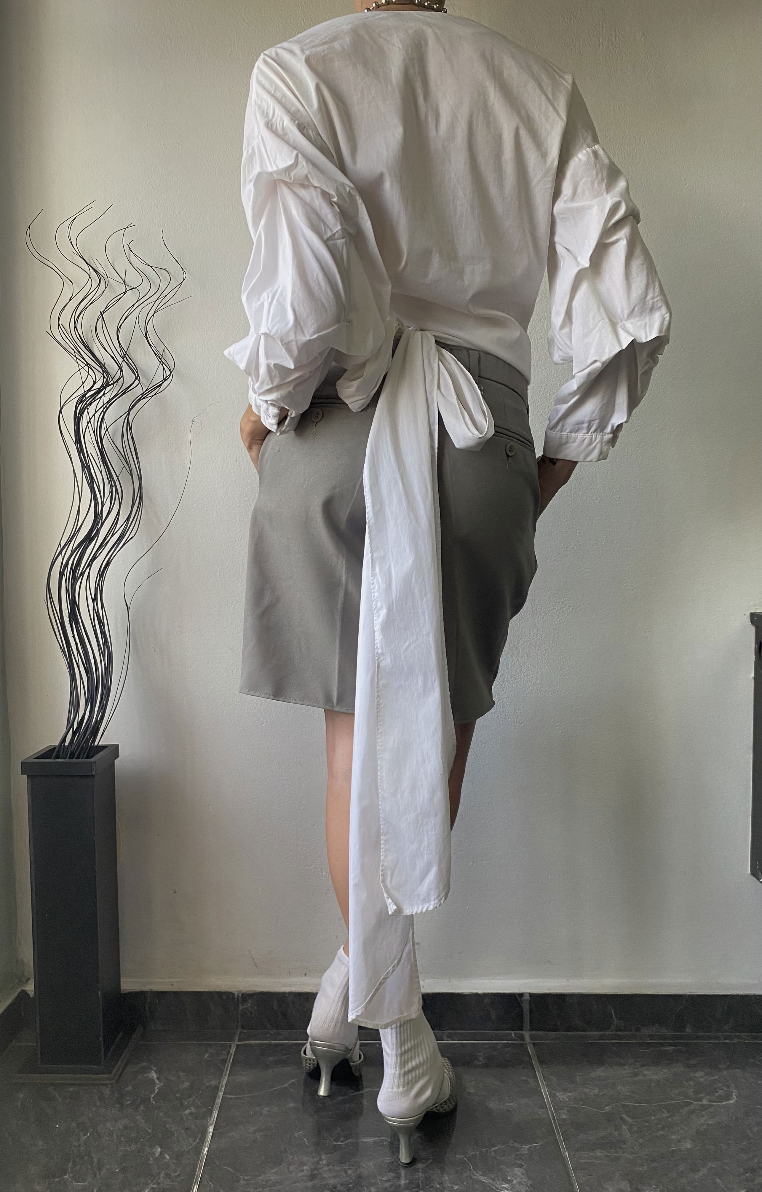 Blusa tipo camisa, se ajusta a medida con doble tira que se puede atar de diferentes formas (moño trasero como en la foto), con mangas en frunce.