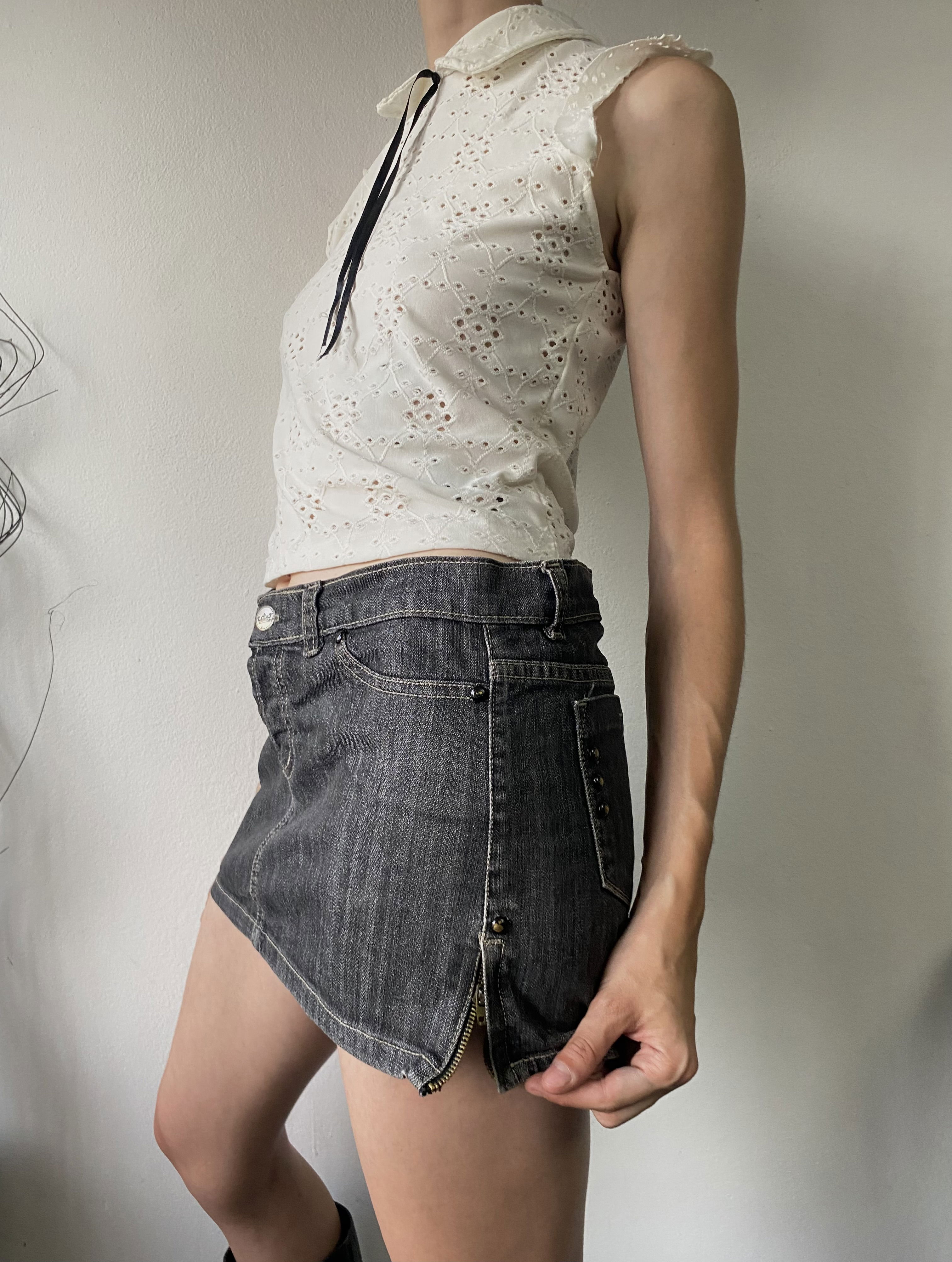 Pollera mini de jean, color gris oscuro con mini cierres a los costados, pasacinto y doble bolsillo en la parte trasera. Talle 38, tiro bajo.