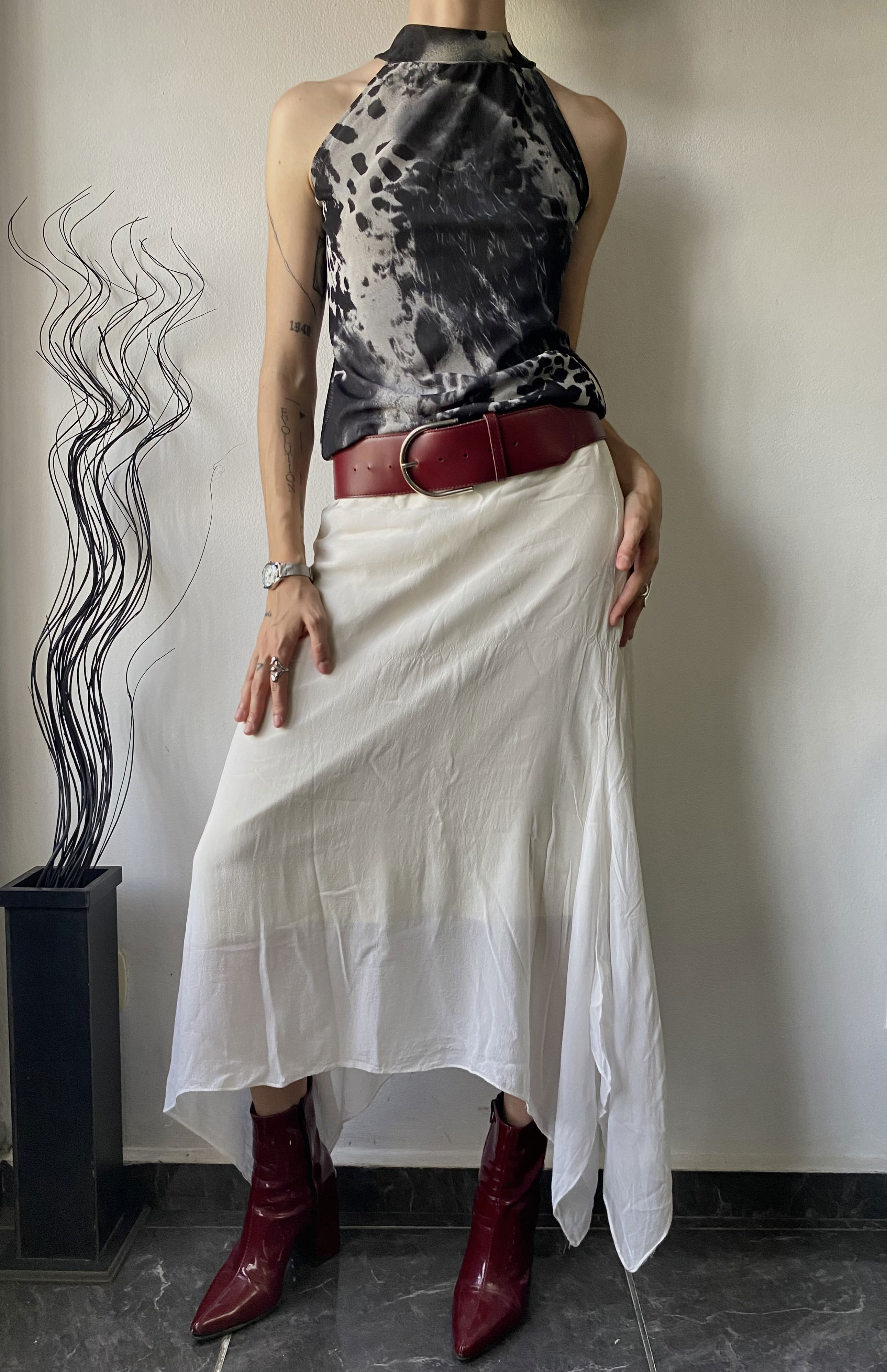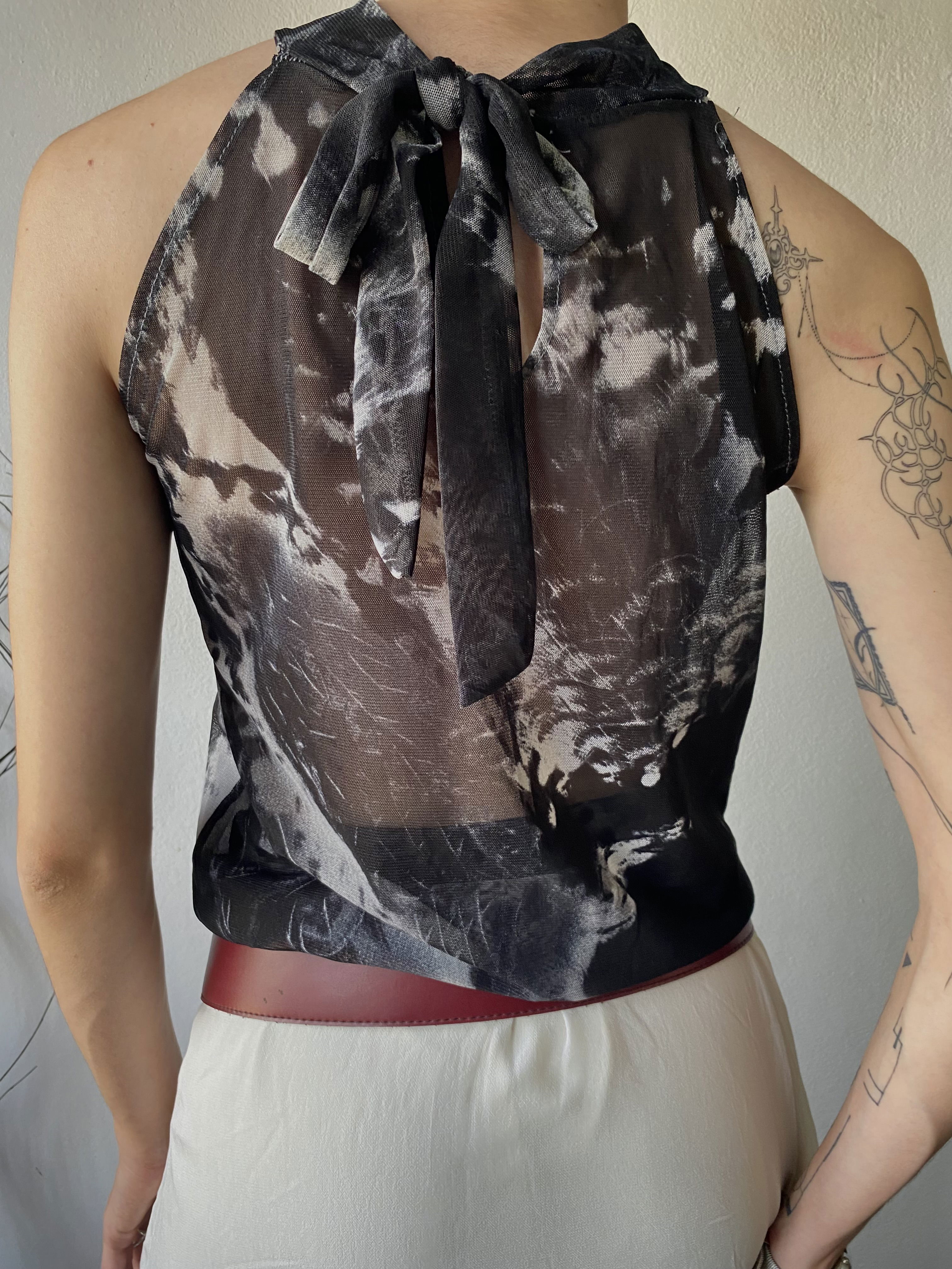Blusa de cuello alto, estampado de tigre color gris, se ata al cuello en la espalda. Forrada en la parte delantera (no se transparenta) y transparente atras. Elastico en cintura.