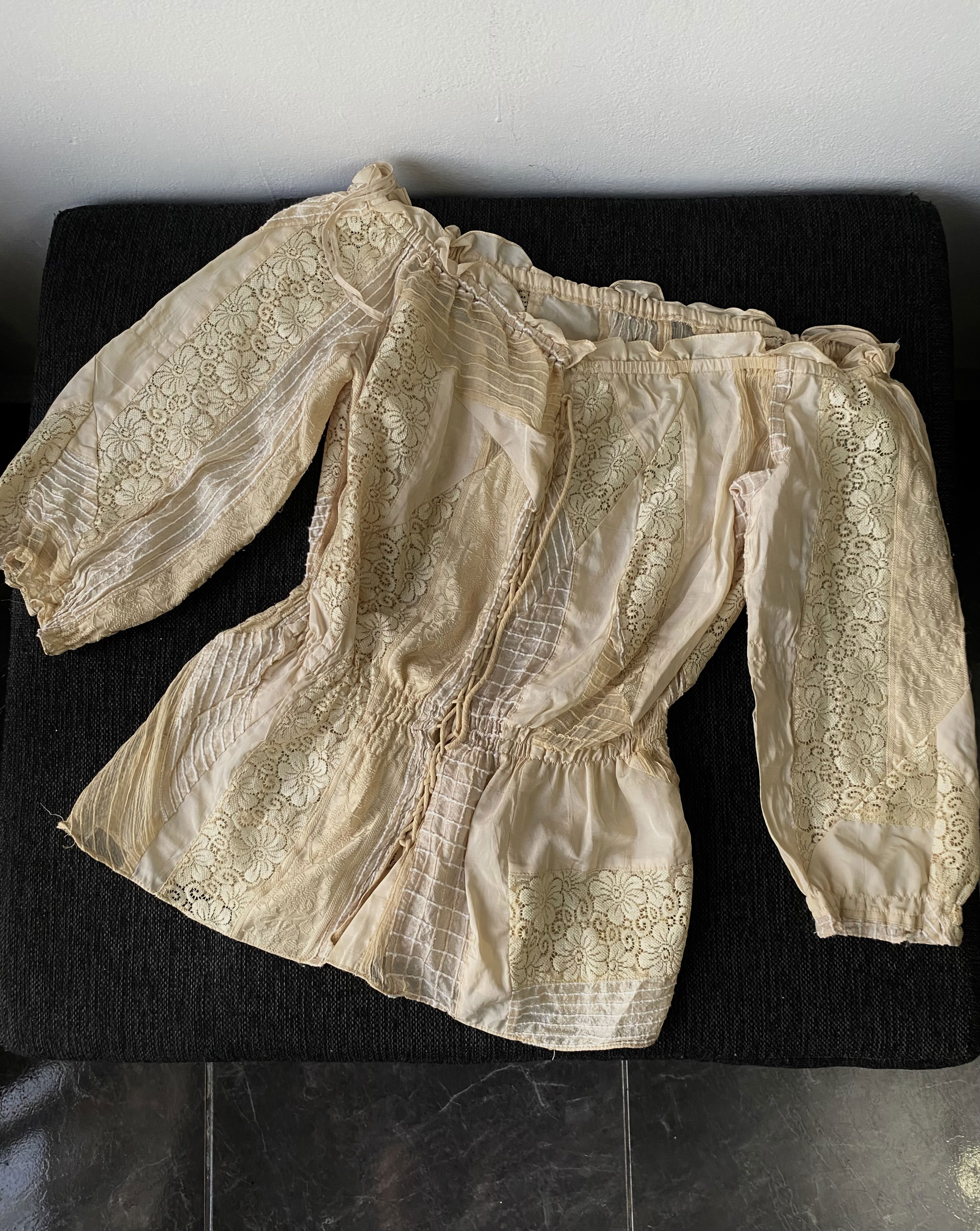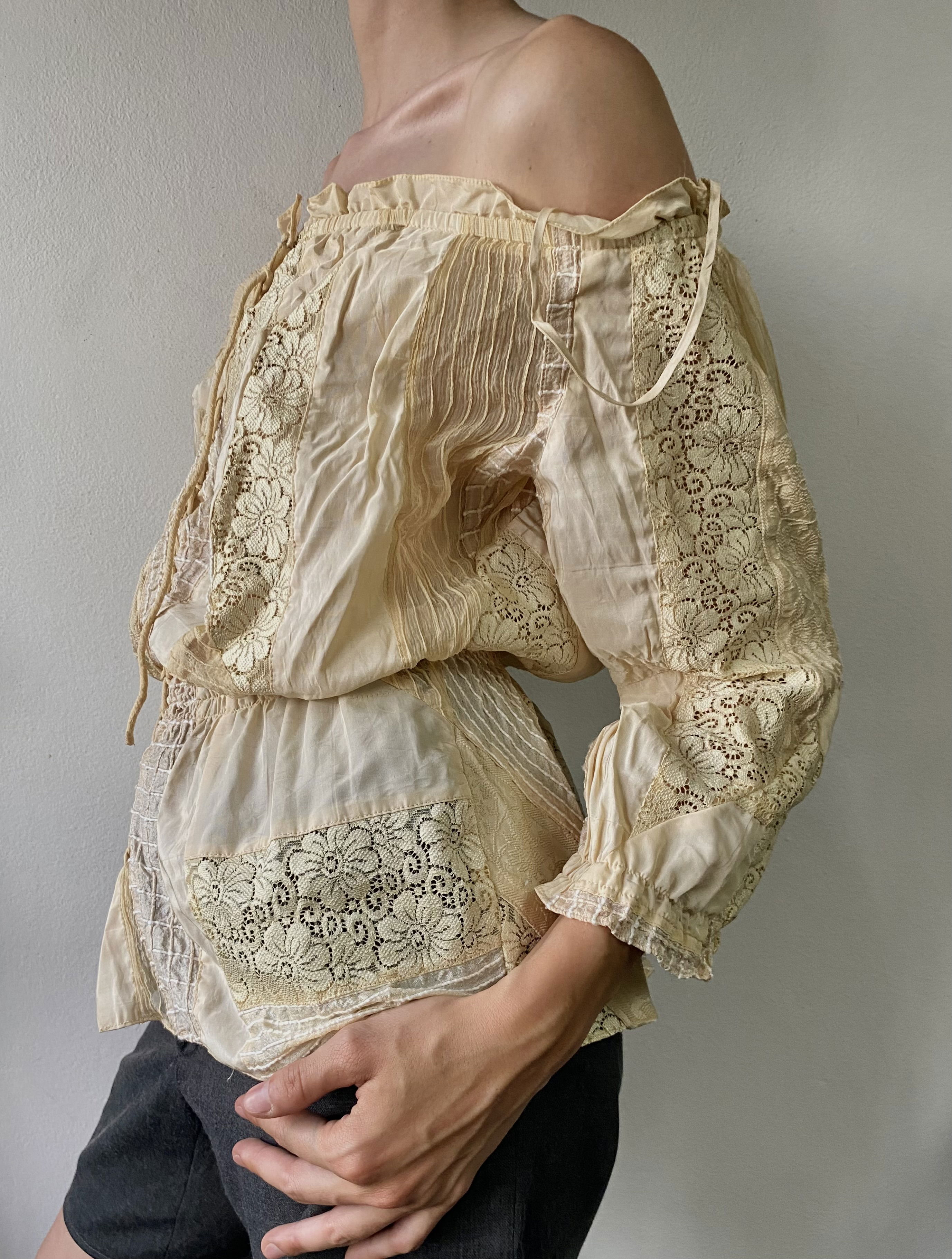Blusa color crema, con elastico en los hombros, cintura y mangas, toda trabajada con detalles en distintas telas y encaje, cordón en la parte delantera.
