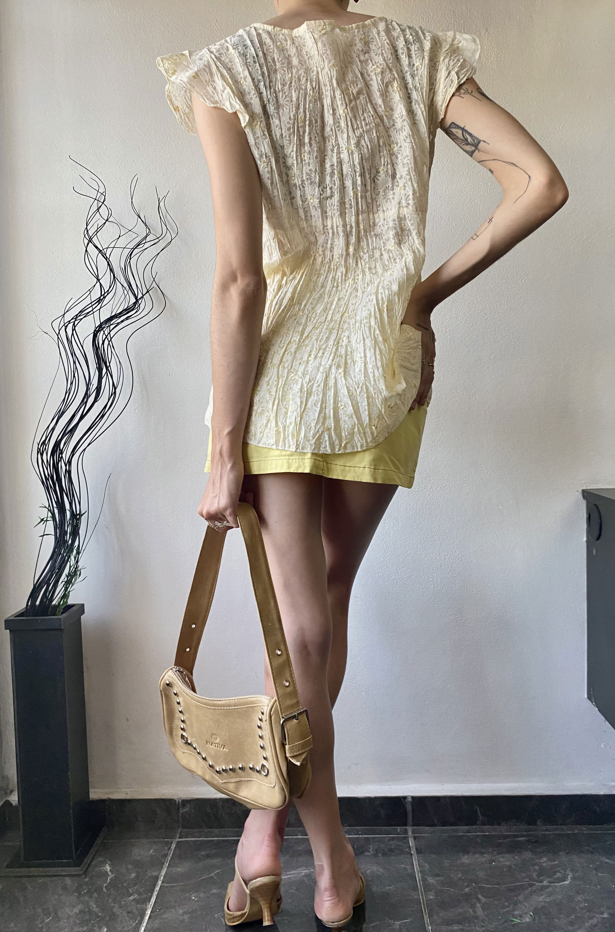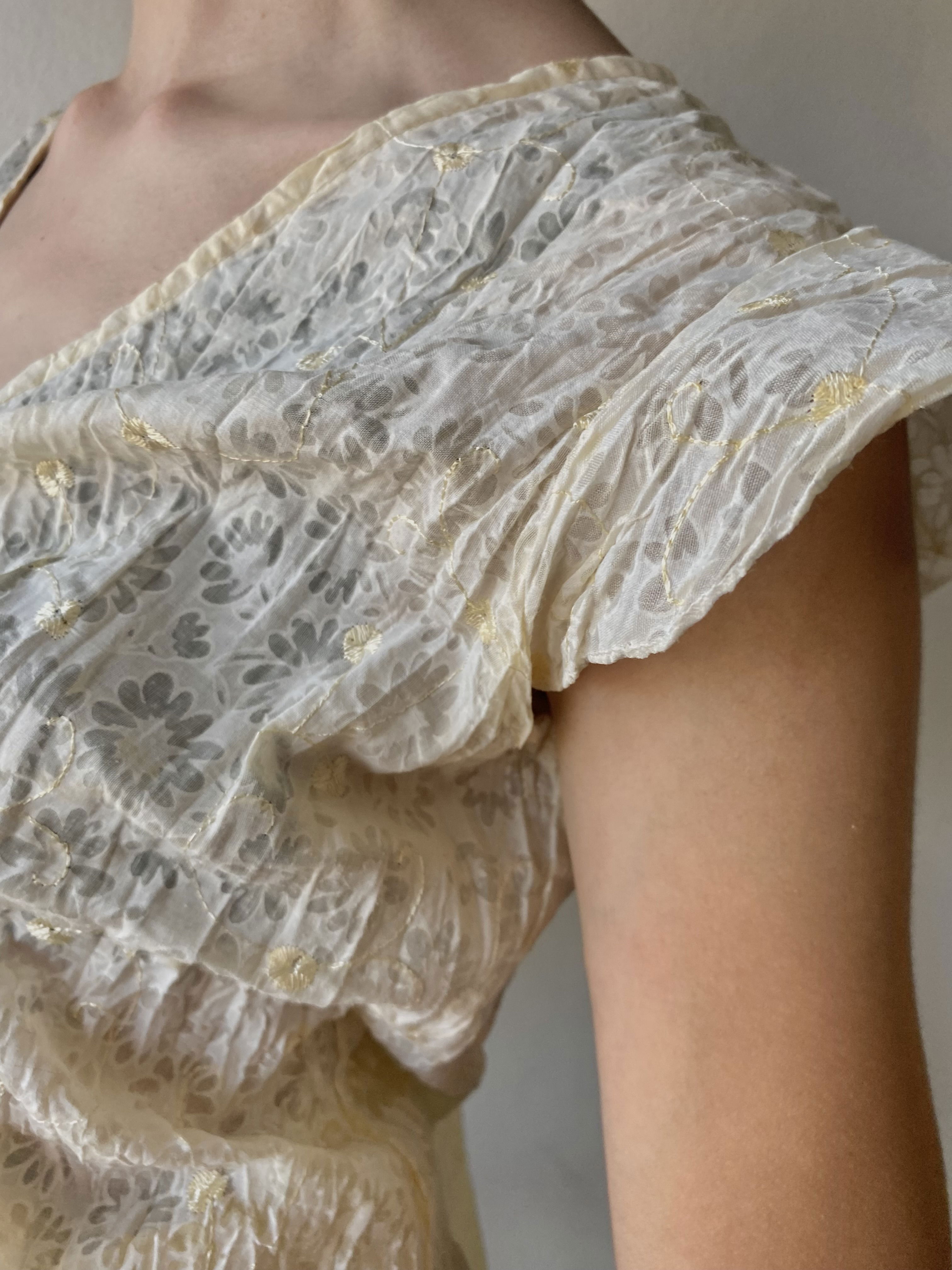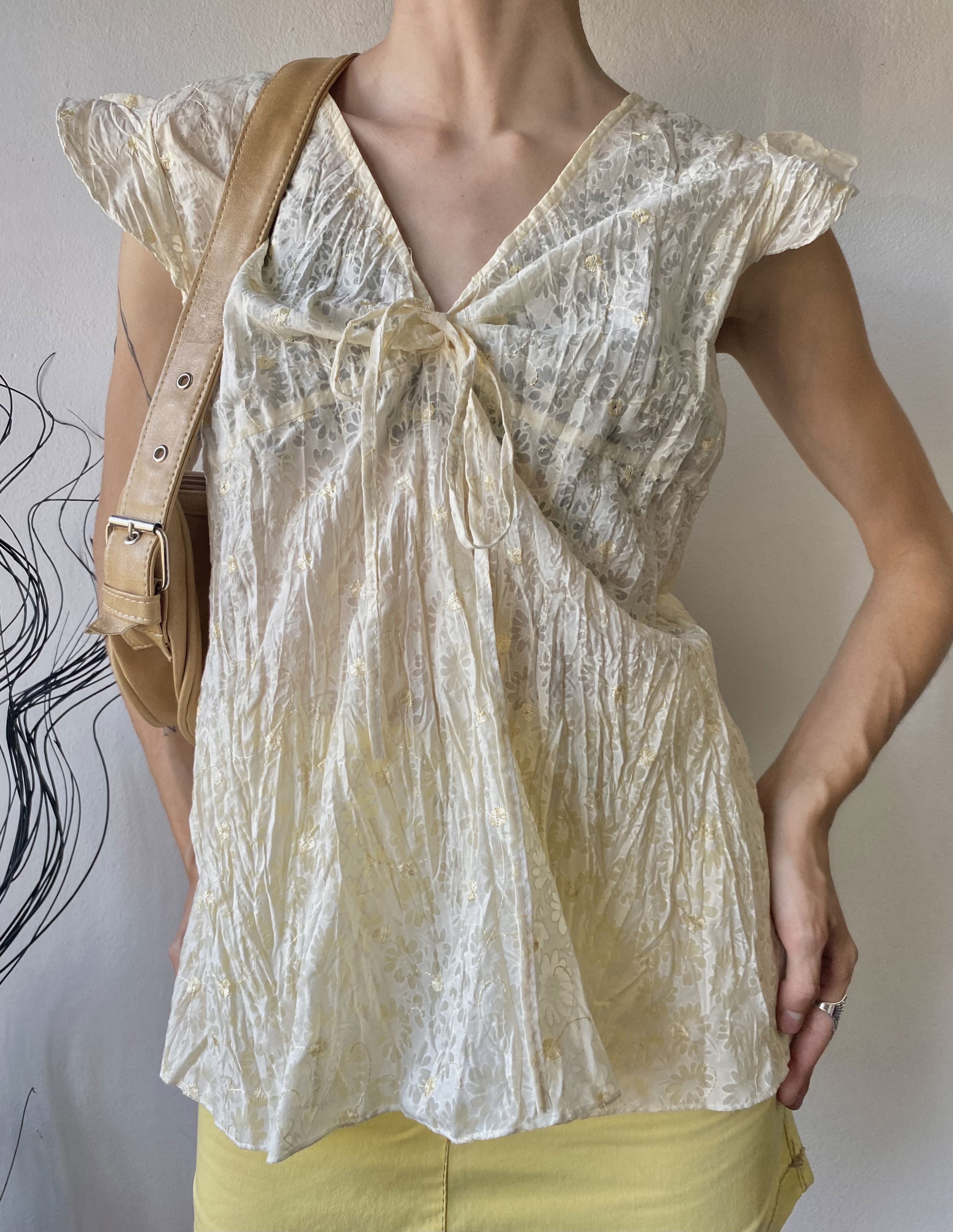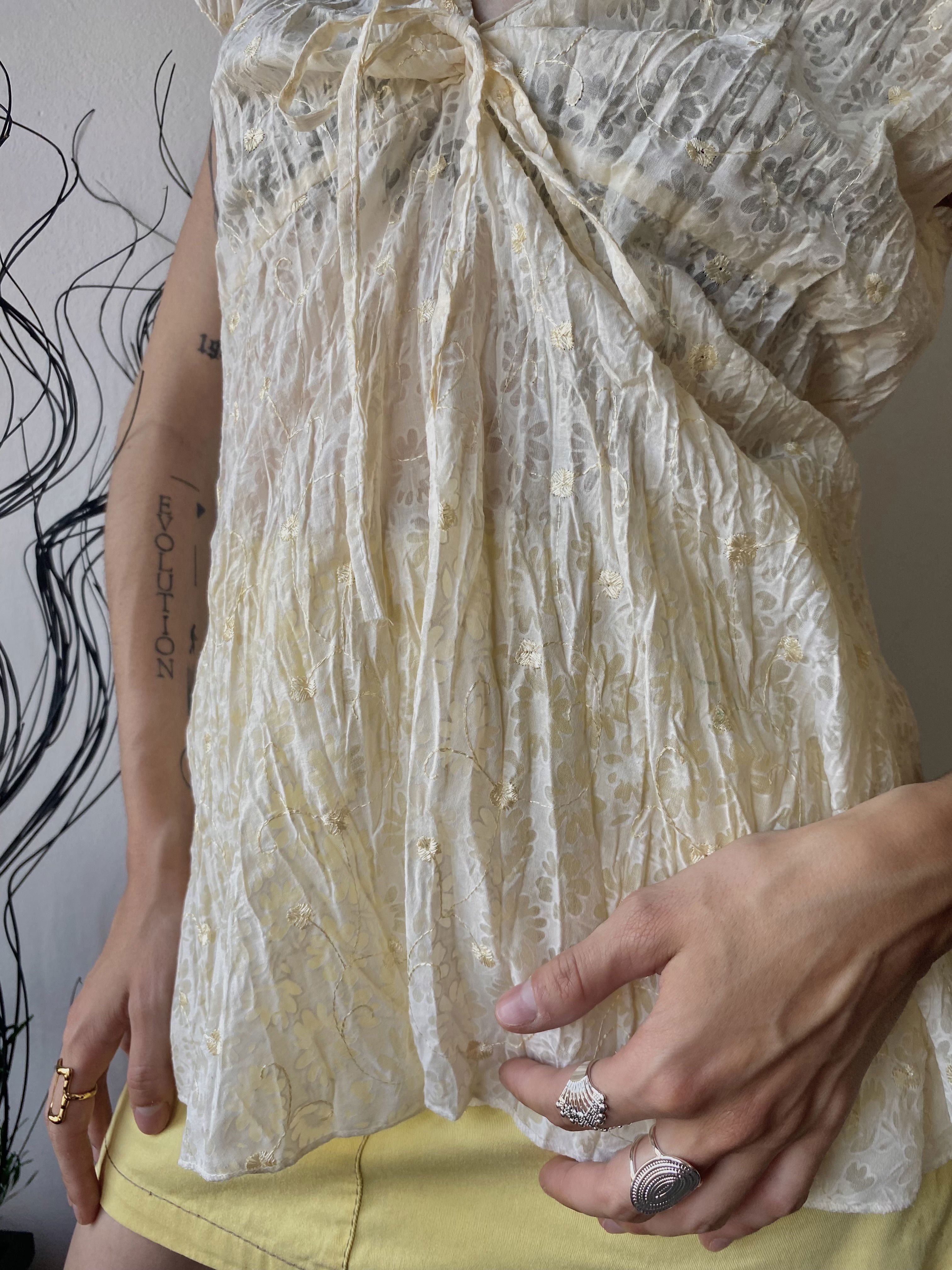 Blusa toda bordada con florcitas, media amarilla/crema con laso para hacer moño en el frente. Súper fresca y liviana, talle M/L