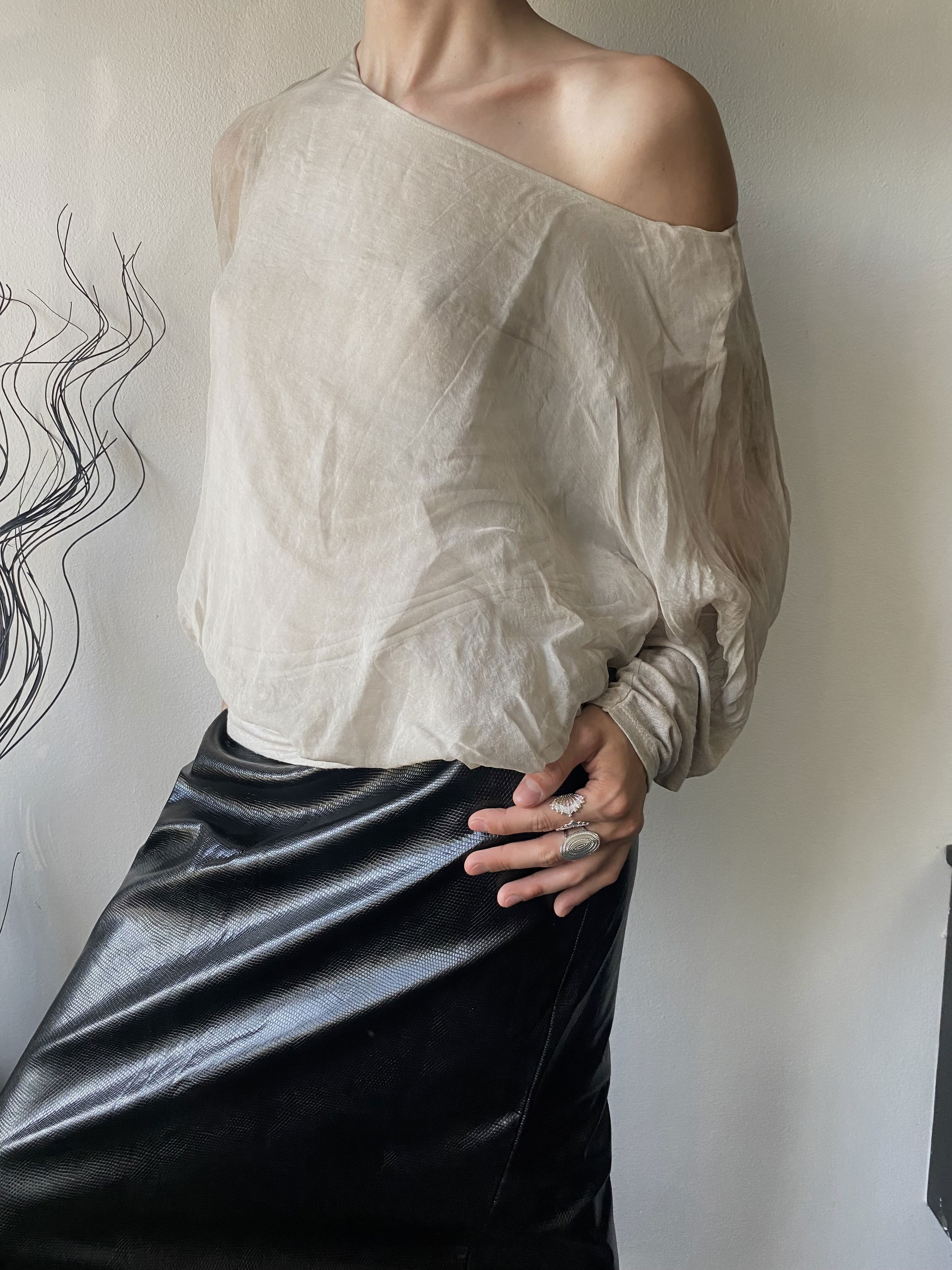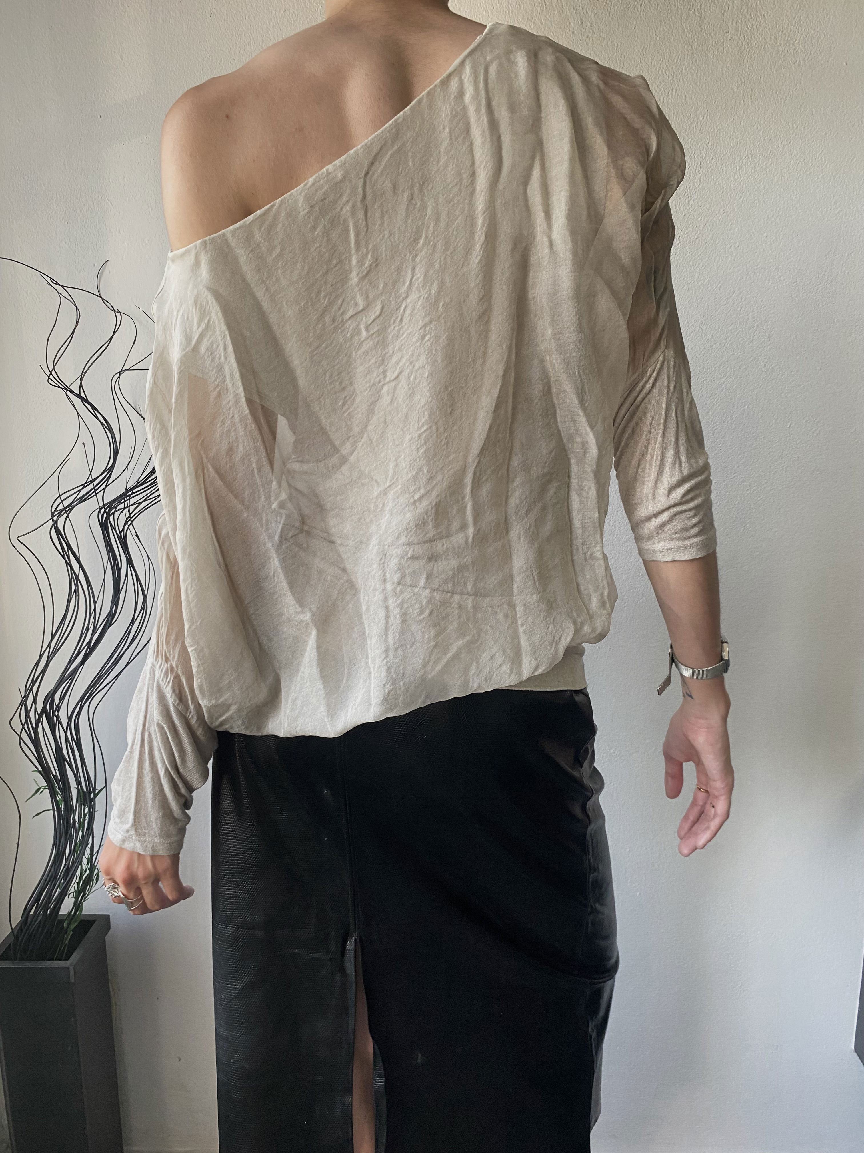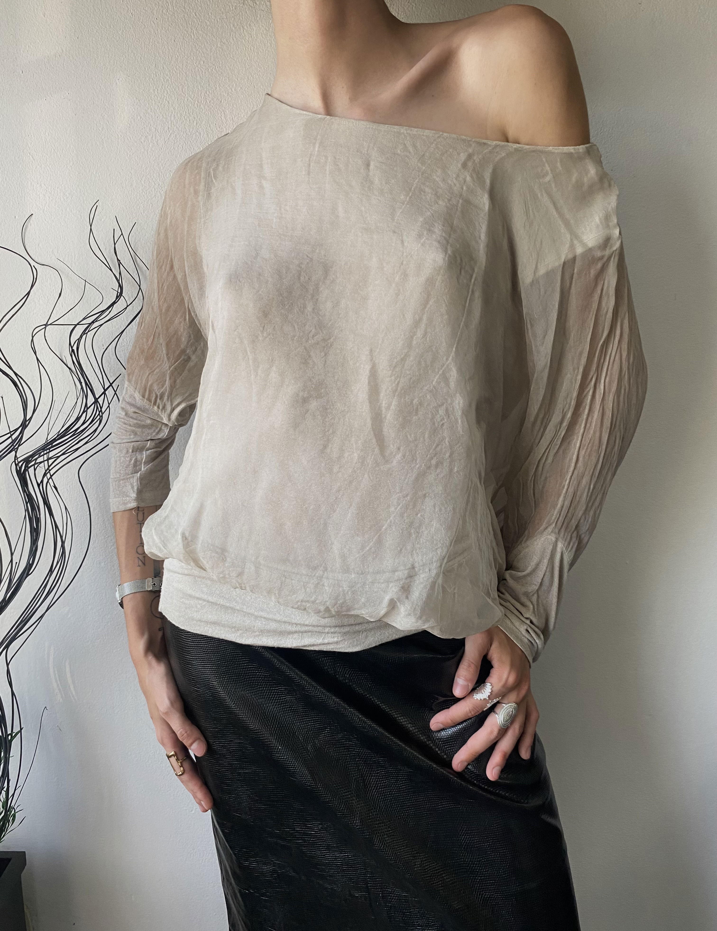 Blusa color beige, estilo 2000s con elastico de algodón en la cintura y mangas, pequeño detalle metálico de la marca y transparente solo en las mangas. Trae como una "musculosa" por debajo de la tela transparente. Talle M