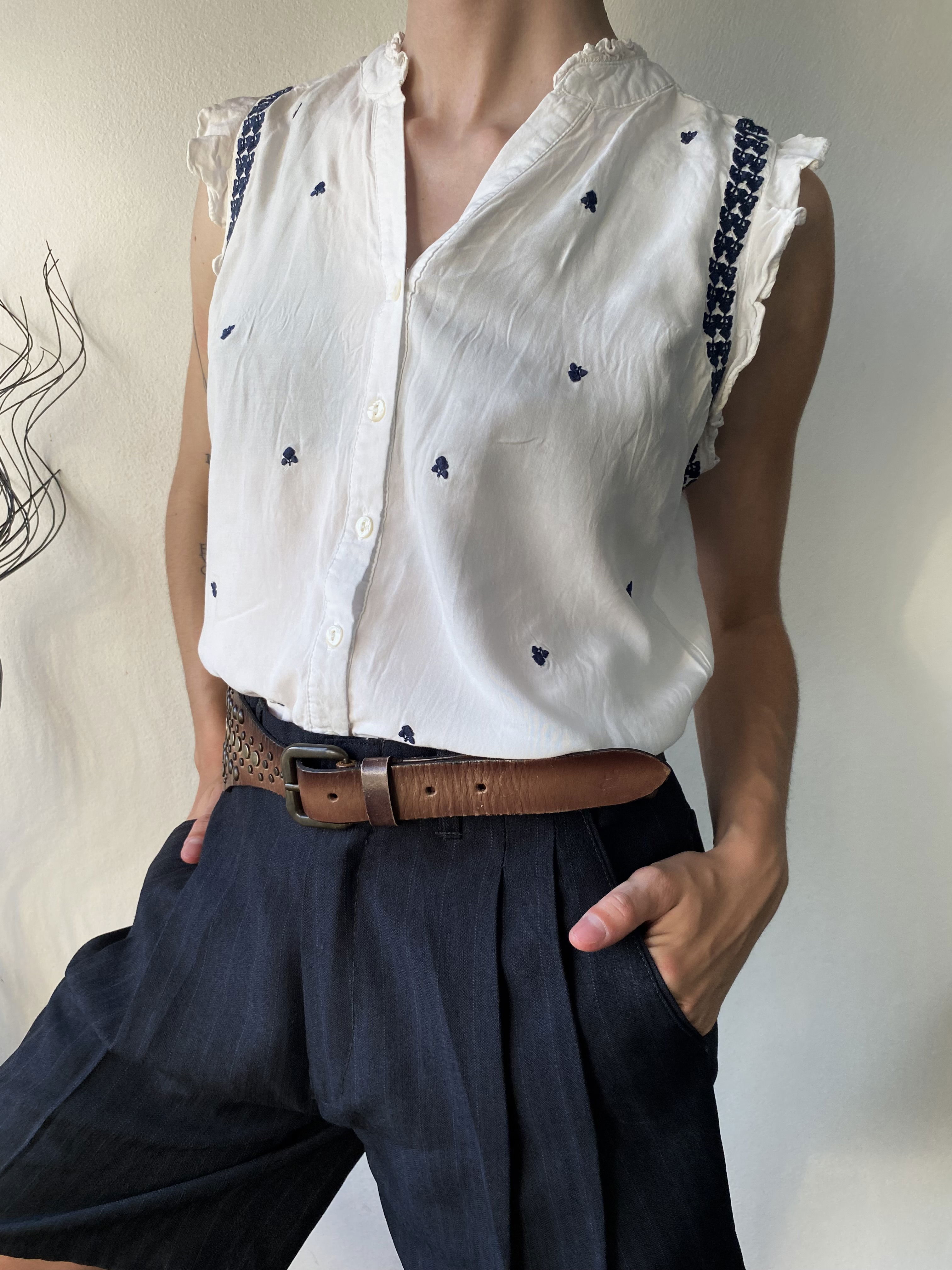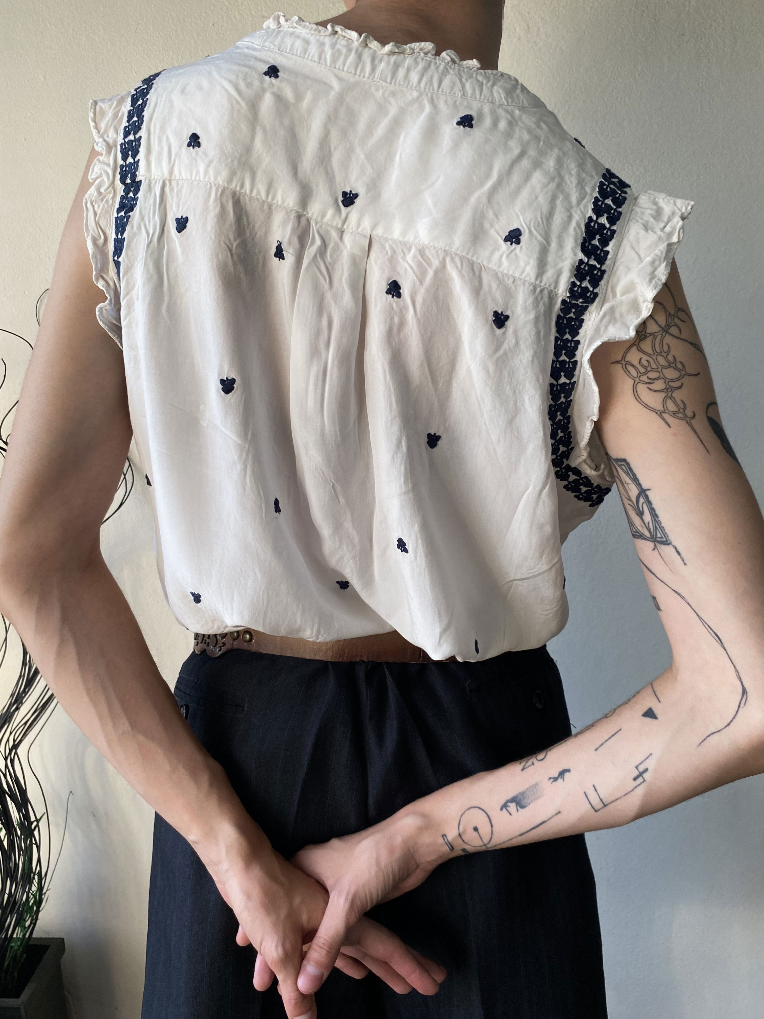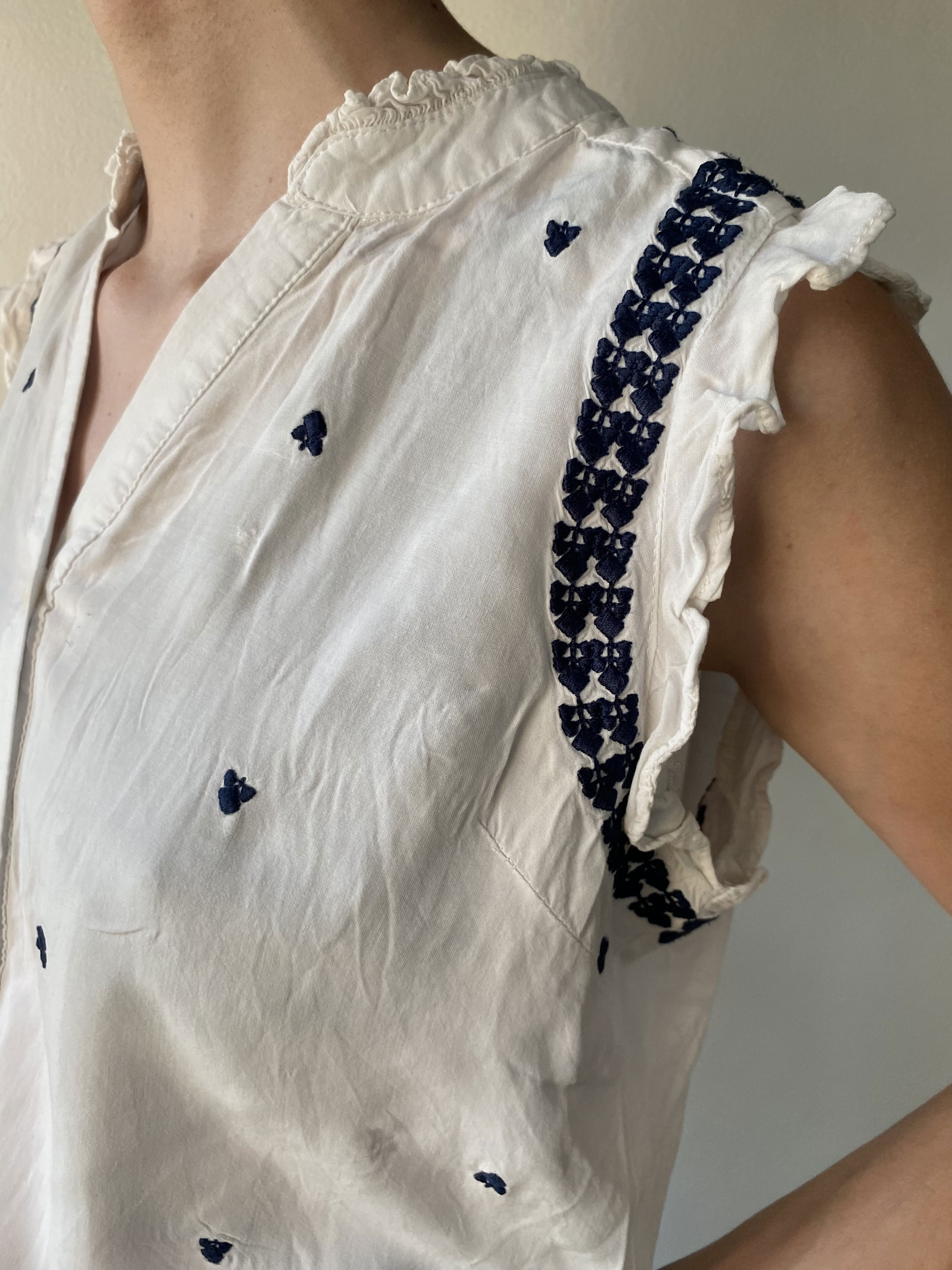 Camisa color blanca, súper liviana y fresca toda bordada en azul marino y mini voladitos en las mangas.