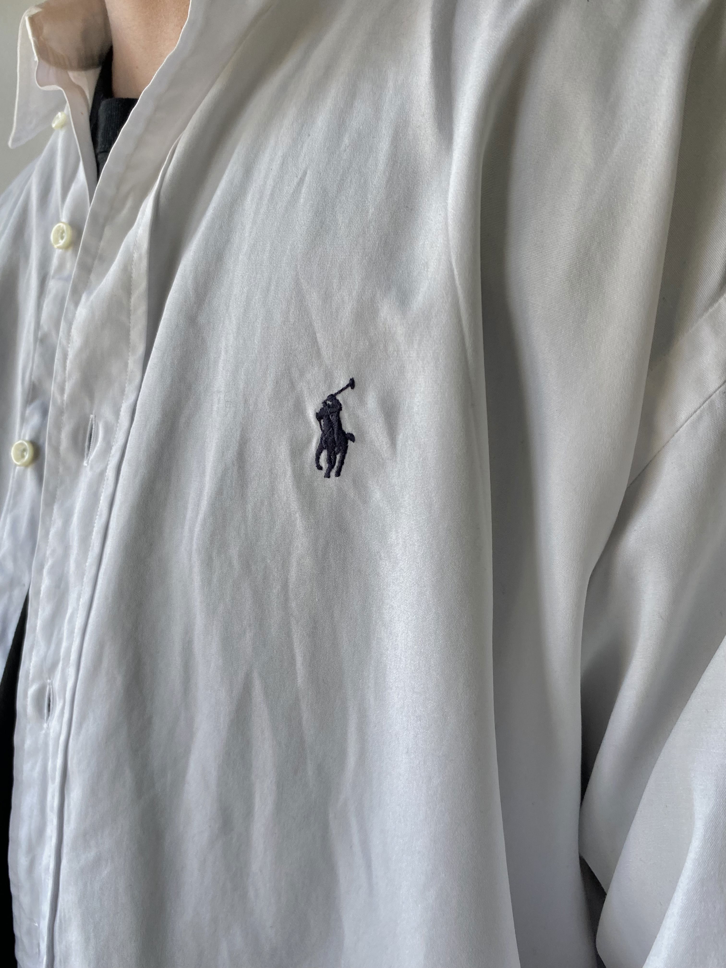 Camisa marca Ralph Lauren color blanca, con detalle bordado de la marca en azul oscuro. Oversize, talle XL