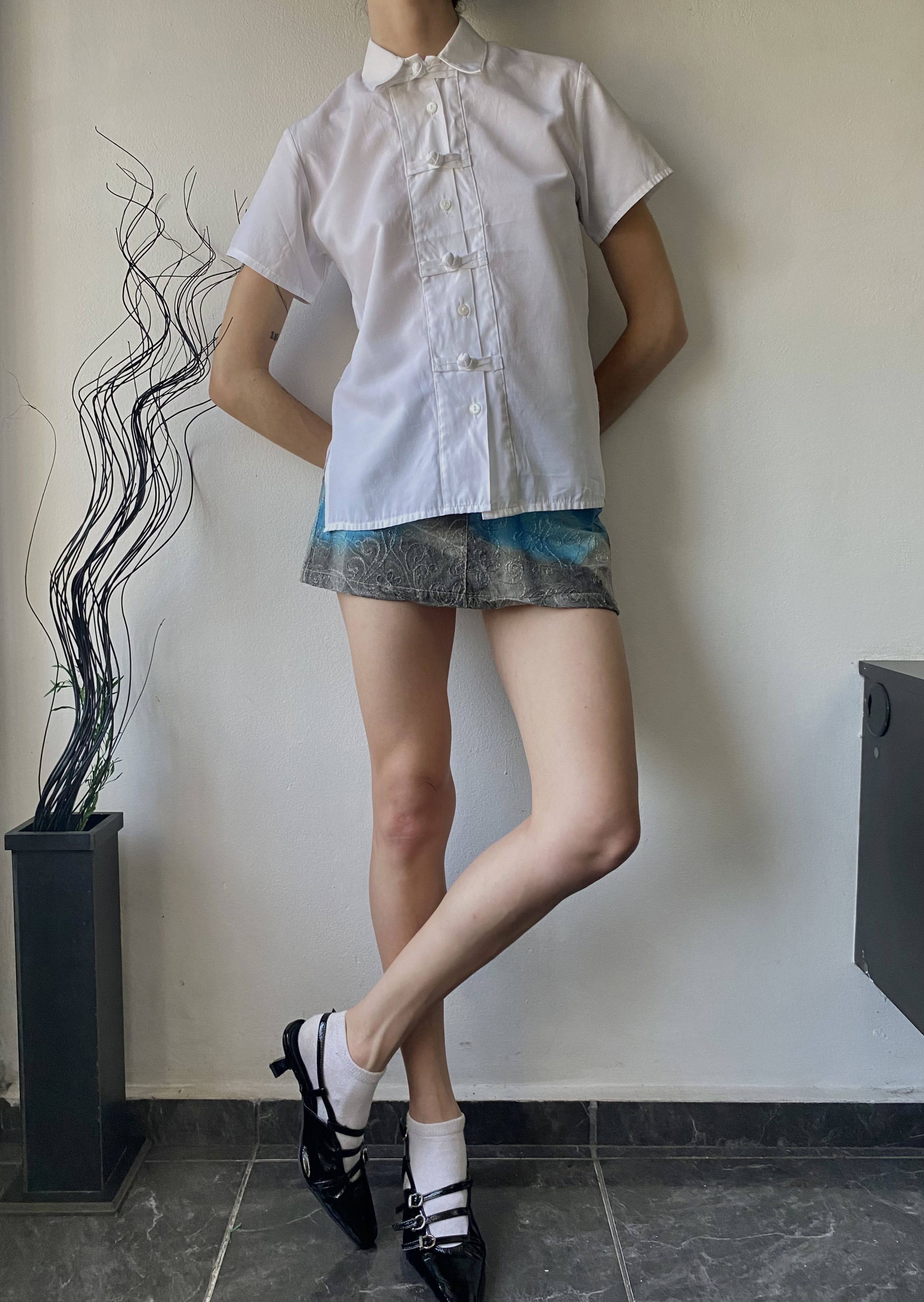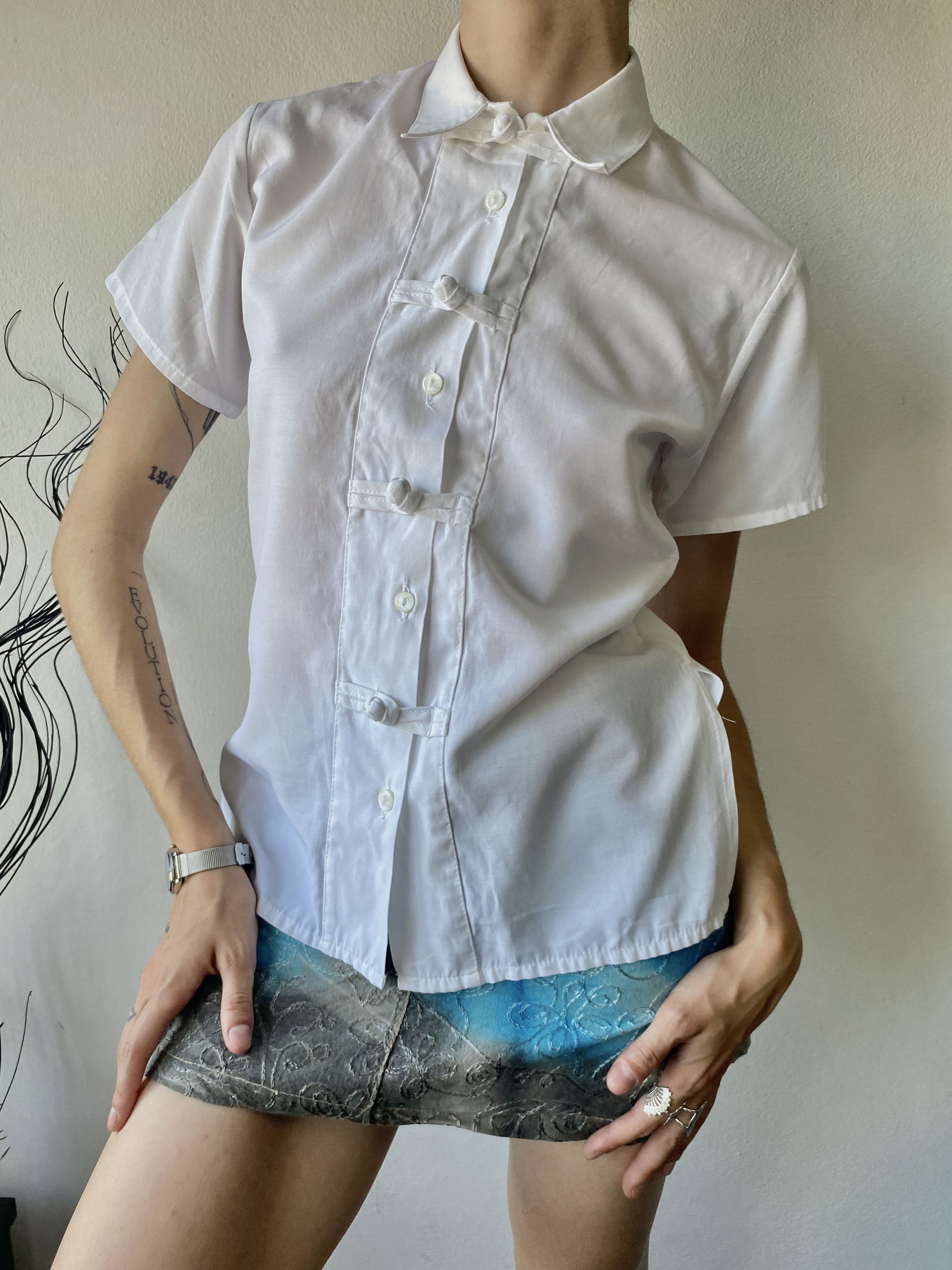 Camisa manga corta, blanca estilo japonesa con nudos en la parte delantera y aperturas al final a los costados. Súper fresca, no se transparenta.