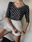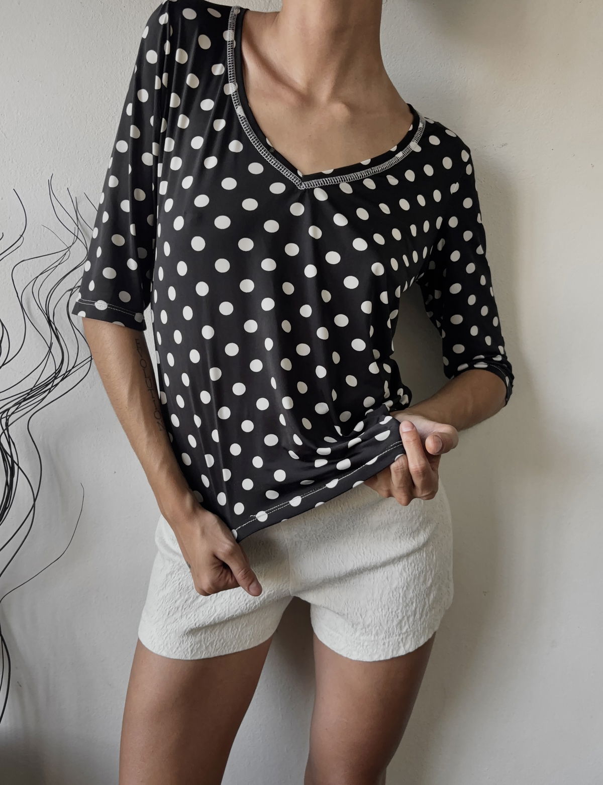 Blusa de lycra fria con estampado a lunares, cuello en V y mangas 3/4. Talle M