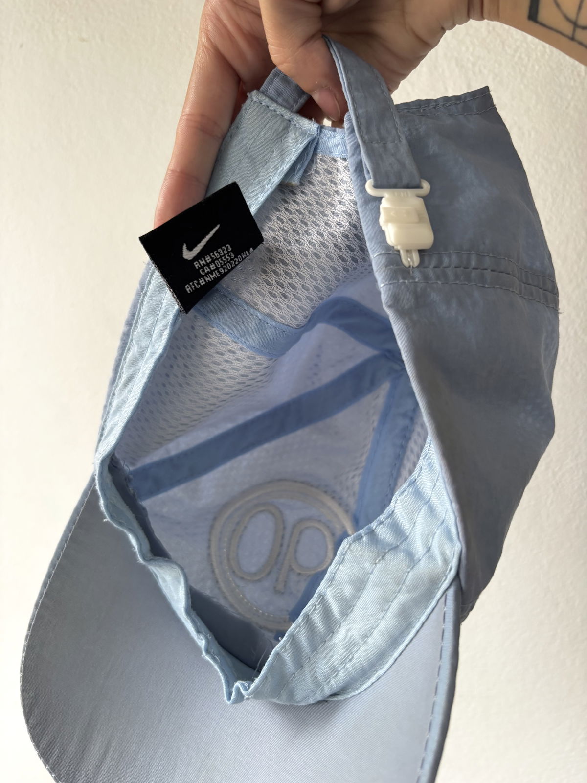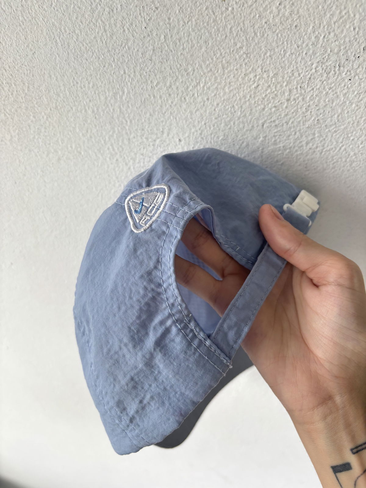 Gorra marca Nike original, color celeste pastel, con bordados en toda la parte delantera, logo atrás y red en el interior. Se ajusta con botón de plástico. Impecable