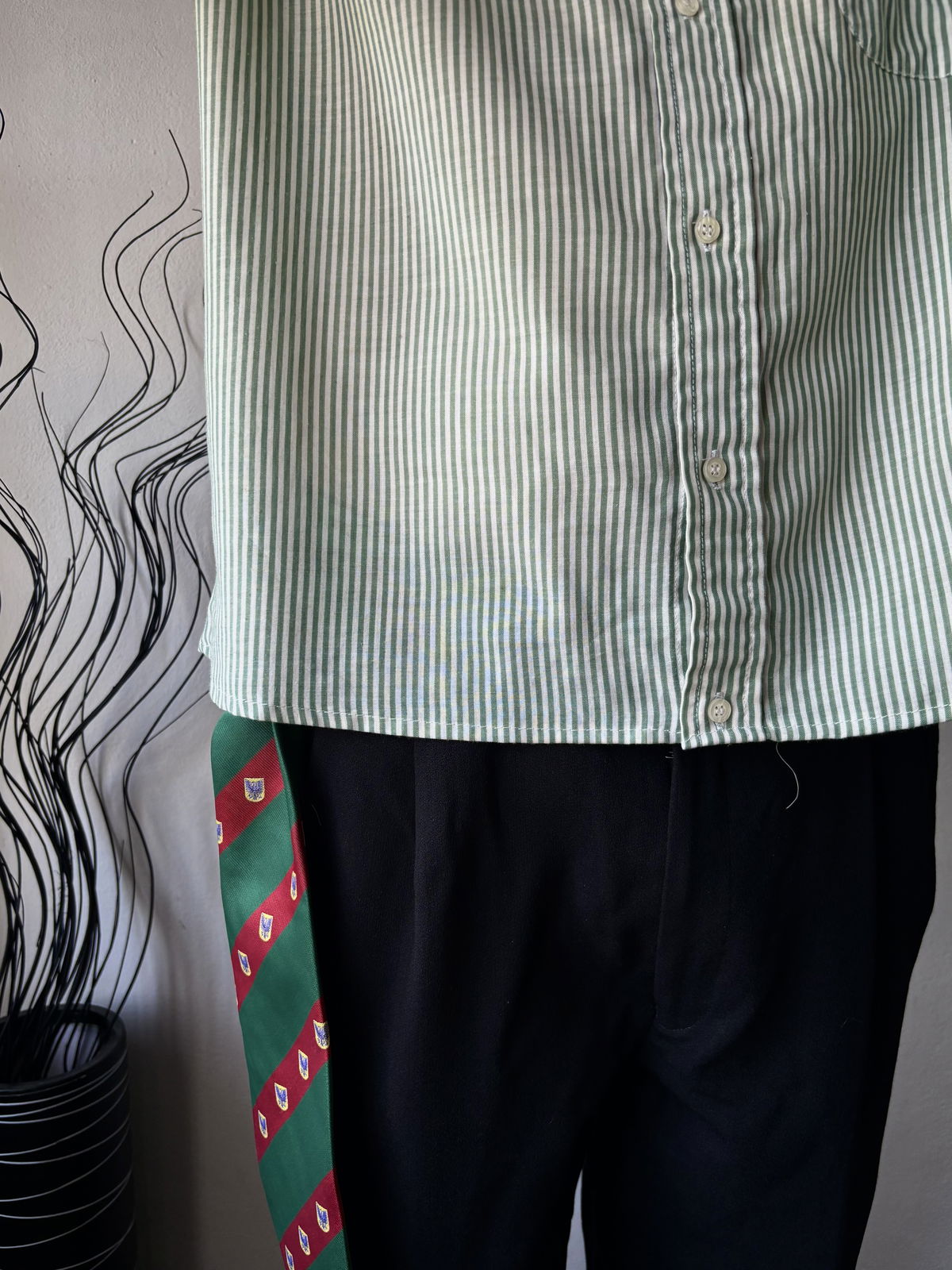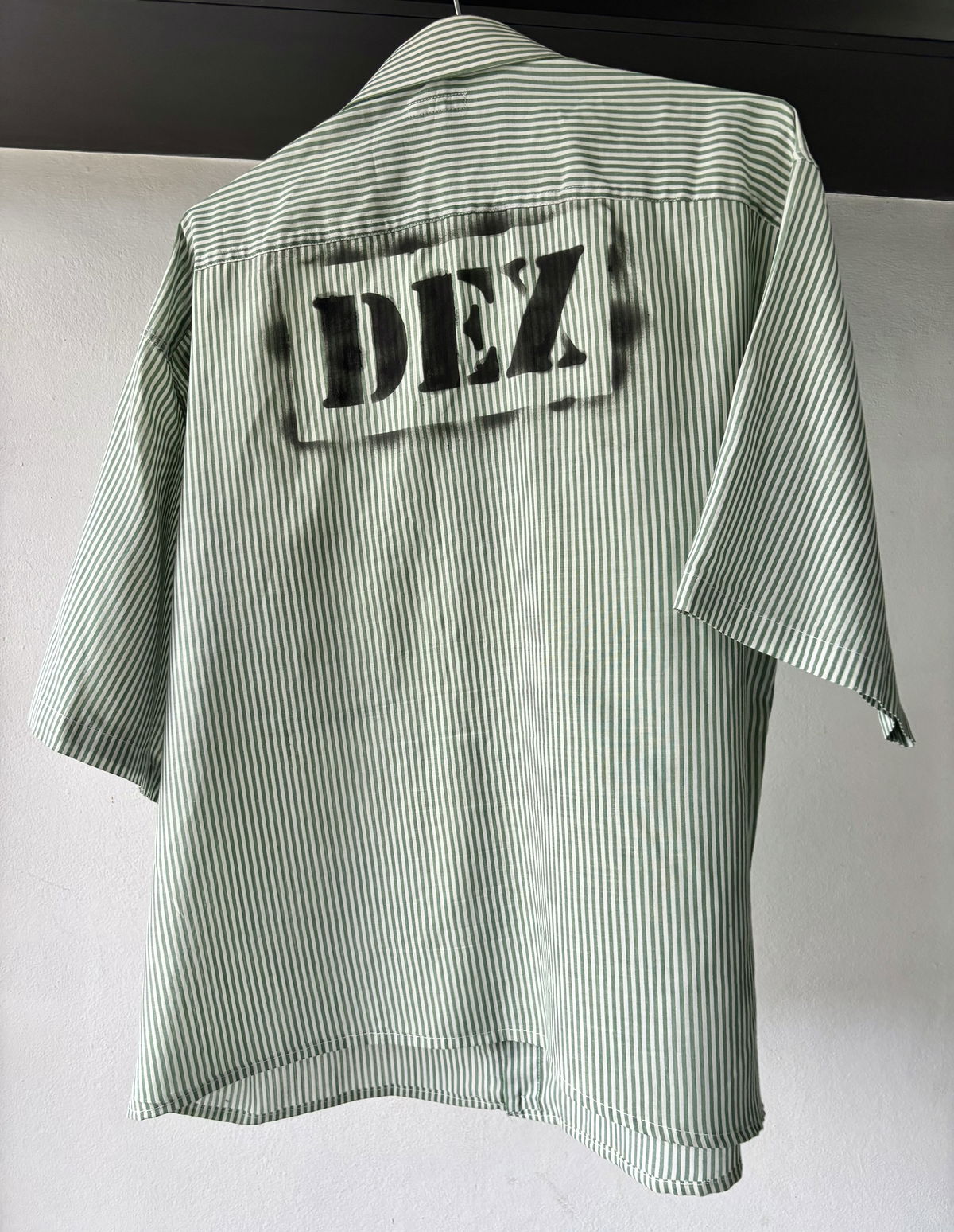 Camisa marca Puccio con rayas color verde oscuro y blanco, manga corta y con bolsillo a un lado. Tagg DEX en la espalda y corte boxy. Talle M/L, tela súper liviana no se arruga.