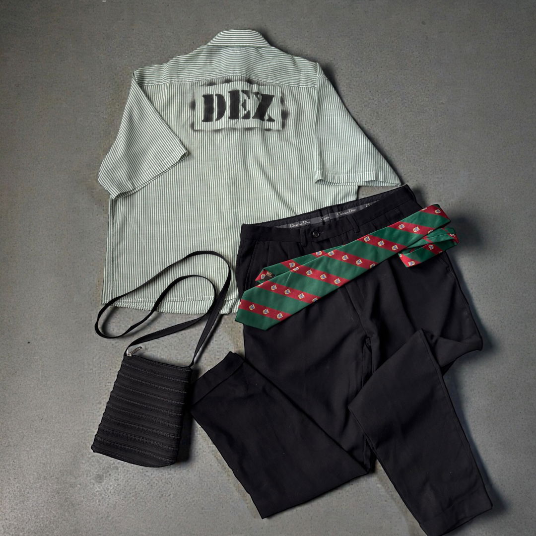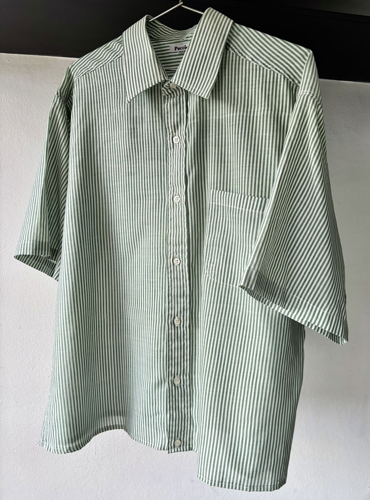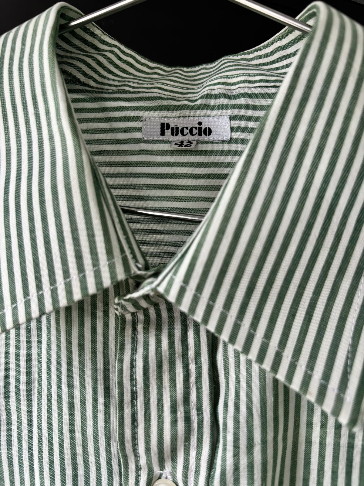 - Camisa DEX boxy, rayada color verde y blanco, marca Puccio. Medidas: Largo (66cm), Hombros (45cm), Manga (26cm).