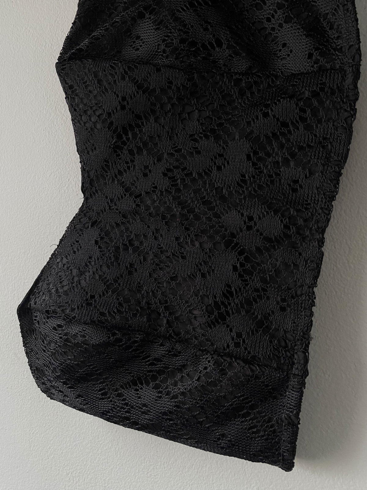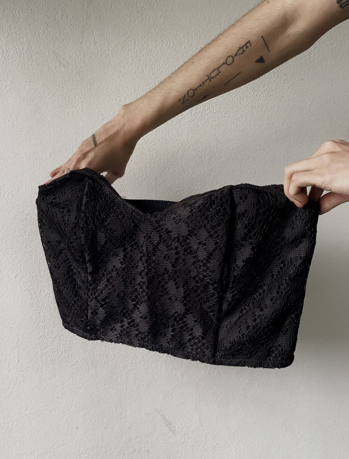 Corset de encaje color negro con escote corazón y dos ballenas en la parte delantera. En la espalda tiene elástico tipo frunce por ende puede ir de un 90 a 100 de busto sin problema.