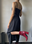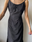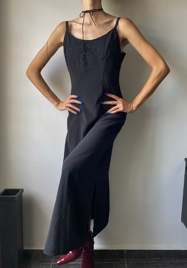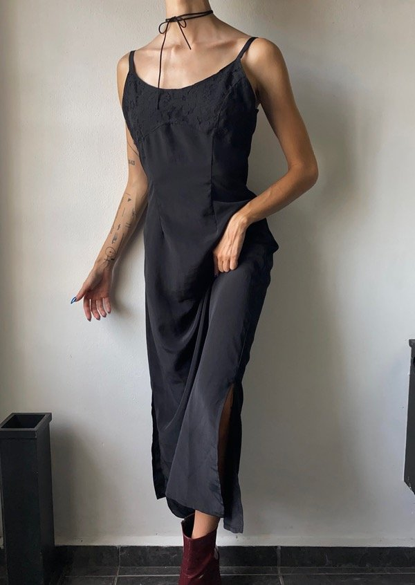 Vestido de seda opaca color negro, con mini abertura en ambos lados y escote de encaje. Cierre en la espalda.