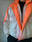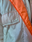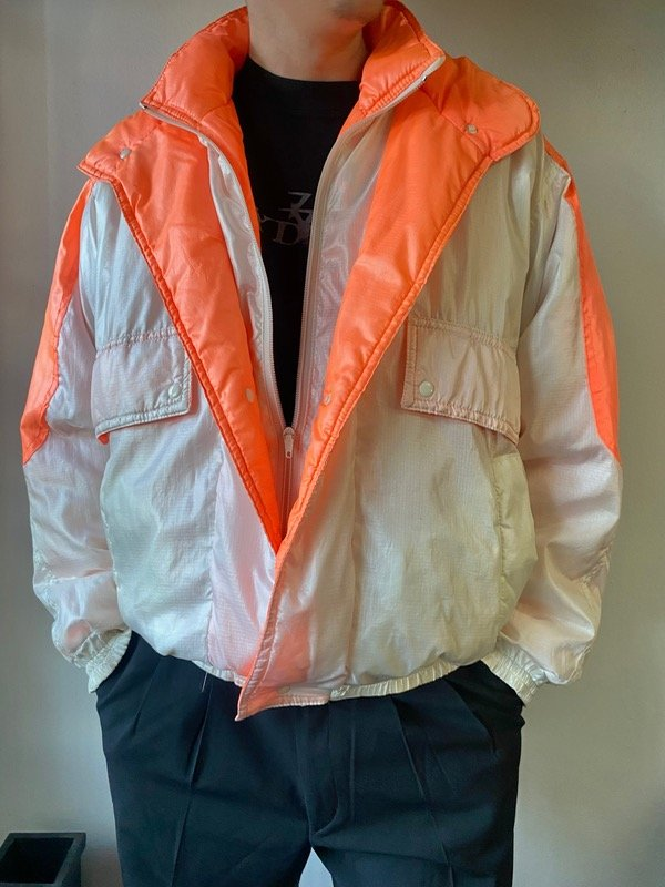 Campera inflada rompevientos, de color crema y naranja fluorescente. Con cierre y botones, talle M/L