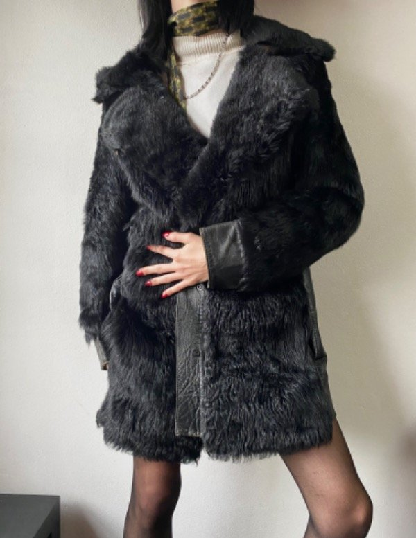 Saco peludo color negro, súper suavecito y abrigado con cuero en las mangas y espalda. Se cierra a clip, todo forrado por dentro y con bolsillos en ambos lados, impecable, talle M/L