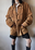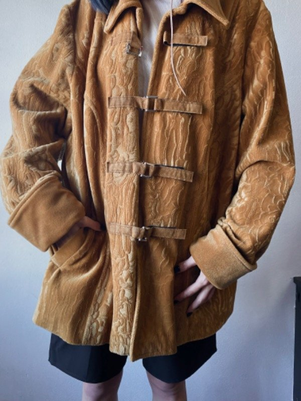 Tapado color camel, de tela tipo pana toda tramada, forrado por dentro y doble bolsillo rela. Se cierra con hebillas y abrojo. Talle M