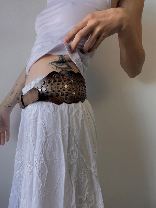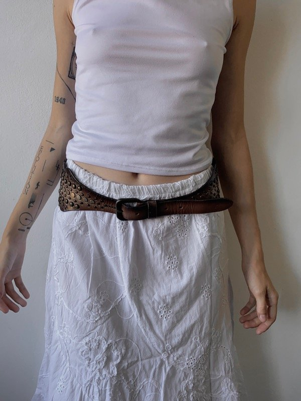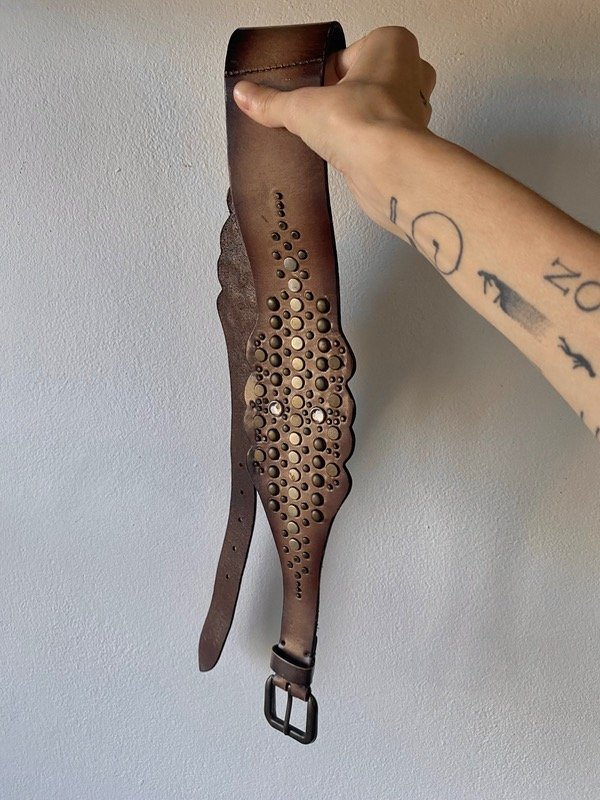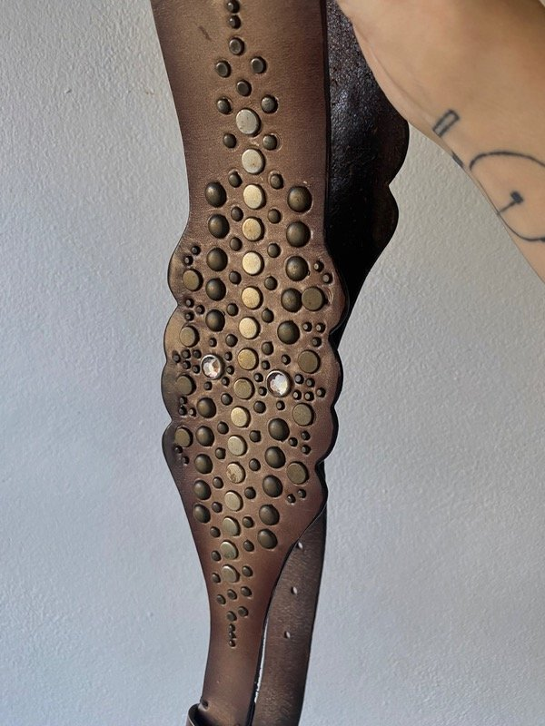 Faja de cuero color marrón con degrade y tachas en ambos costados. Hebilla metalica color bronce.