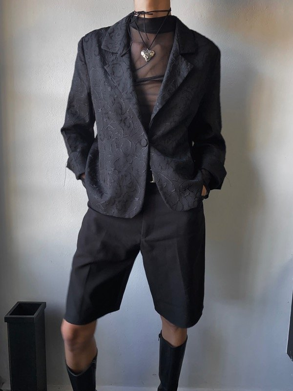 Blazer corto color negro, todo tramado en hilo con solapa y un solo botón. Forrado por dentro, impecable