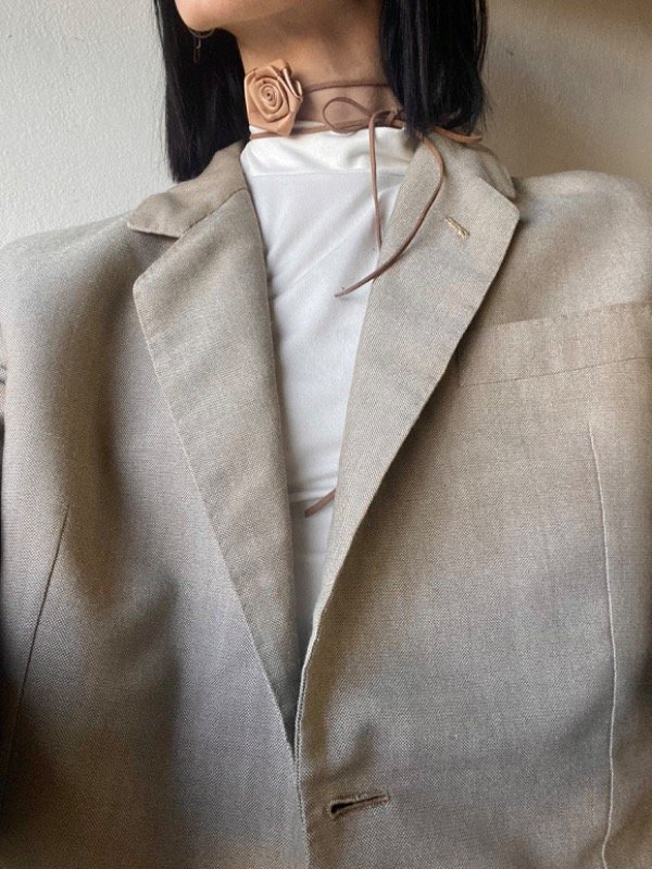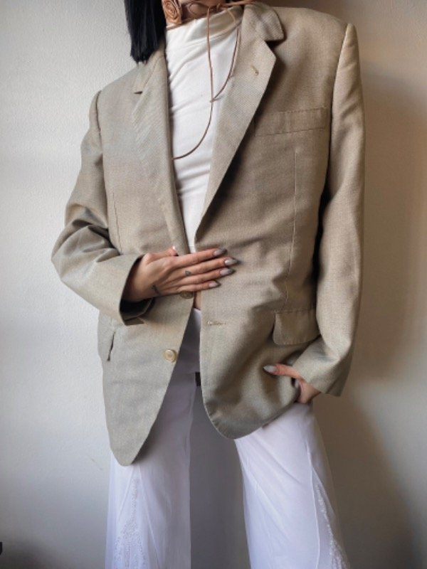 Blazer color nude, de tela tramada con doble bolsillo en la parte exterior y uno interior. Todo forrado por dentro, talle M