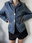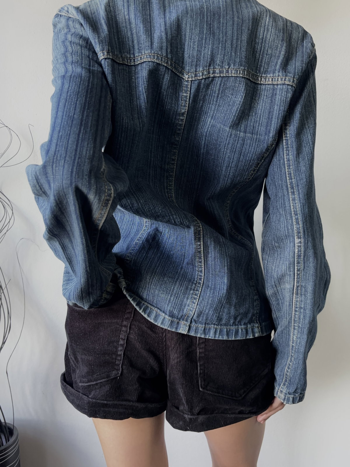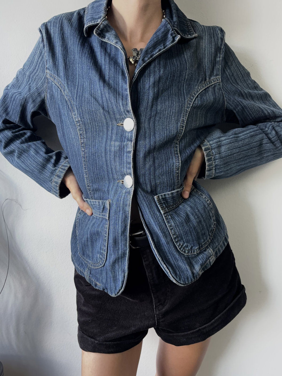 Blazer de jean color azul, estilo desgastado, con dos mini bolsillos adelante y botones grandes plateados. Talle M