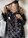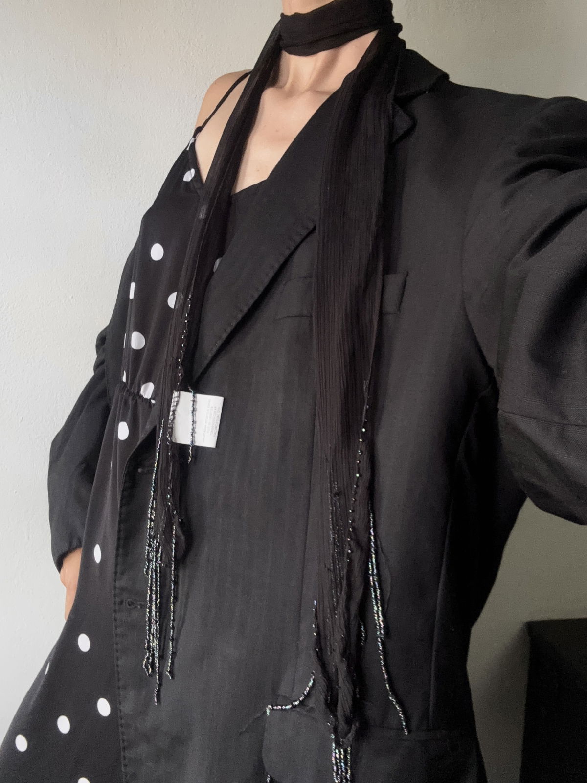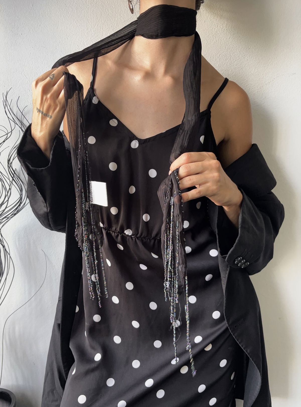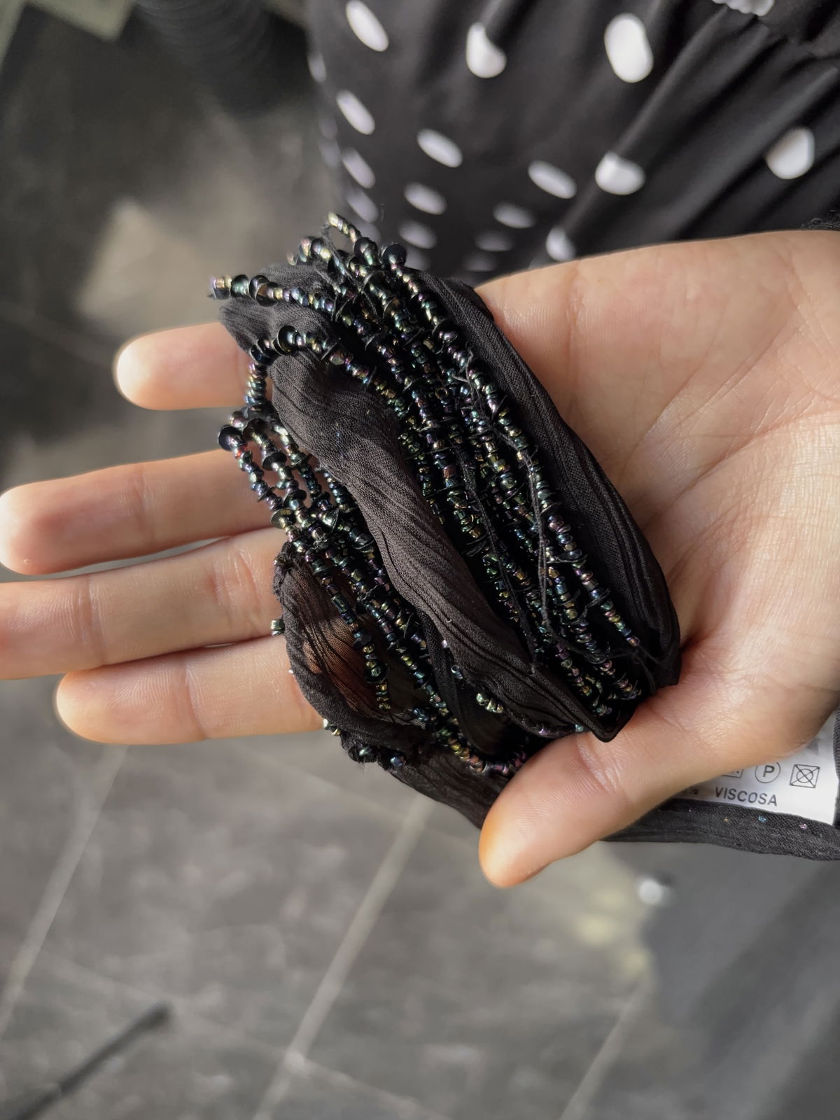 Bufandin color negro con flecos de mostacillas tornasoladas al final.