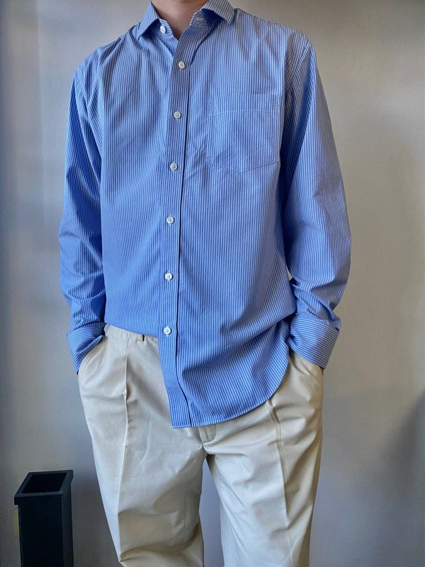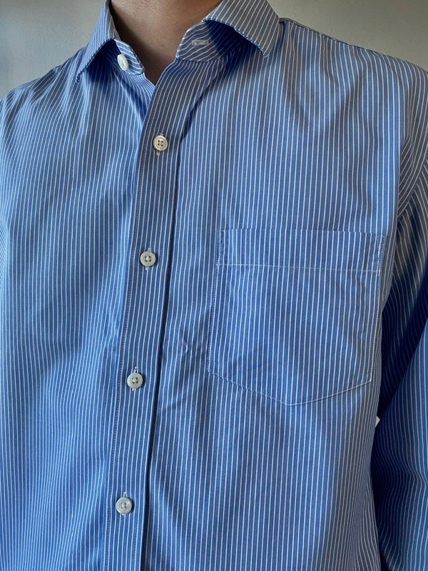 Camisa color celeste rayada en blanco, con bolsillo a un costado, talle L