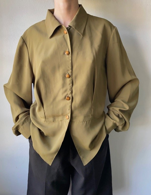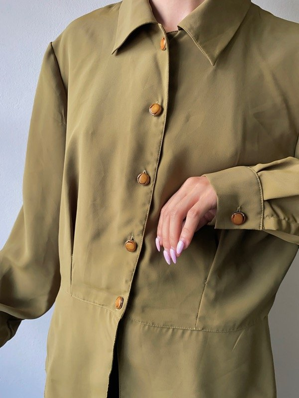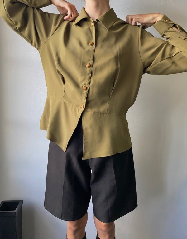 Camisa color oliva, con costura que si queda ajustada simula corset sino queda solapeada