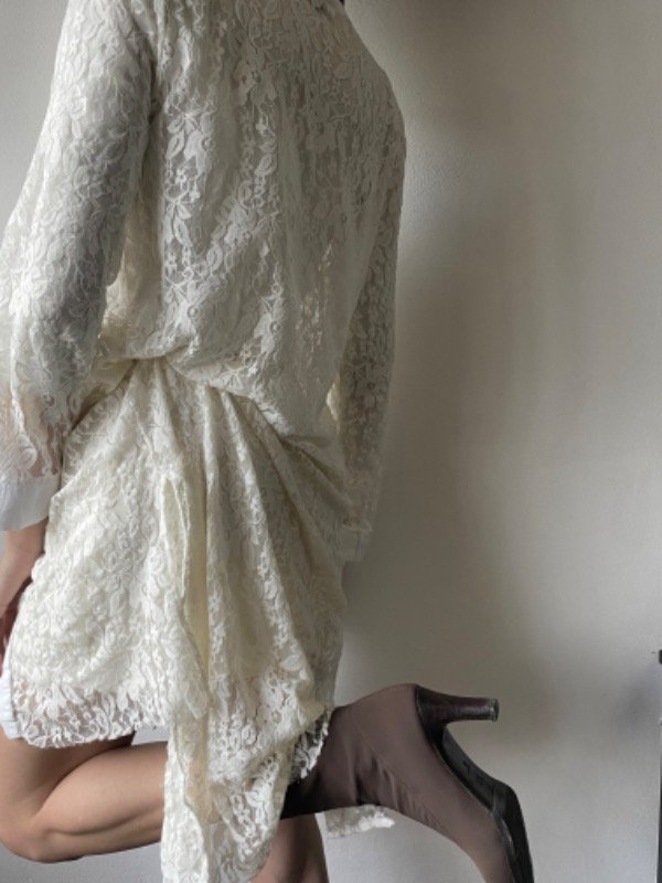 Camisa color blanco toda de encaje, tipo vestido larga con botones y cuello. Talle S