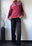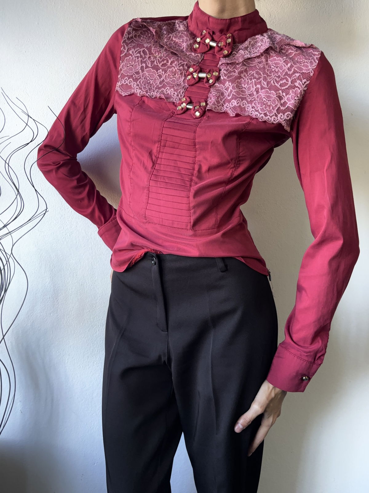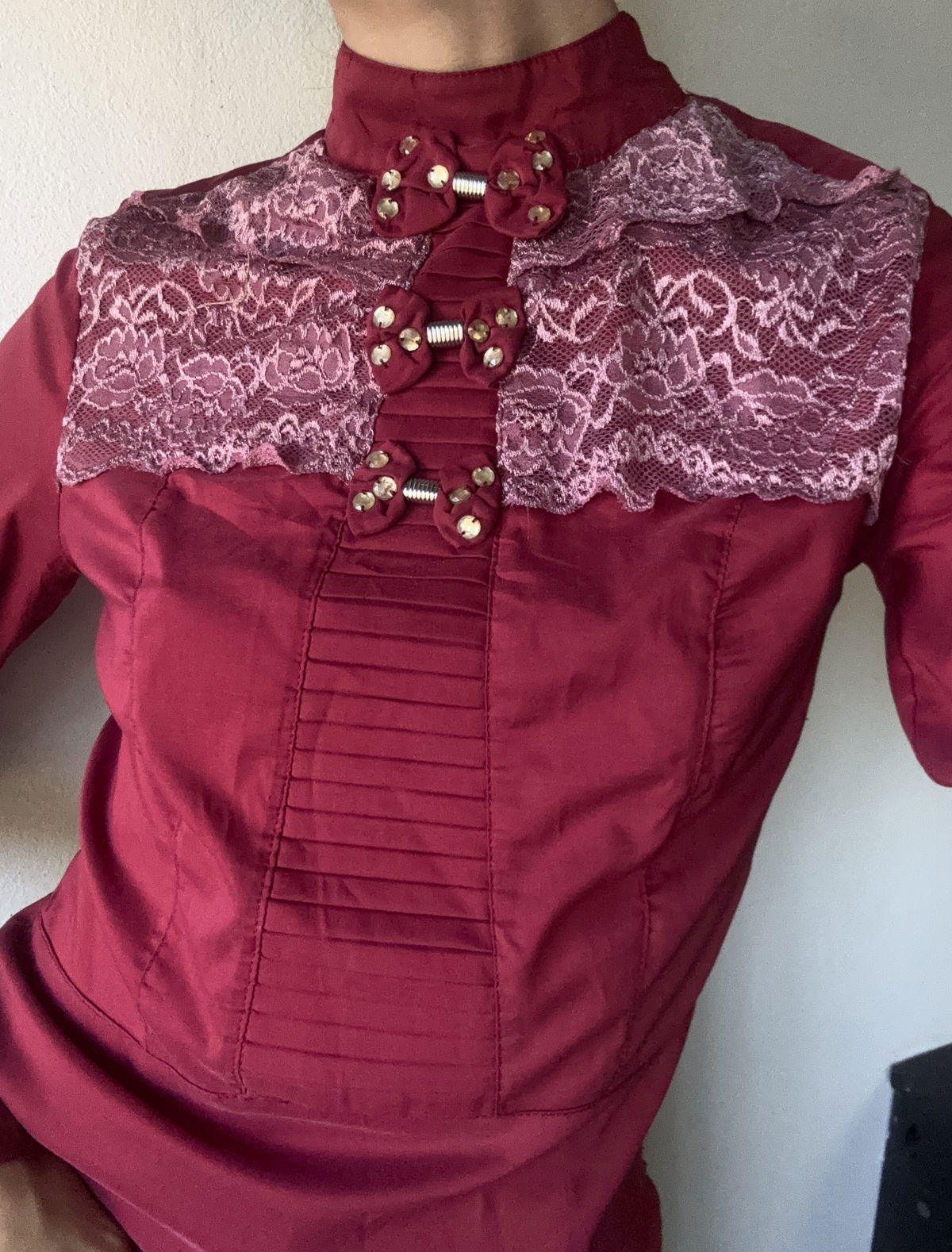Camisa color bordo, con detalle de encaje y tres moños con brillos en el frente. Cuenta con cierre invisible a un costado y se abrocha en la nuca con botón, cuello alto y lisa en la parte de atrás. Talle S