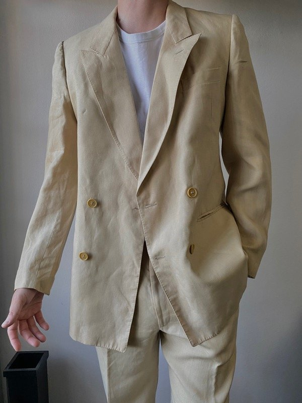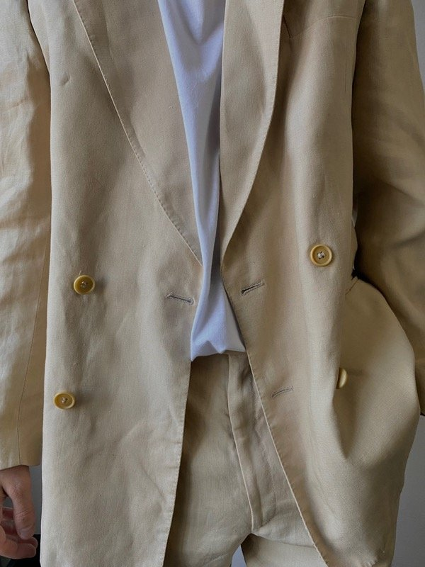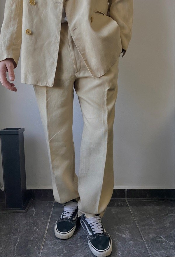 Traje sastrero color crema medio amarillito, de tela tipo lino bastante gruesa. El blazer está todo forrado por dentro y tiene bolsillo interior; el pantalón tiene doble bolsillos reales en la parte delantera y trasera y pasacinto.