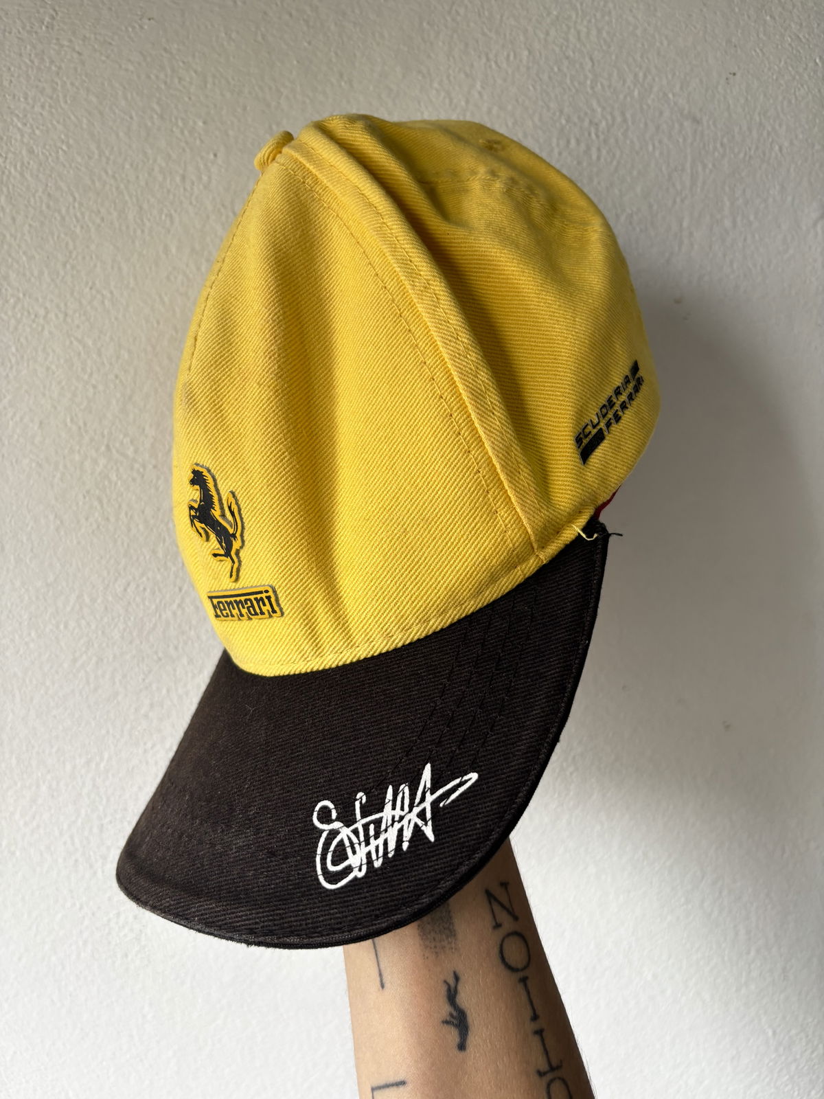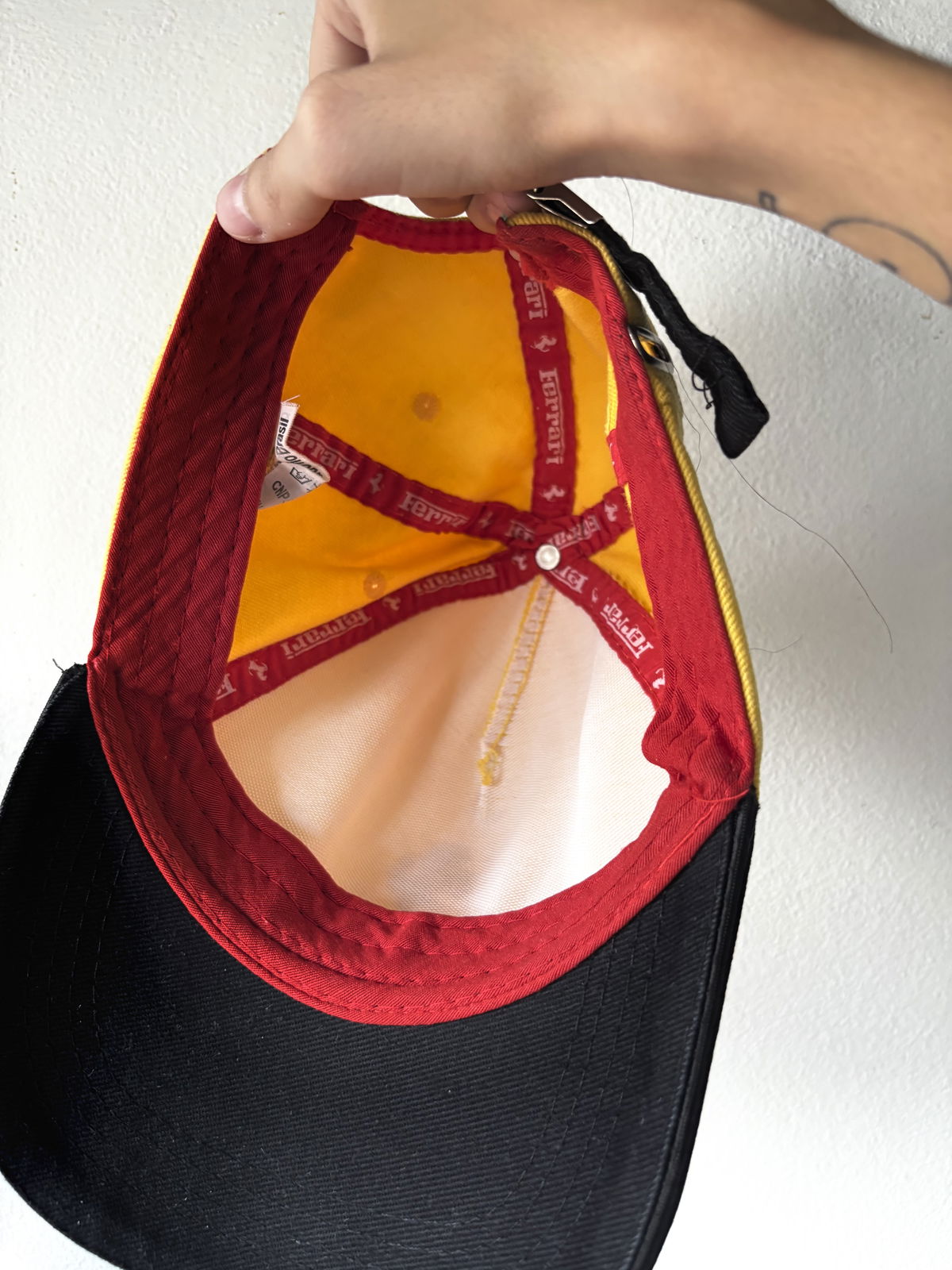 Gorra marca Ferrari original, color amarilla con visera negra, marca con relieve en el frente, firma y detalles a los costados como la bandera de Italia. Se regula con hebilla de metal con dibujo del logo, impecable por dentro. Sin detalles.