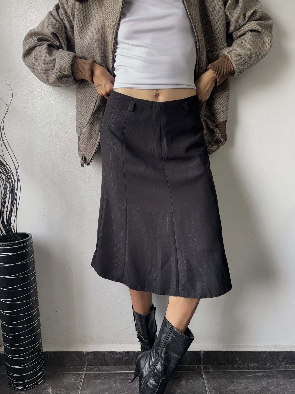 Pollera midi color negra, con finos hilos plateados y con pasacinto. Cierre invisible, talle 36.