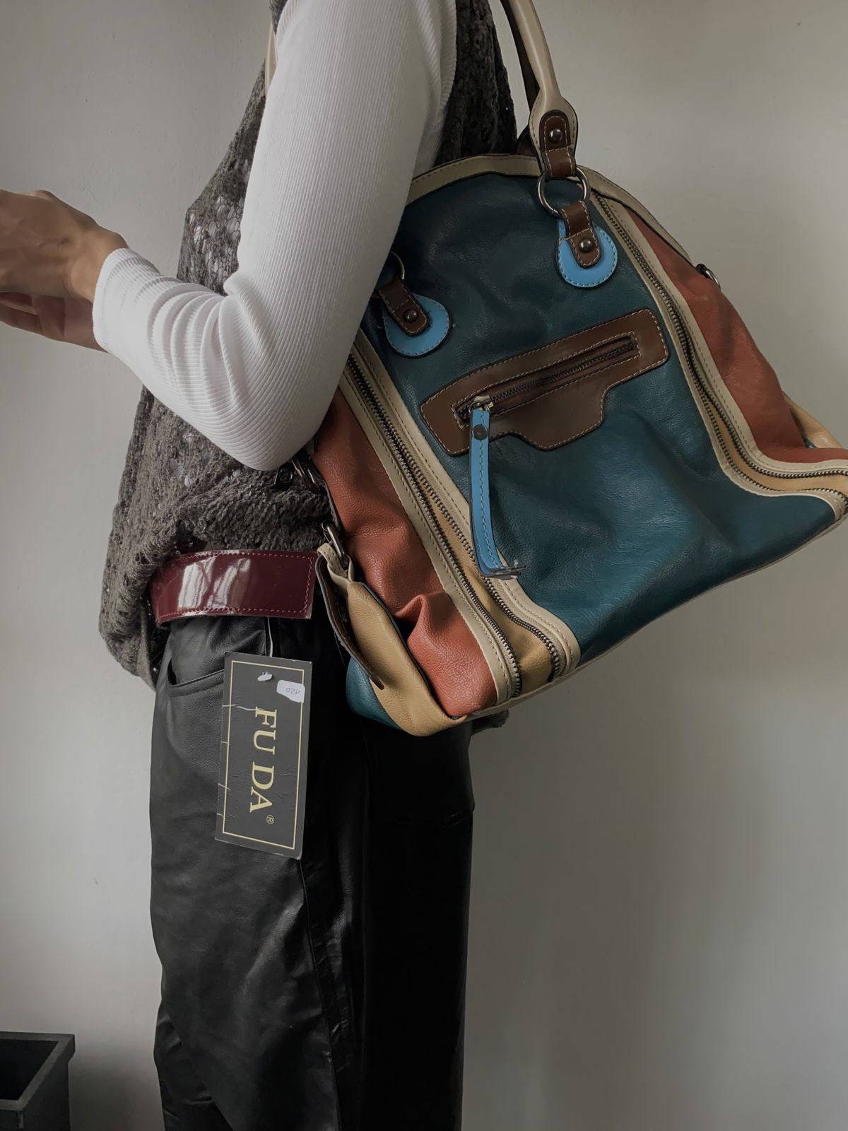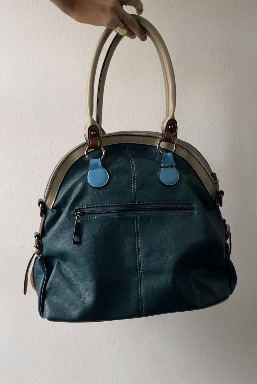 Cartela de cuero en varios colores, principalmente turquesa, nude y naranja con varios bolsillos: adelante, atrás tipo escondido e interior. Impecable por dentro, solo tiene el detalle de la ultima foto (unas pintas en la base color gris).