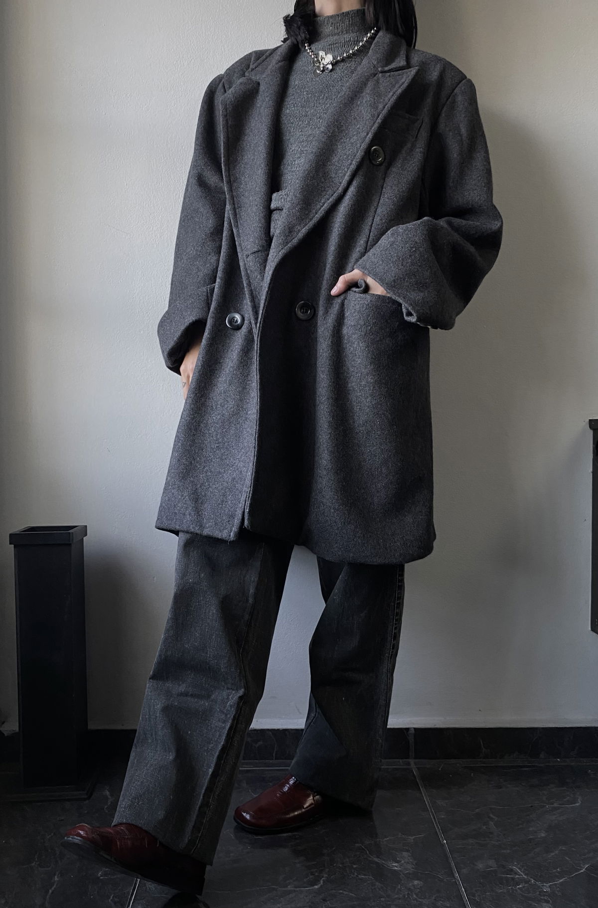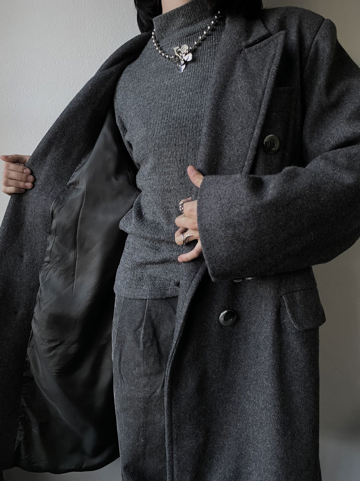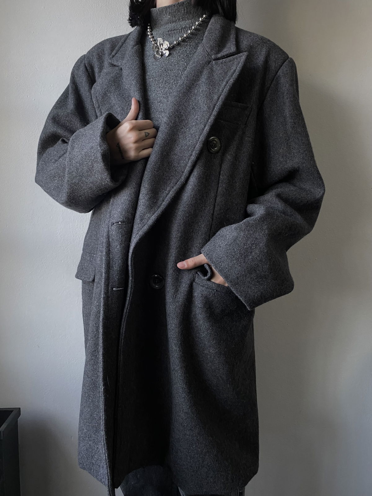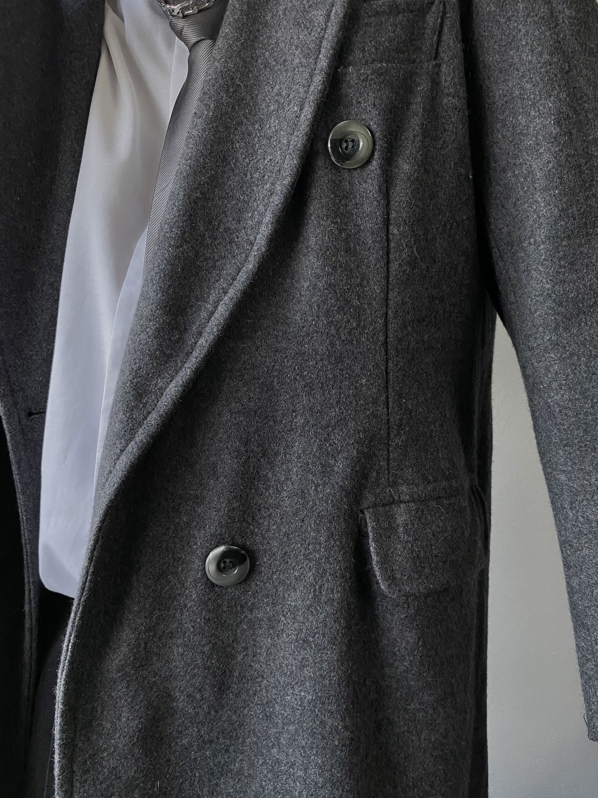 Tapado de paño color gris claro, con botones marmolados y bolsillos reales en ambos lados. Todo forrado por dentro, con muy poca hombrera. Impecable, sin detalles.
