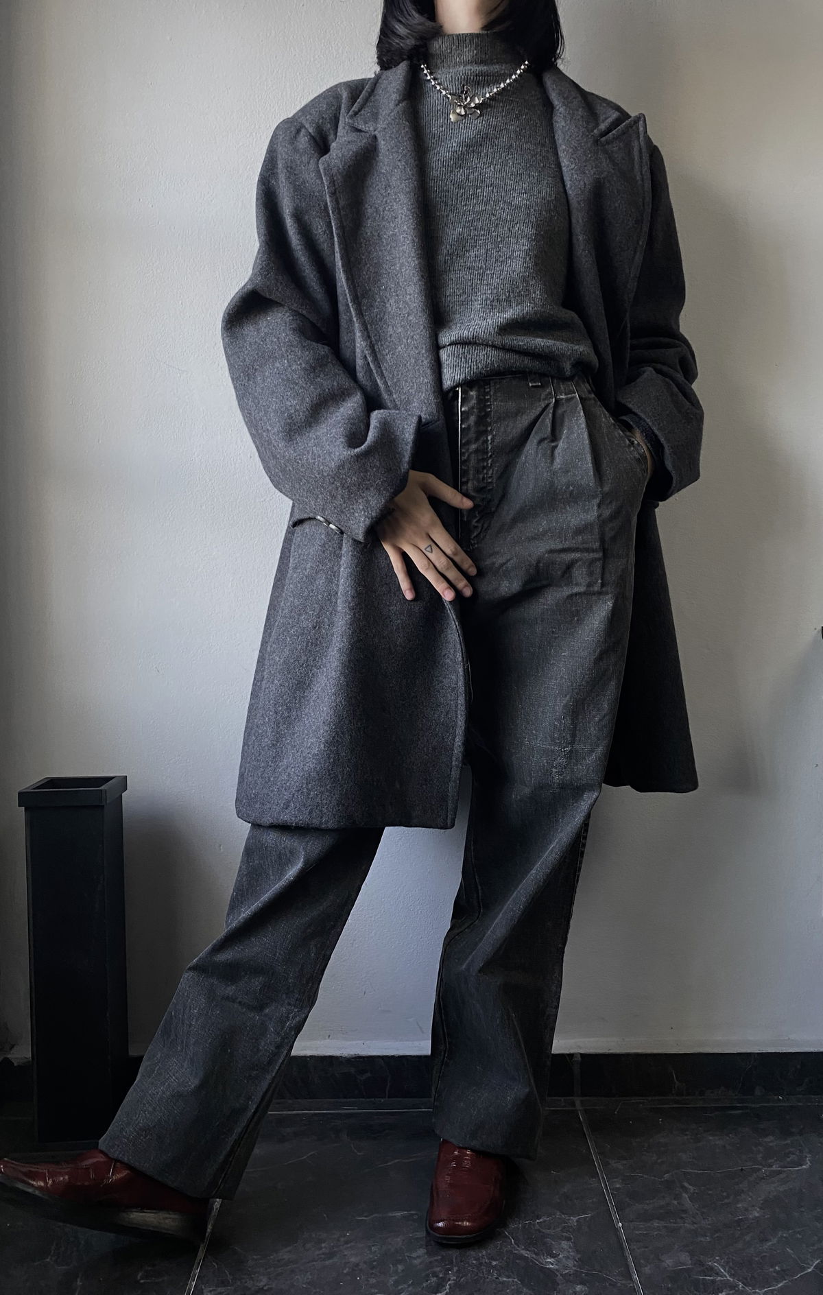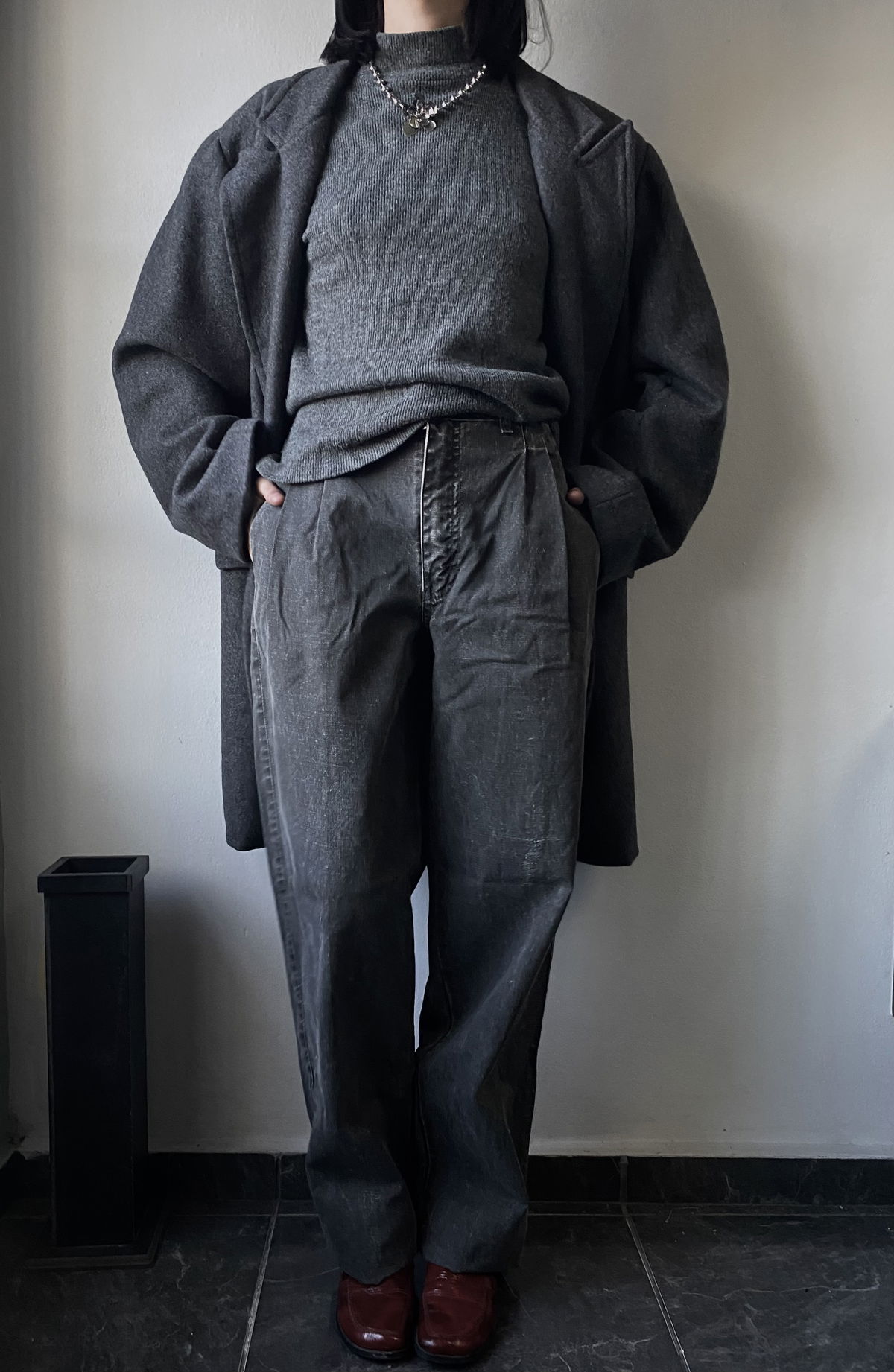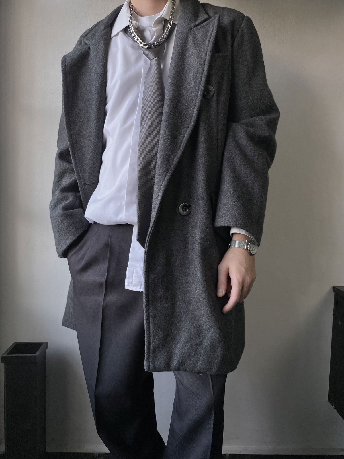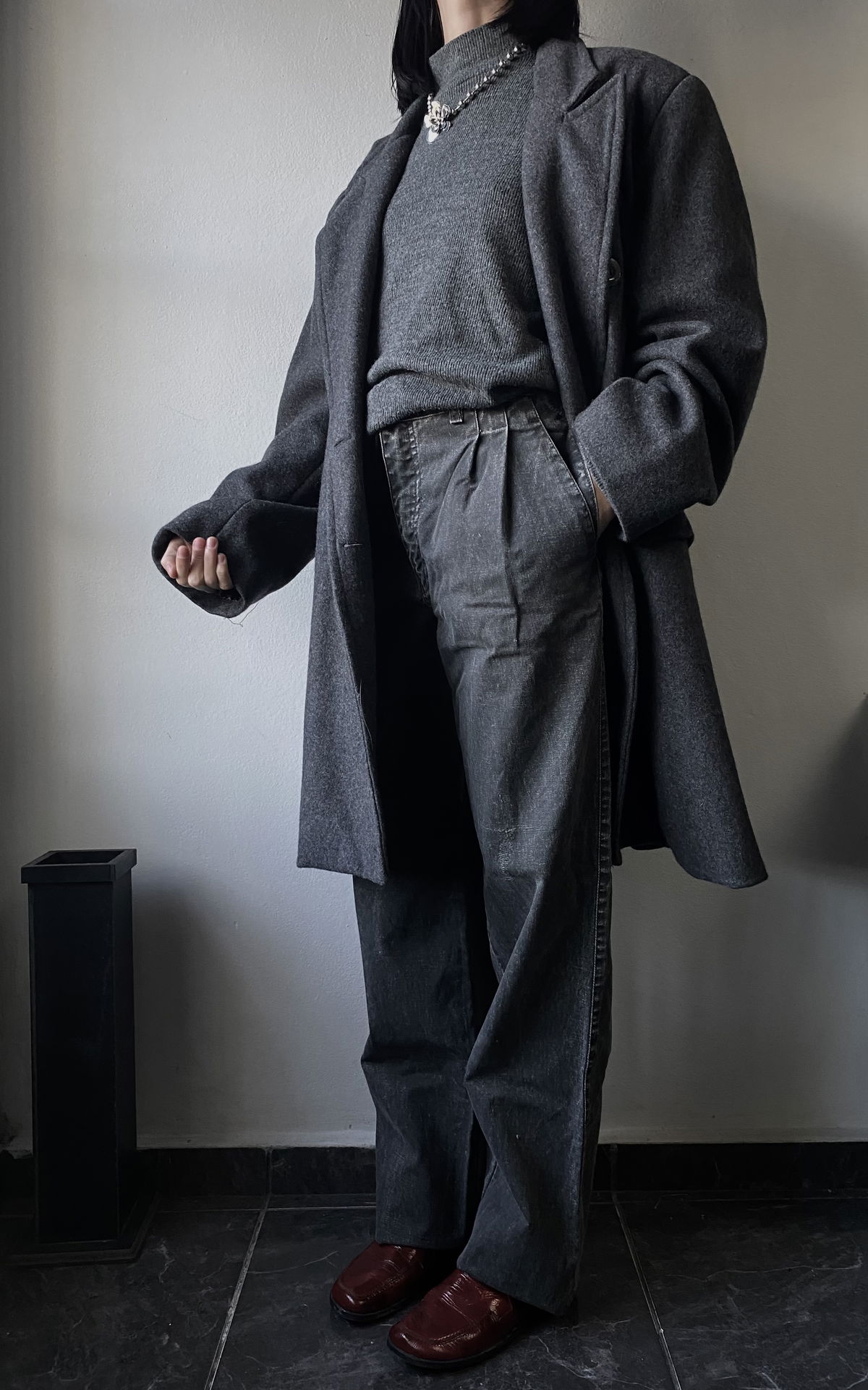 Tapado de paño color gris claro, con botones marmolados y bolsillos reales en ambos lados. Todo forrado por dentro, con muy poca hombrera. Impecable, sin detalles.