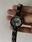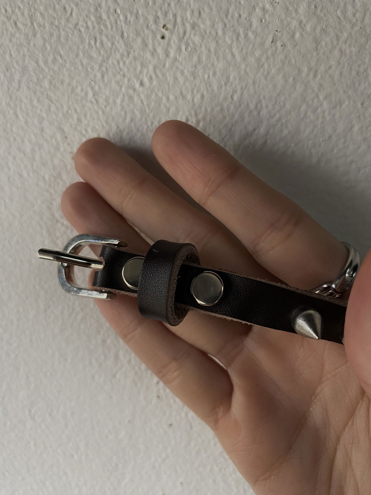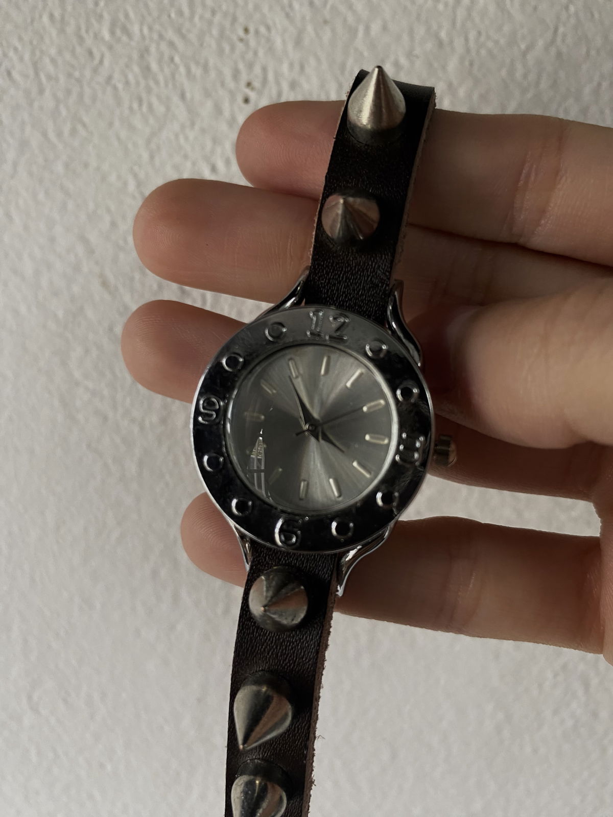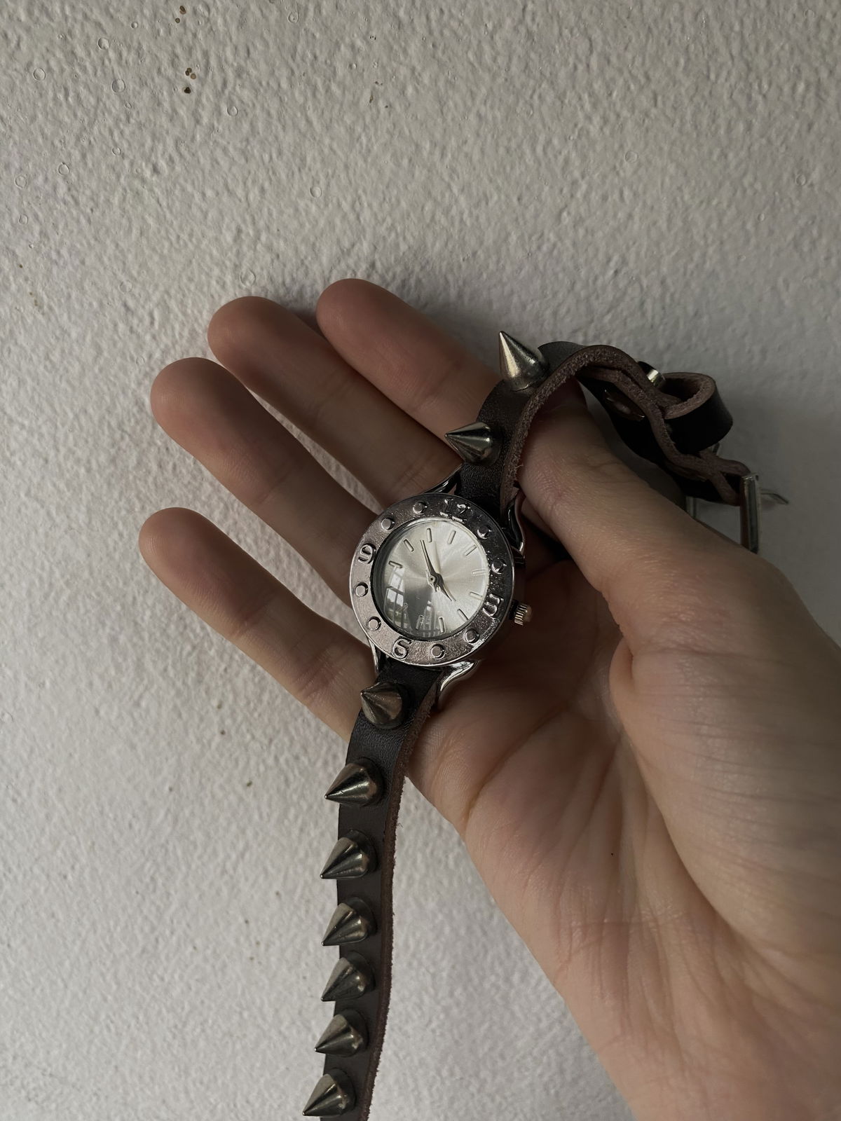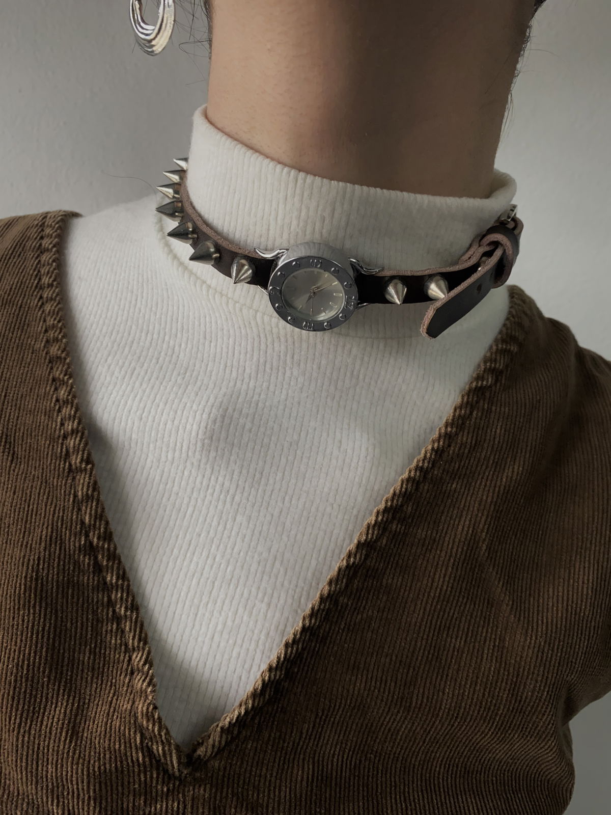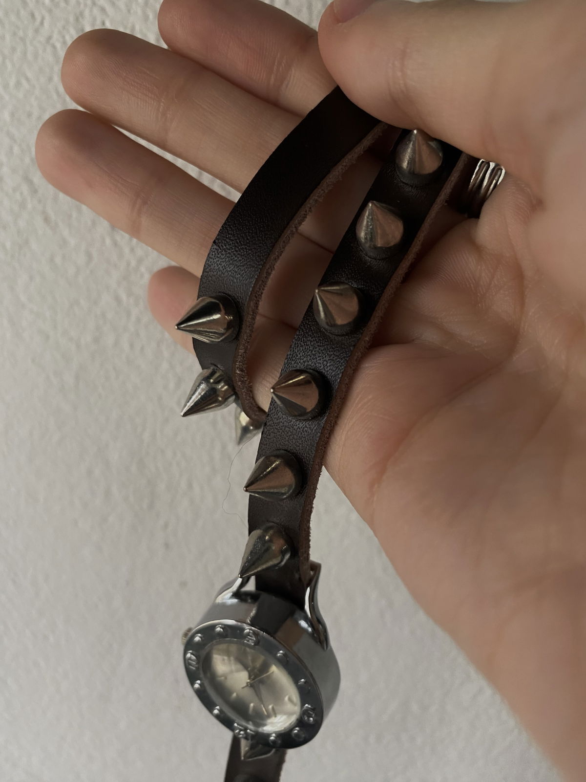 Collar con tira de cuero y tachas en punta, reloj en el medio y diferentes medidas para ajustar perfectamente al cuello. También puede ser reloj de mano con doble pulsera. El reloj no funciona.