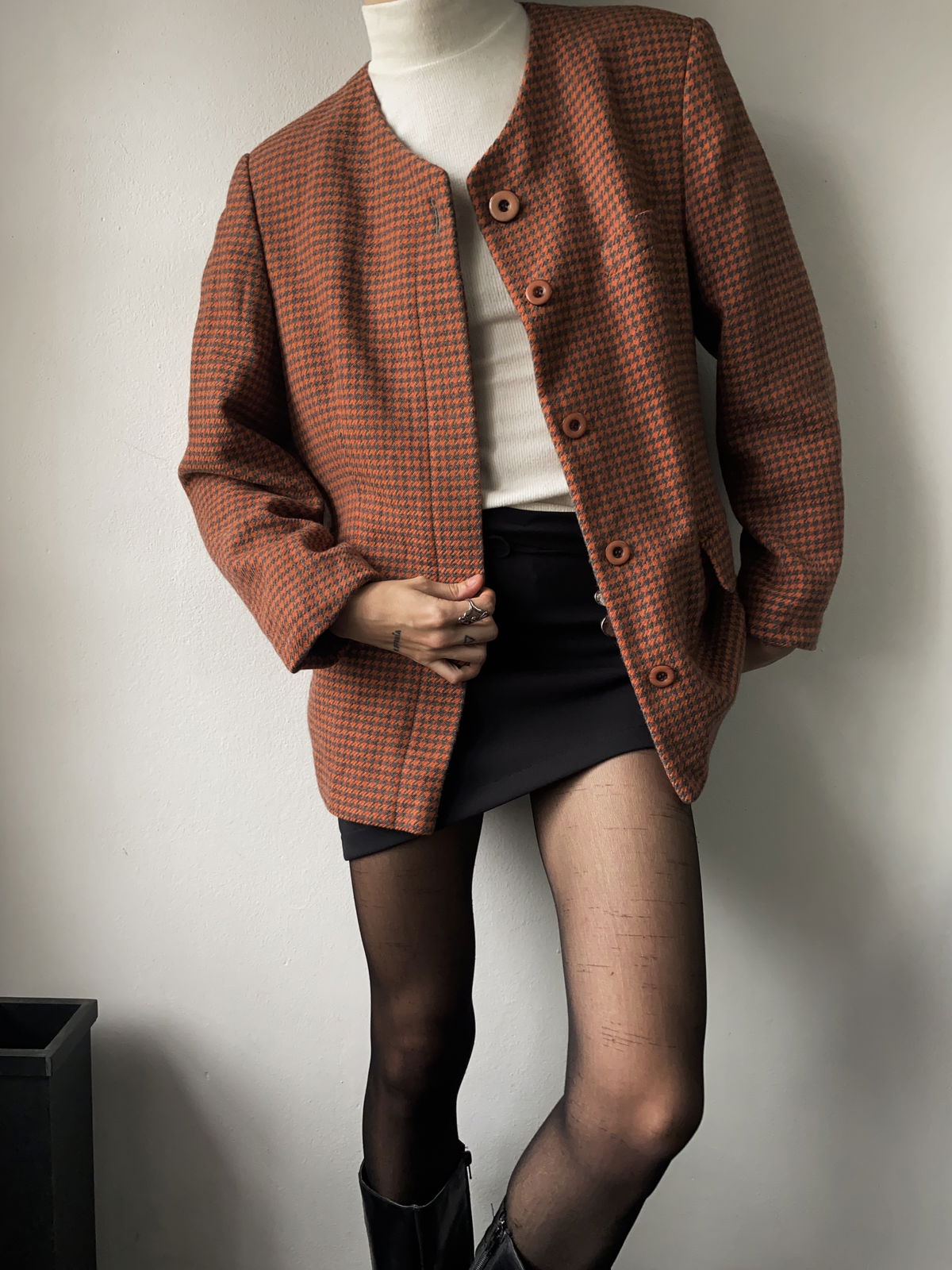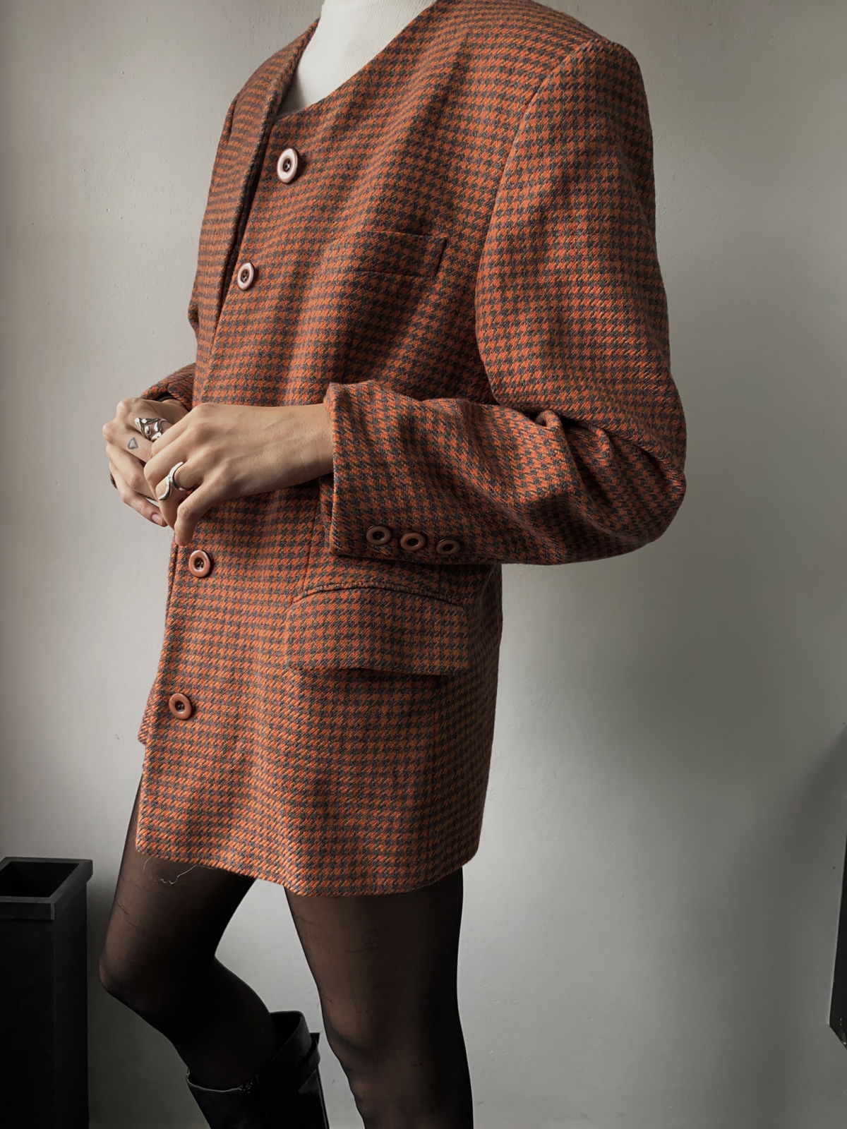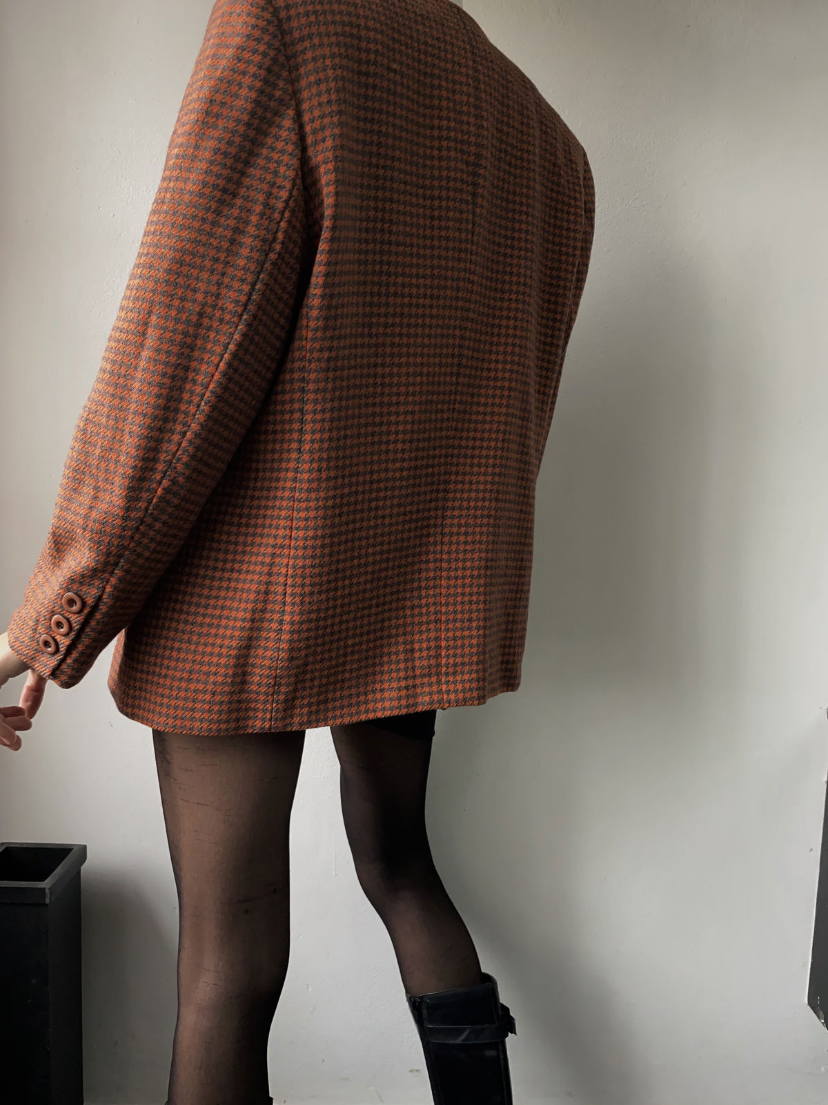 Blazer cuadrille color naranja y gris, con doble bolsillo real y todo forrado por dentro. Botones escondidos, impecable.