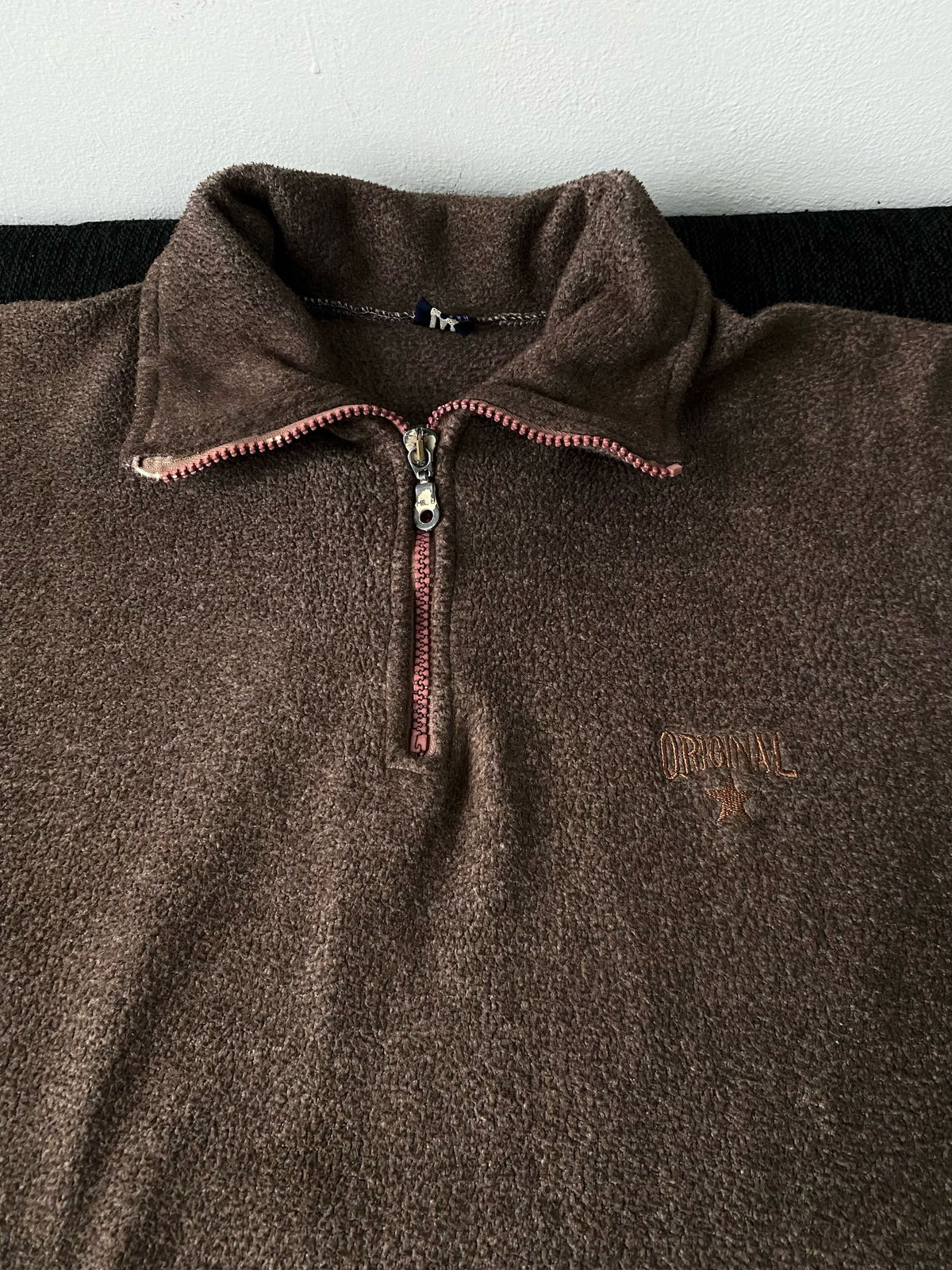 Buzo de polar color chocolate, marca Original con bordado a un costado y cierre en el cuello. Bolsillo delantero, impecable, talle M medio boxy.