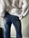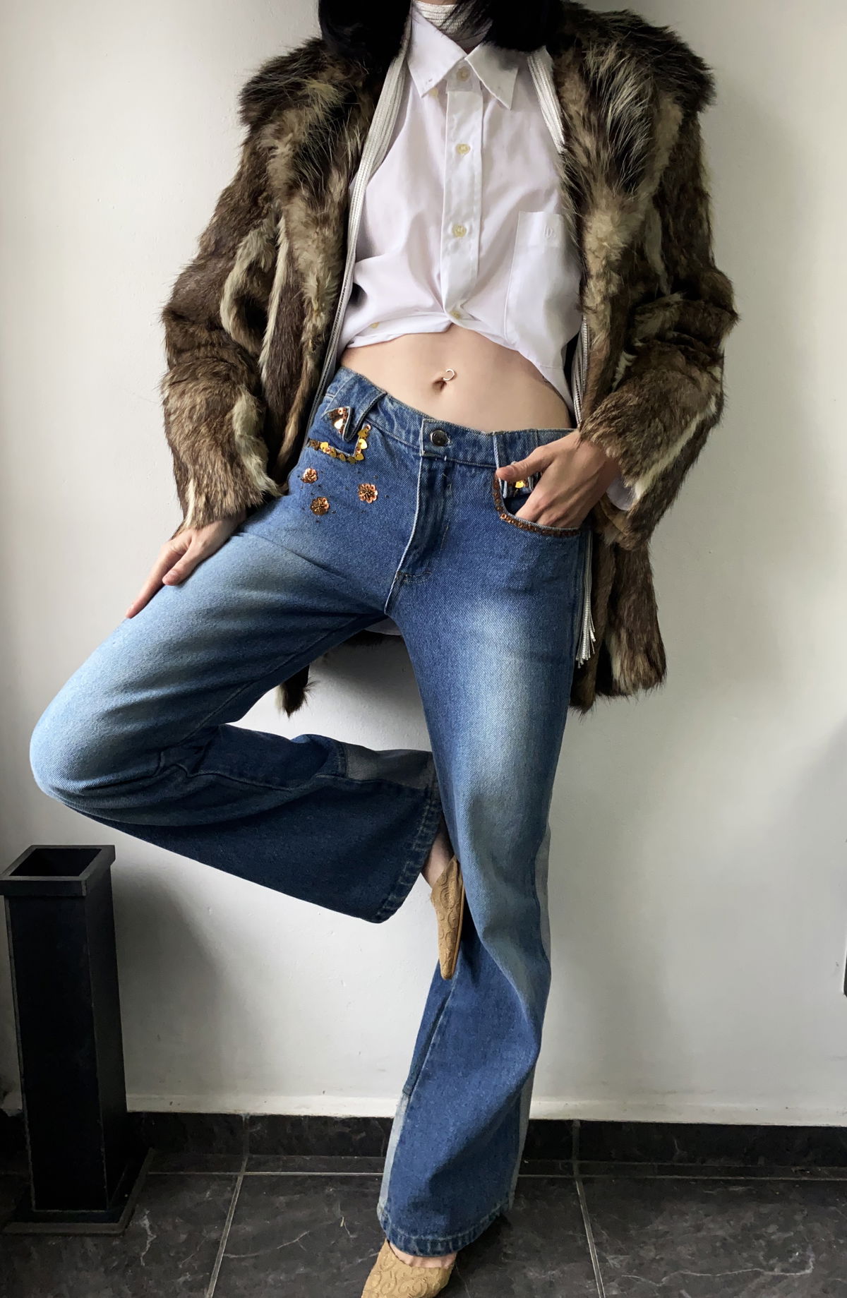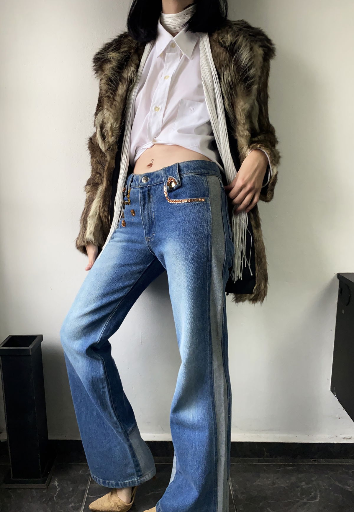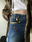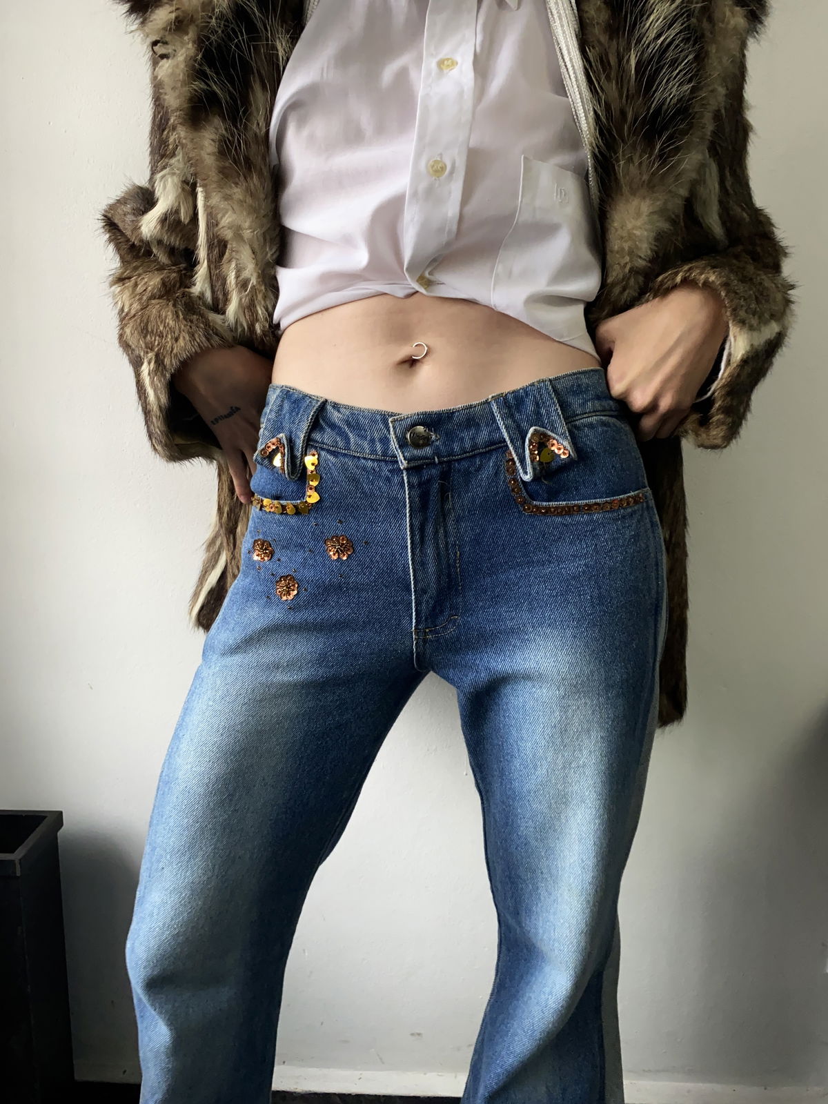 Jean estilo oxford, color celeste oscuro con doble raya en ambos lados en celeste mas claro. Bolsillos reales en la parte delantera y trasera, detalles de mostacillas en color bronce y tiro bajo. Talle 36