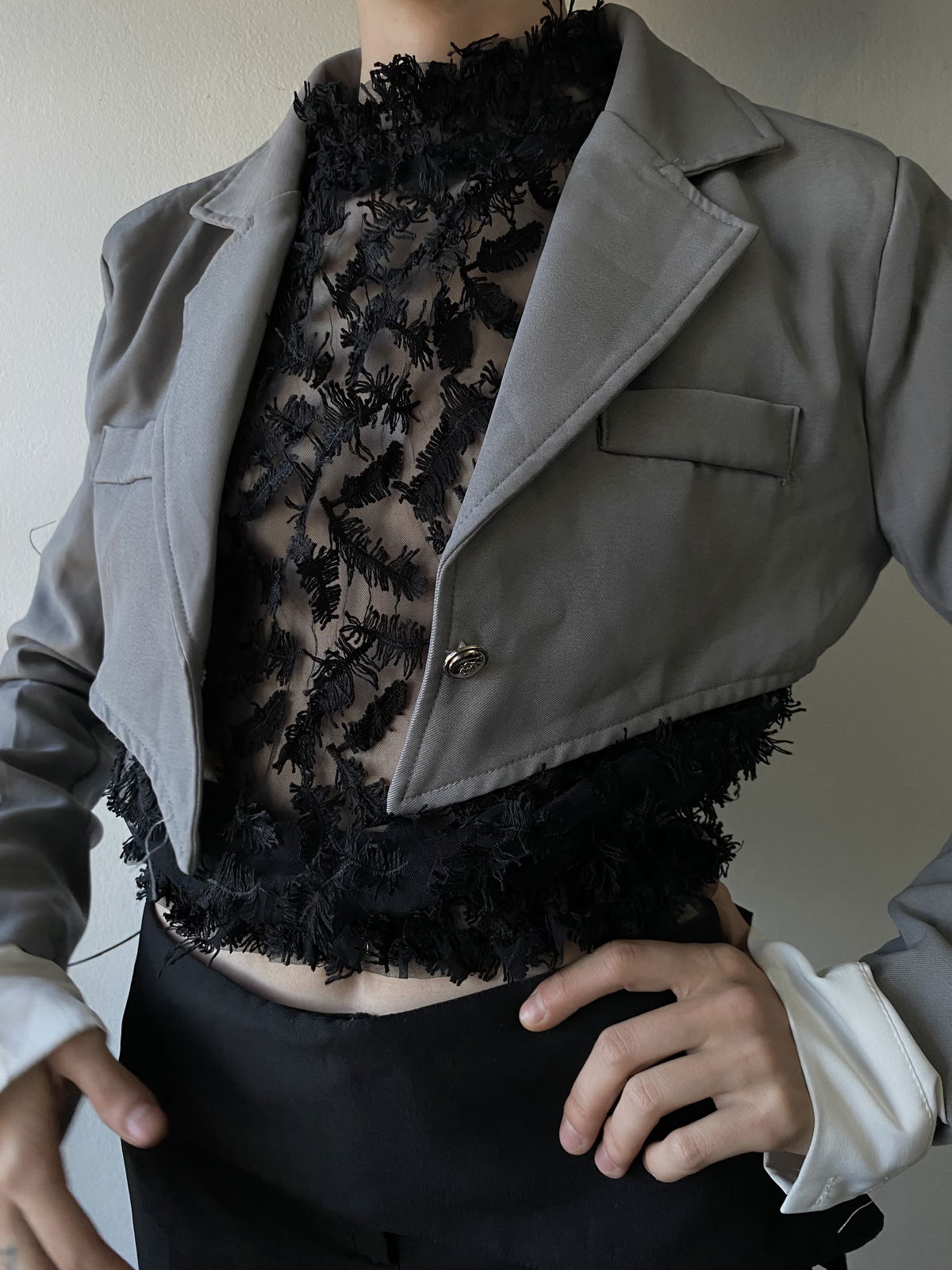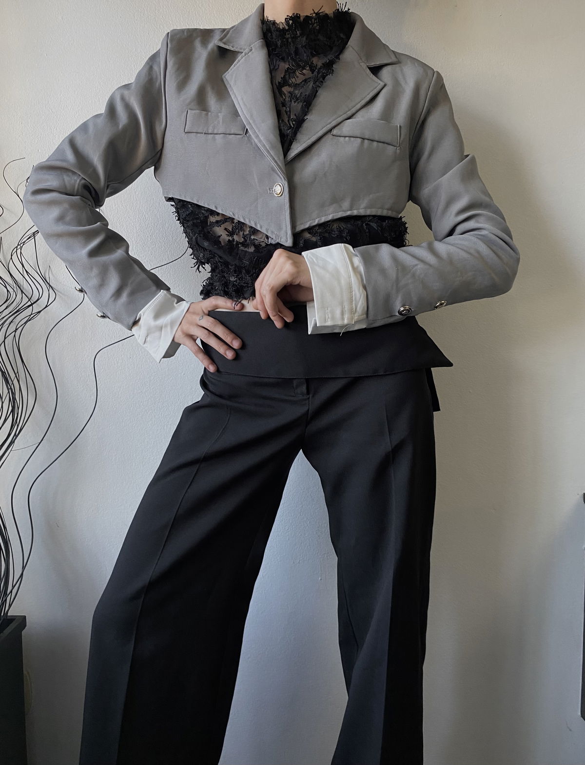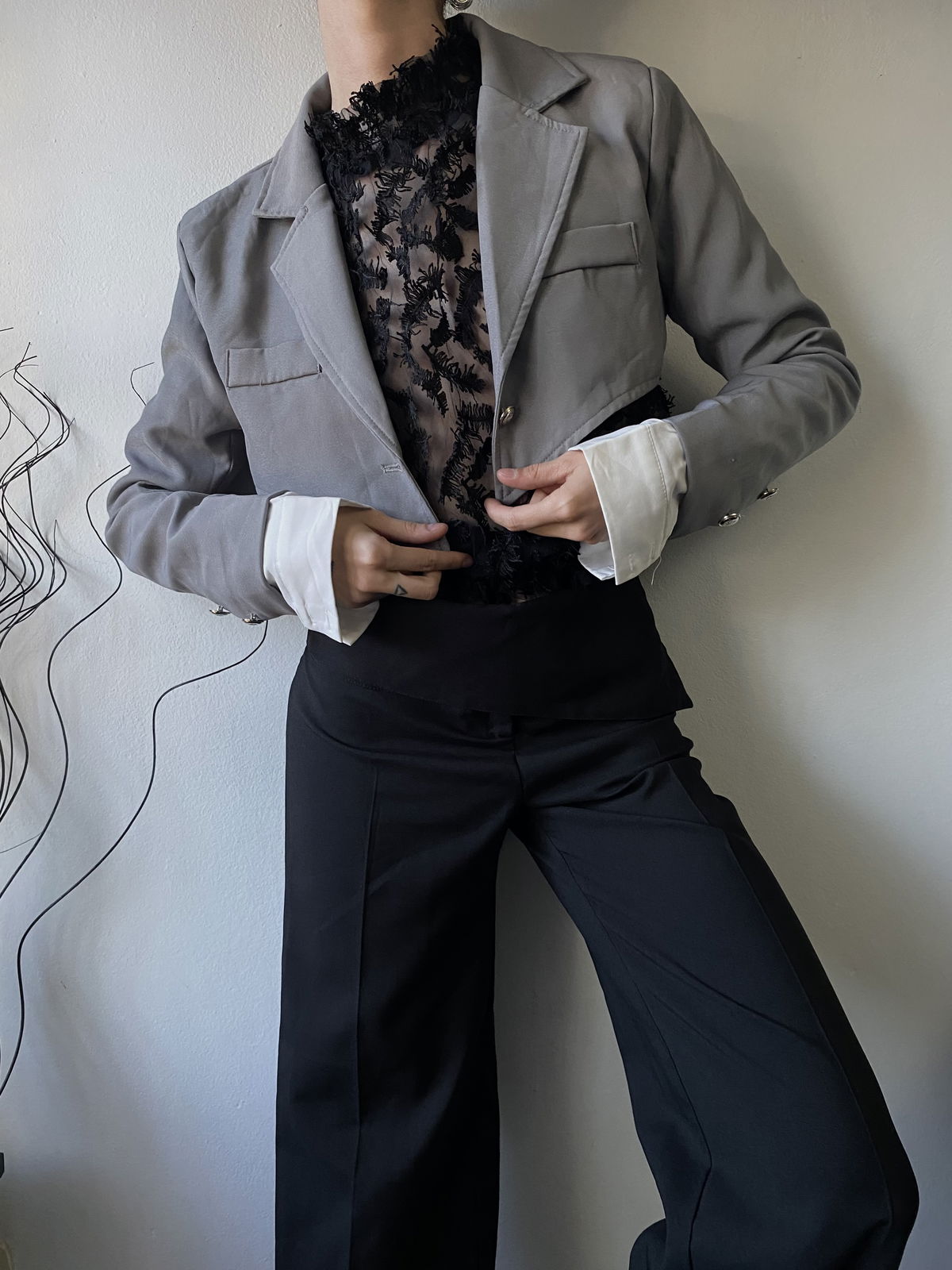 Blazer estilo crop con terminación en punta color gris y en las mangas simula ser una camisa por debajo. Botones plateados para cerrar y en las mangas. Talle S