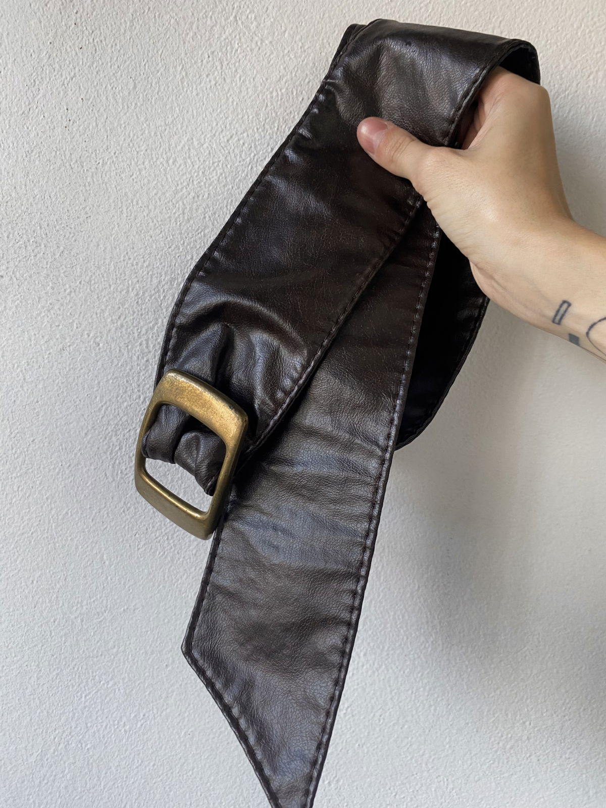 Cinto estilo faja color marrón muy oscuro con hebilla metalica color bronce.