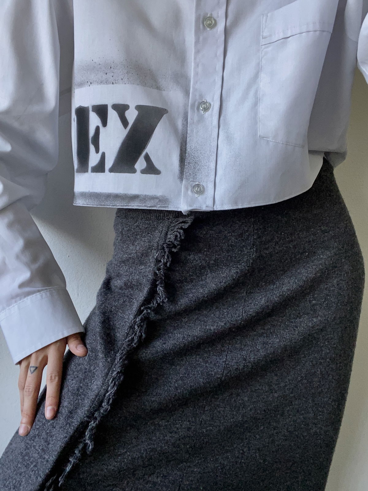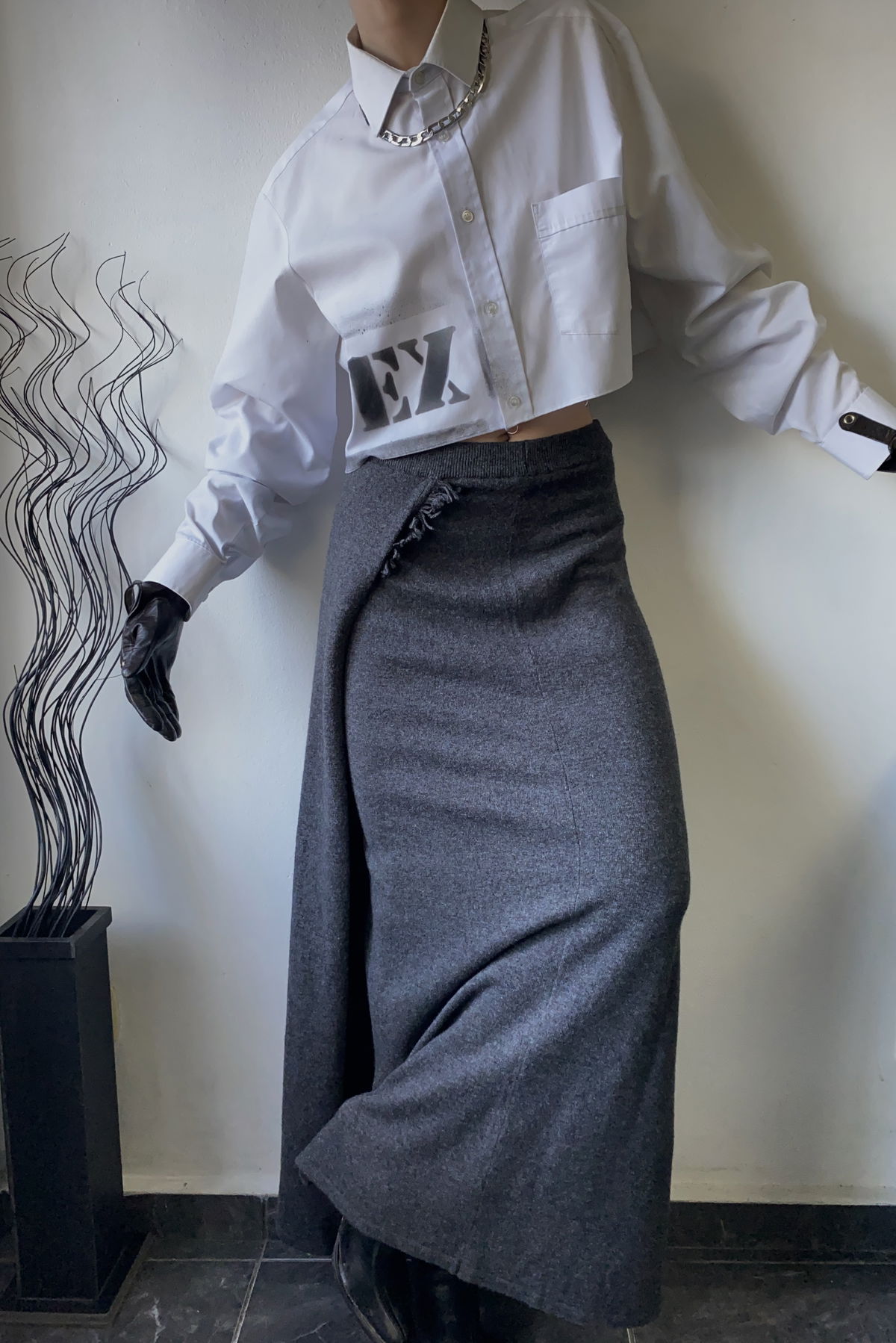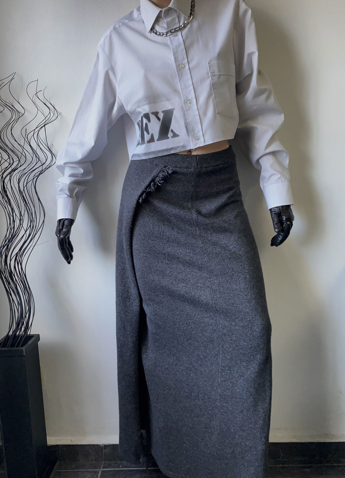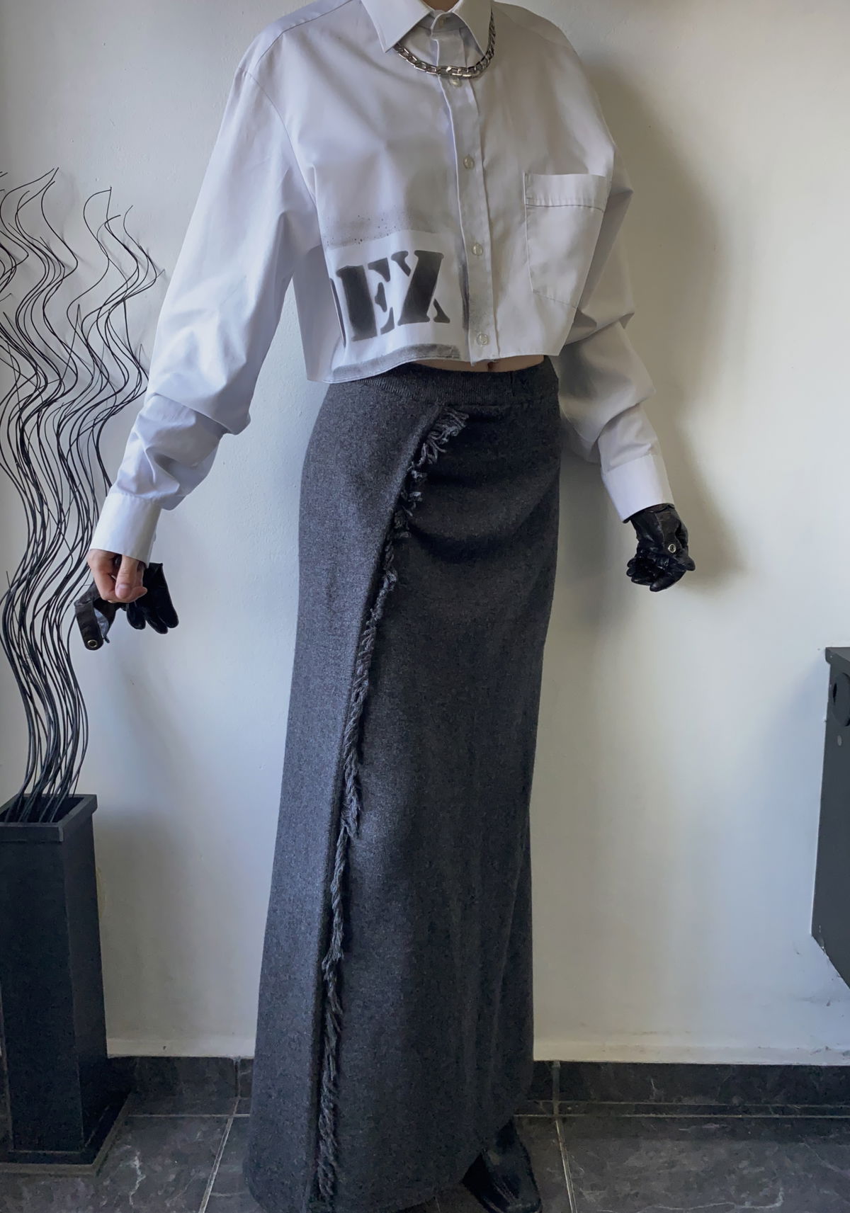 Pollera larga color gris oscuro, de lana con doble solapa para que puedas caminar cómodo. Pequeños flechos en una de las terminaciones, elastizada de cintura. Talle 40