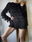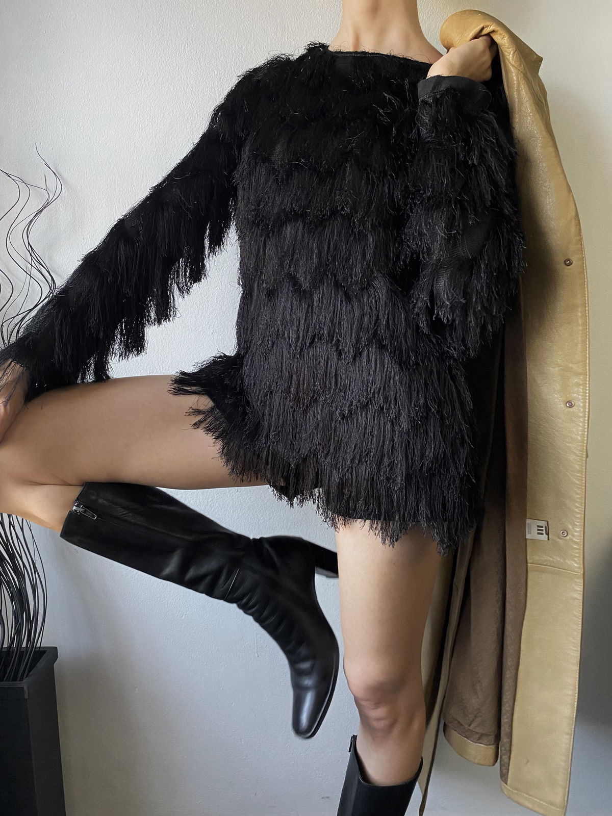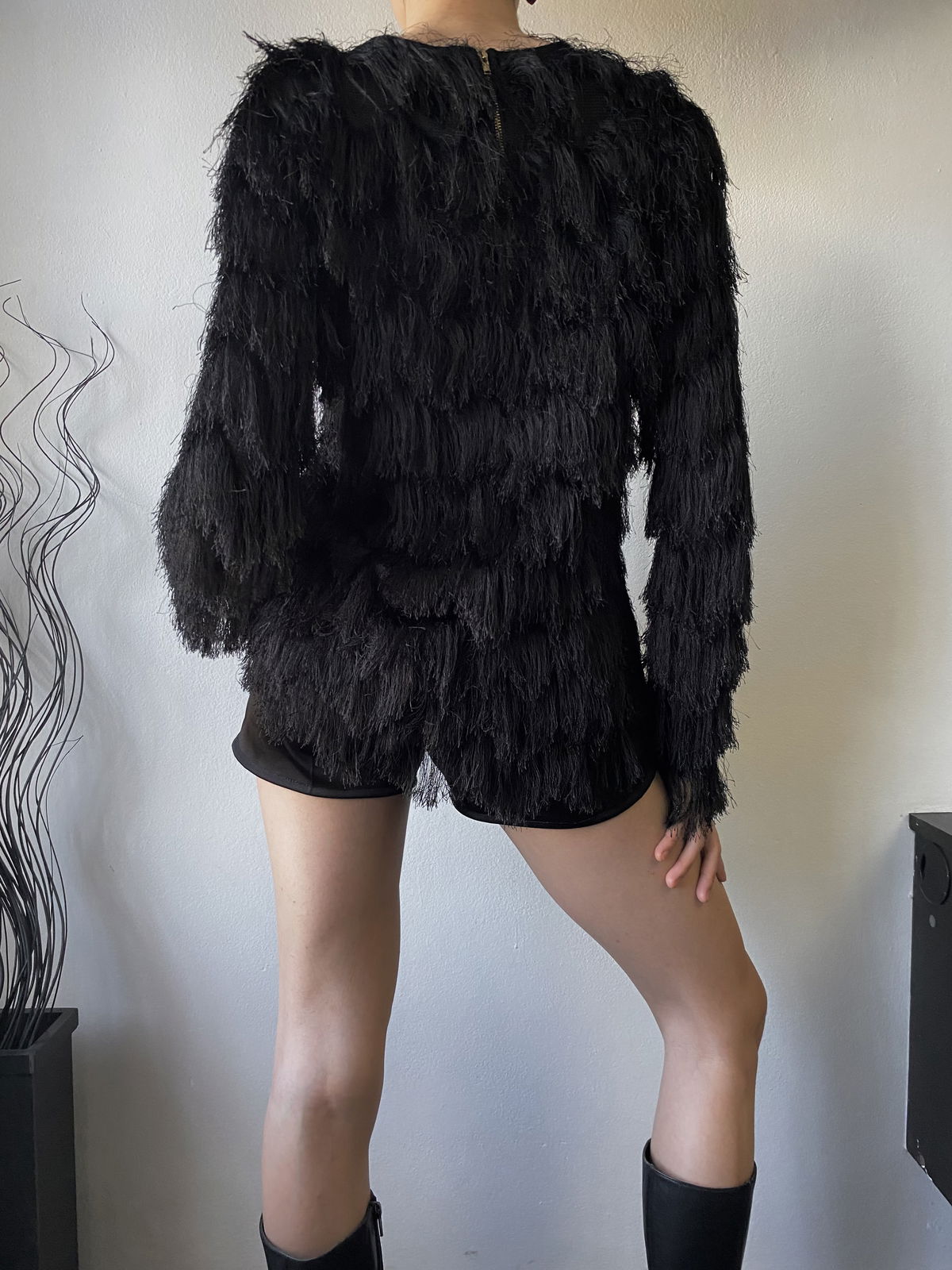 Camiseta color negro toda con pelos estilo plumas, súper suave, no pica y tiene cierre en la espalda para sacar y poner. Talle M